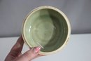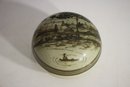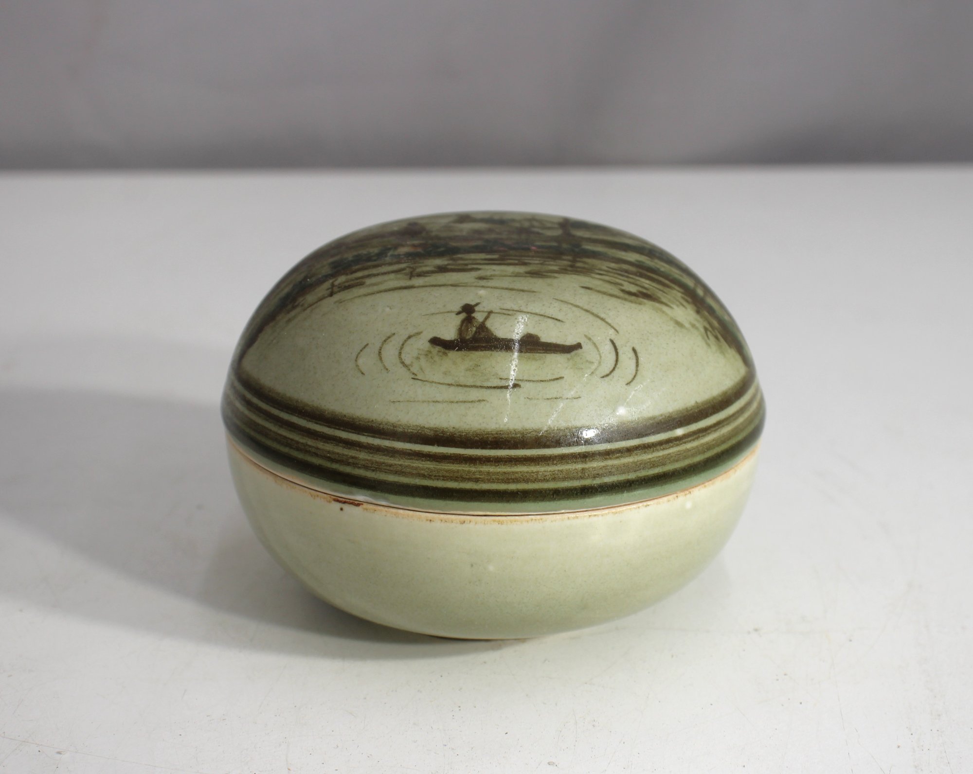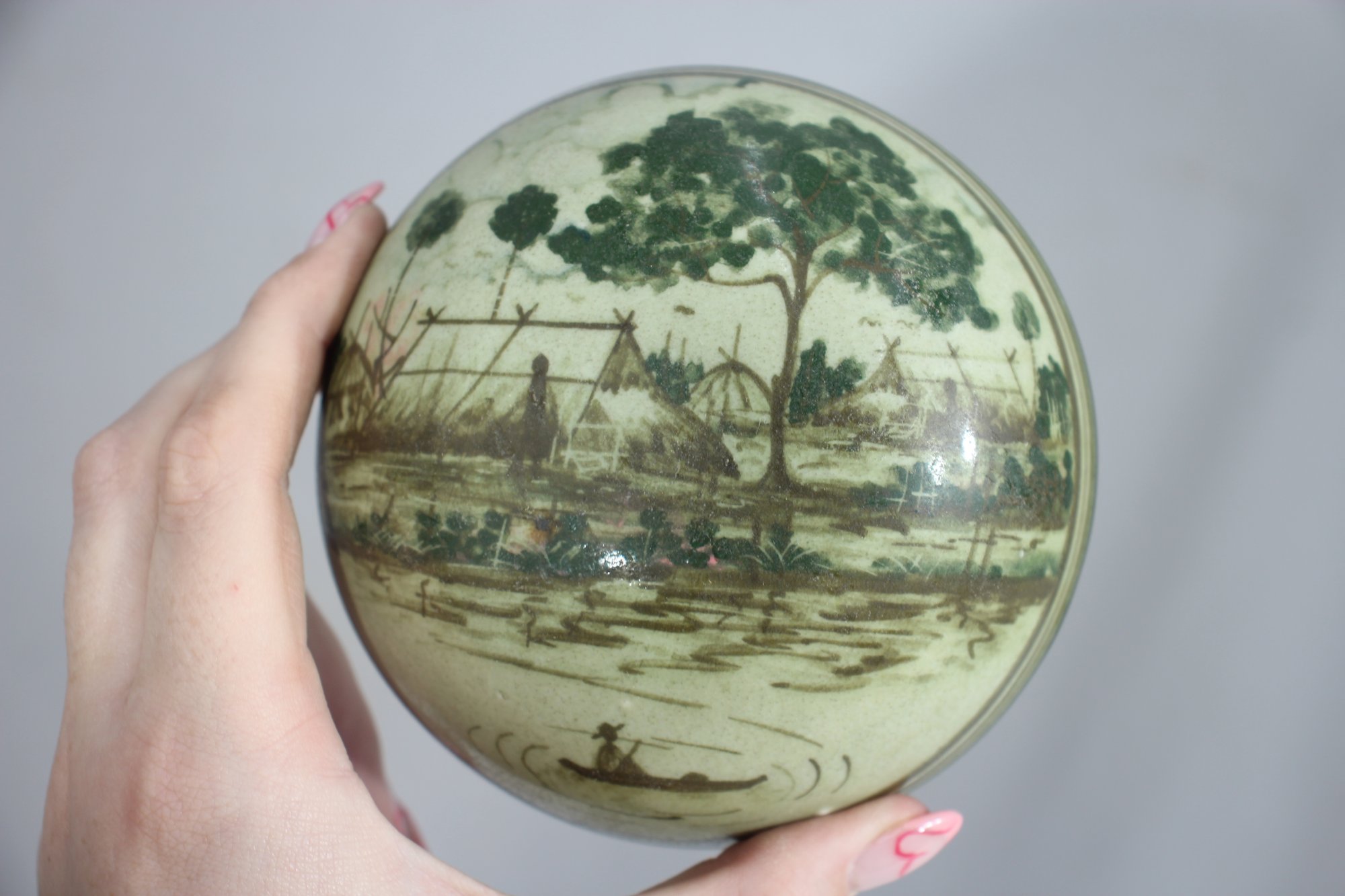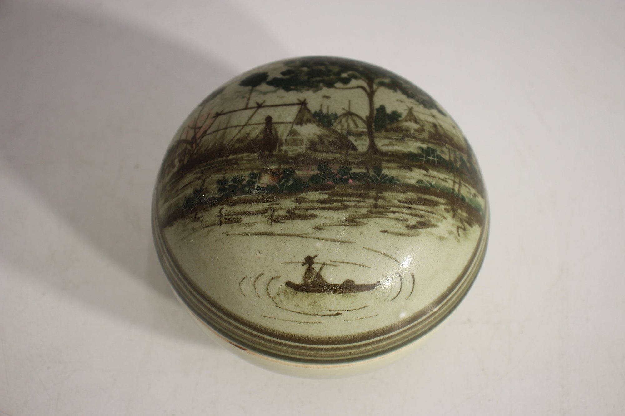 antique lidded ceramic bowl features a beautifully hand-painted village scene, likely inspired by traditional Southeast Asian or Thai pottery. The domed lid showcases a serene riverside setting with a fisherman in a canoe, trees, and thatched huts, evoking a rustic charm.