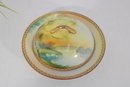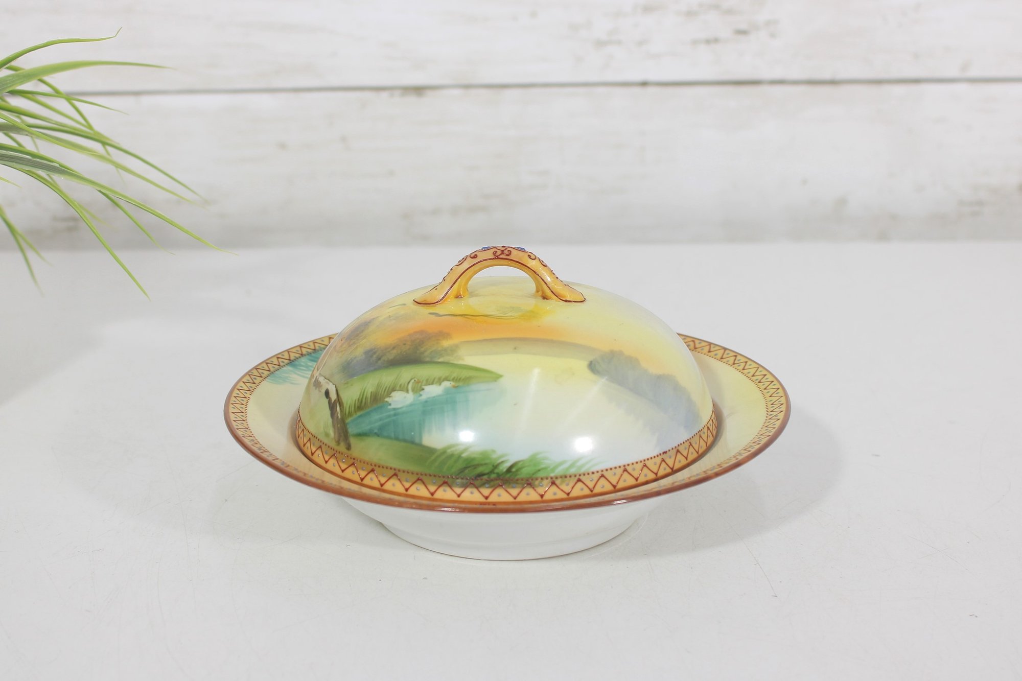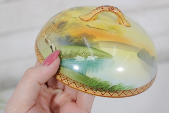 a beautiful antique hand-painted Nippon covered butter dish featuring a scenic pond landscape with ducks. The lid is decorated with a soft pastoral scene including water, trees, and distant hills rendered in warm yellows, greens, and blues, accented by a decorative geometric border.