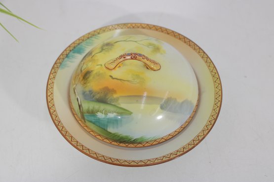 The dish includes its original matching cover with handle, and the artwork is carefully hand painted in the delicate style typical of early 20th century Nippon porcelain. The underside bears the Nippon mark, confirming its origin from the Japanese porcelain export period (circa late 1800s–early 1900s).