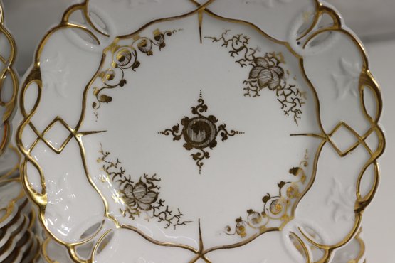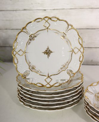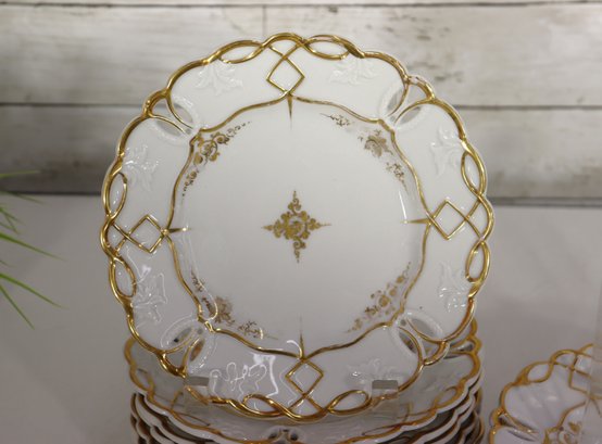 The plates have an elegant scalloped edge with an open lattice ribbon design, all highlighted in brilliant gold trim. The craftsmanship is refined, with raised embossing around the border and a central medallion pattern that adds a touch of Old World sophistication.