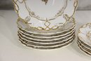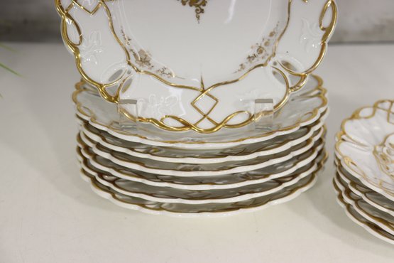 This exquisite matching set of antique porcelain plates features two sizes — eight (8”) and seven and a half (7.5”) — each beautifully hand-painted and richly detailed with 24K gold gilt scrollwork and a delicate floral motif.