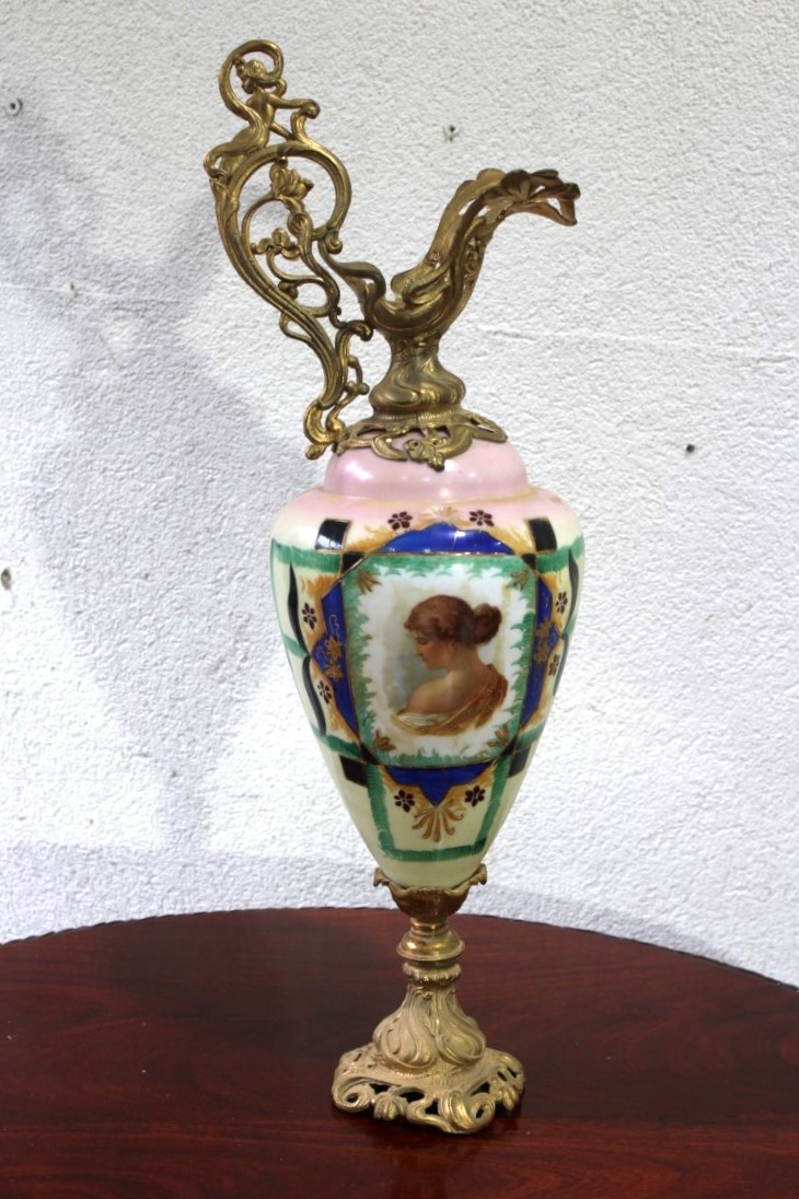 antique porcelain ewer features hand-painted detailing and exquisite gilt brass mounts. The body of the ewer is decorated with vibrant colors, with a central portrait of a classical lady framed by blue, green, and gold accents. The delicately painted scene adds a touch of elegance and artistry to this decorative piece. The porcelain is beautifully contrasted by the ornate gilt brass handle and pedestal base, adding sophistication and an intricate design element.