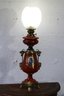 This striking antique oil lamp features a vibrant red porcelain base adorned with ornate gilt brass ormolu and a delicately hand-painted portrait. The elegant lady depicted on the lamp is framed with intricate gold detailing, adding a touch of refinement and artistry. The lamp sits on a gilt brass pedestal with ornamental handles, making it a beautiful display piece.