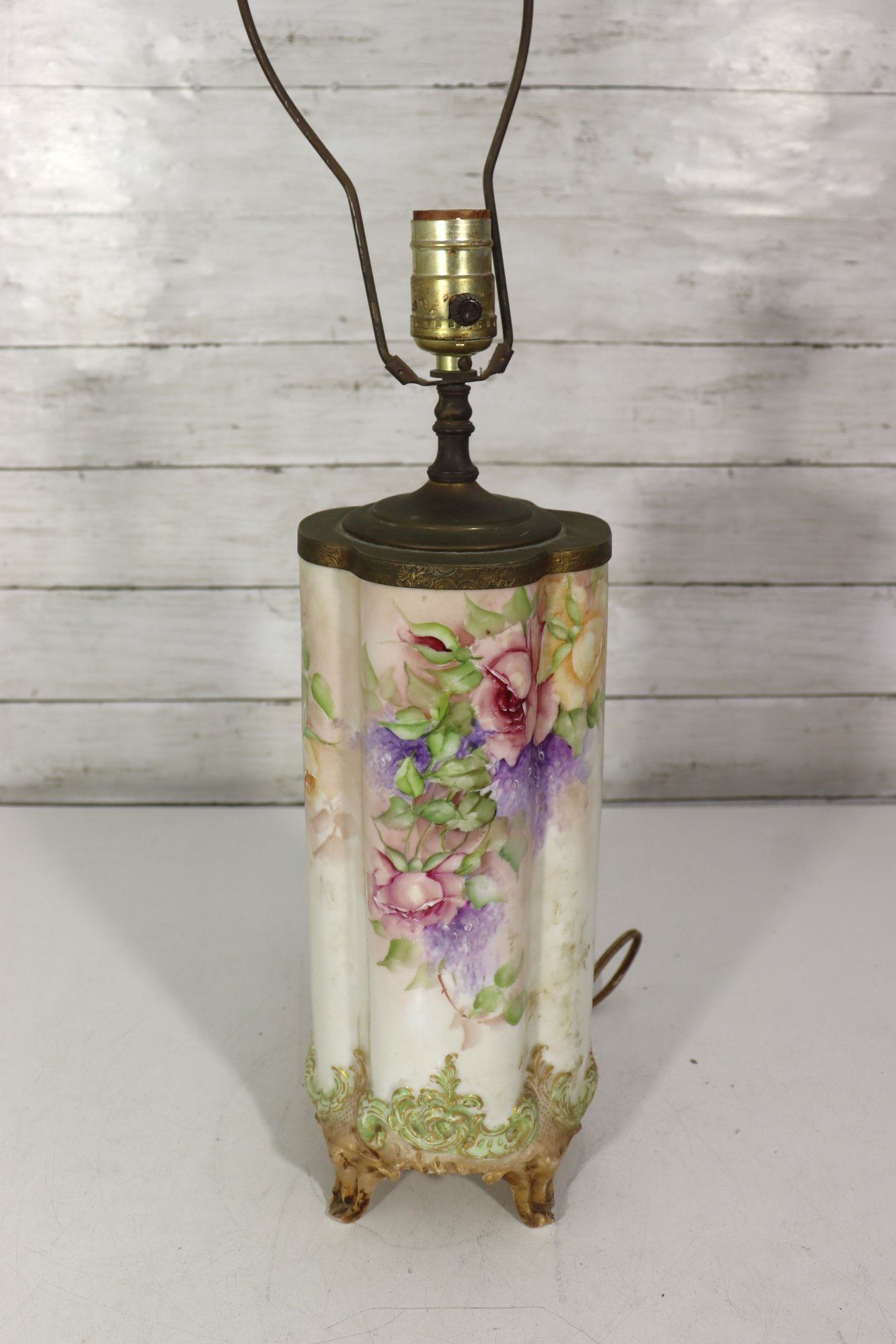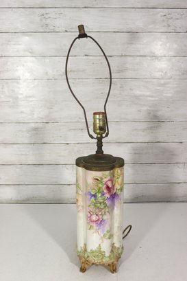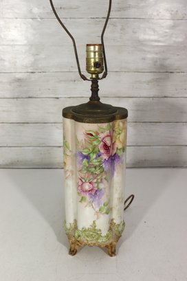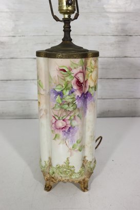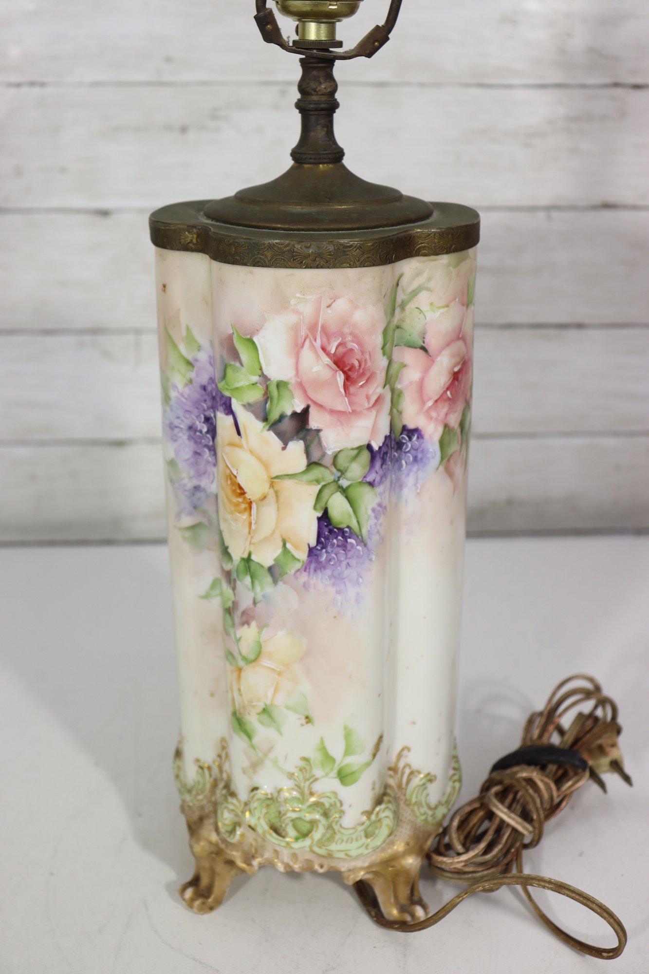 antique hand-painted porcelain table lamp, standing approximately 26 inches high. This elegant lamp features softly colored floral panels on a creamy porcelain body, accented by ornate gilt decoration and raised on decorative gilt feet. The square-form body and fine painting reflect classic late 19th–early 20th century styling.