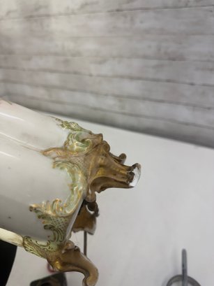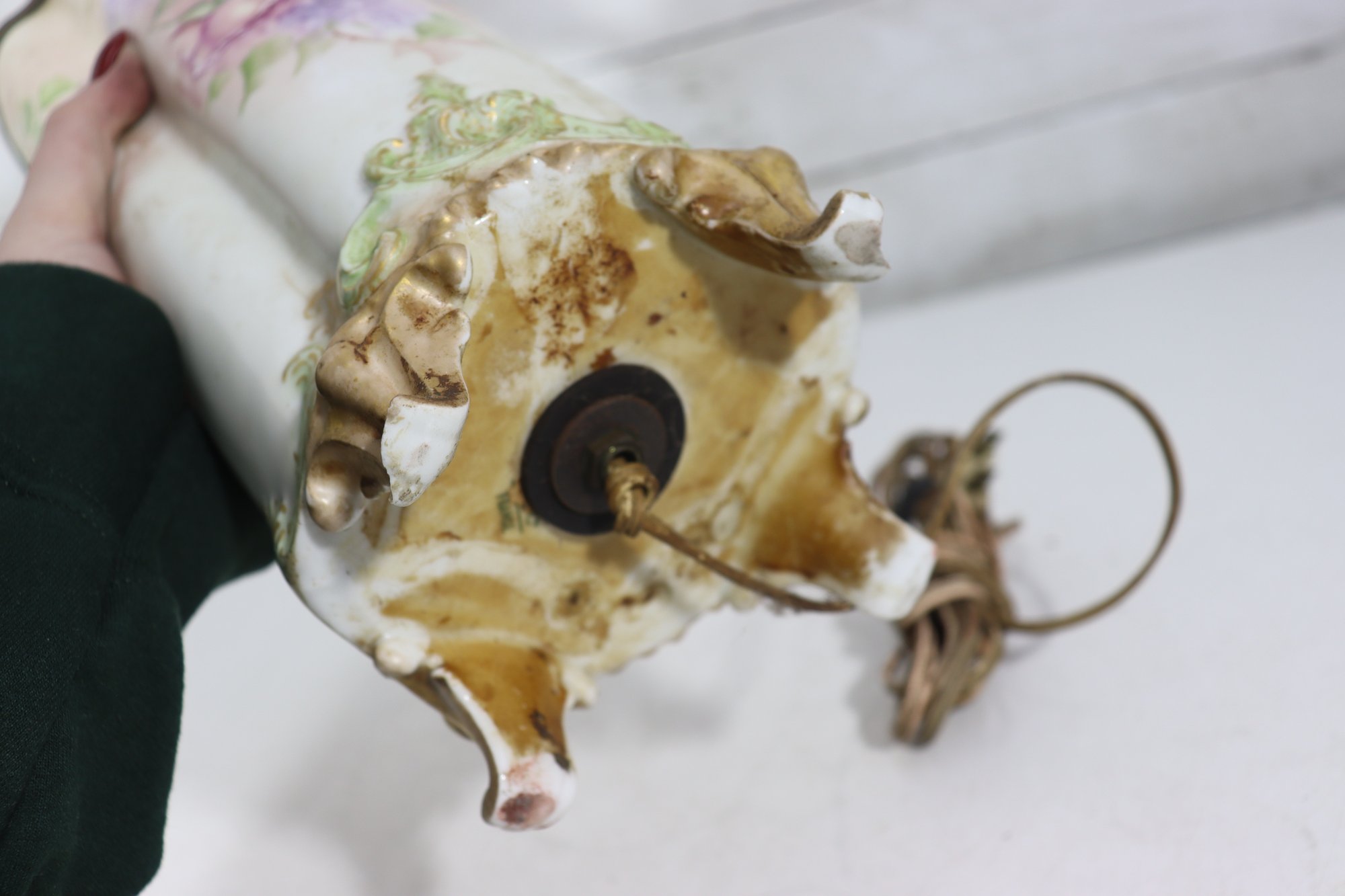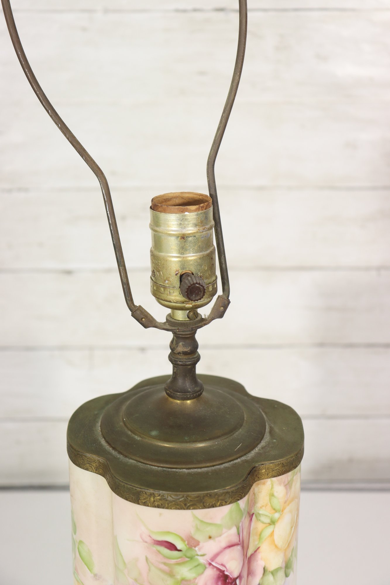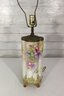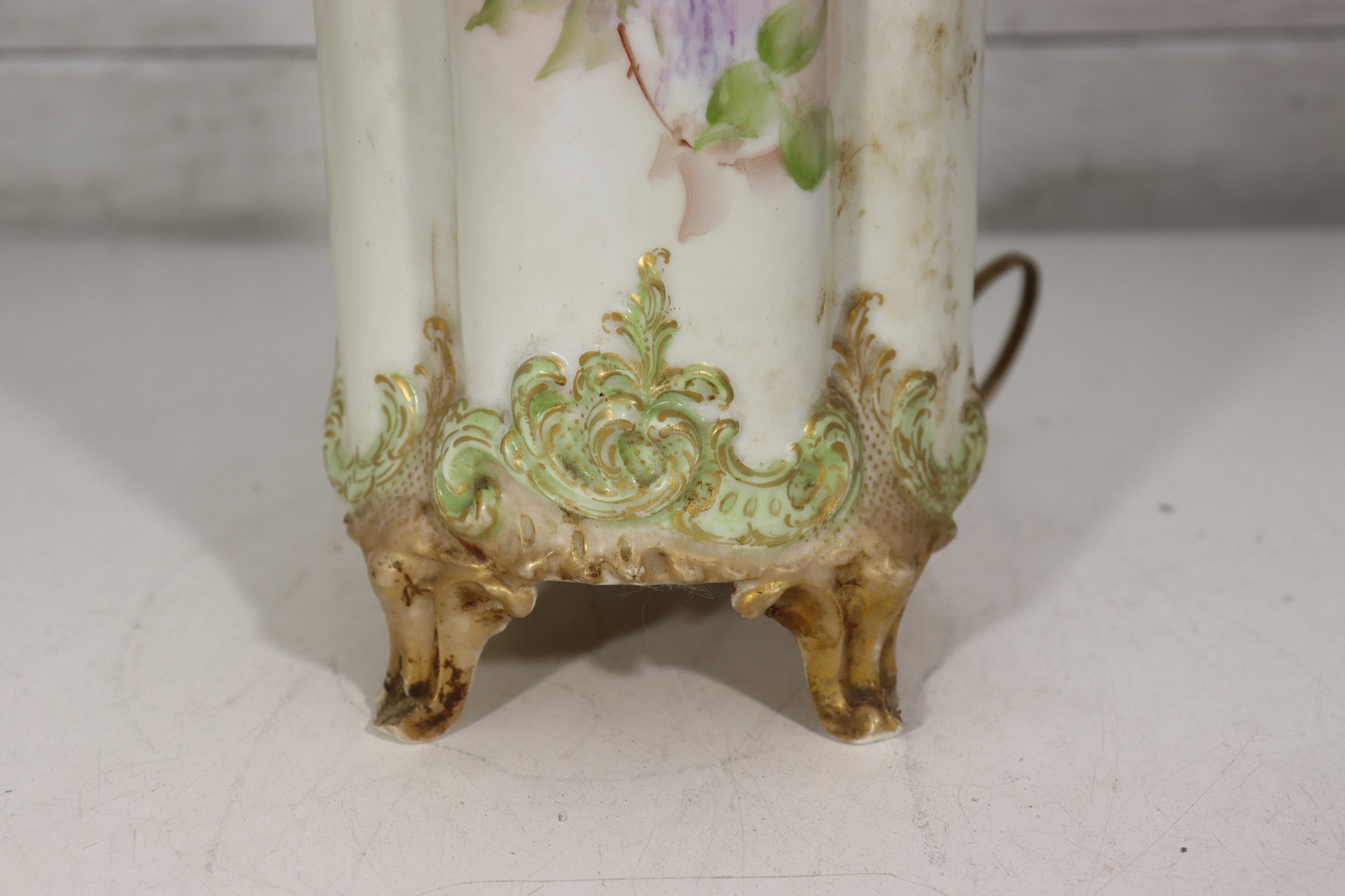 antique hand-painted porcelain table lamp, standing approximately 26 inches high. This elegant lamp features softly colored floral panels on a creamy porcelain body, accented by ornate gilt decoration and raised on decorative gilt feet. The square-form body and fine painting reflect classic late 19th–early 20th century styling.