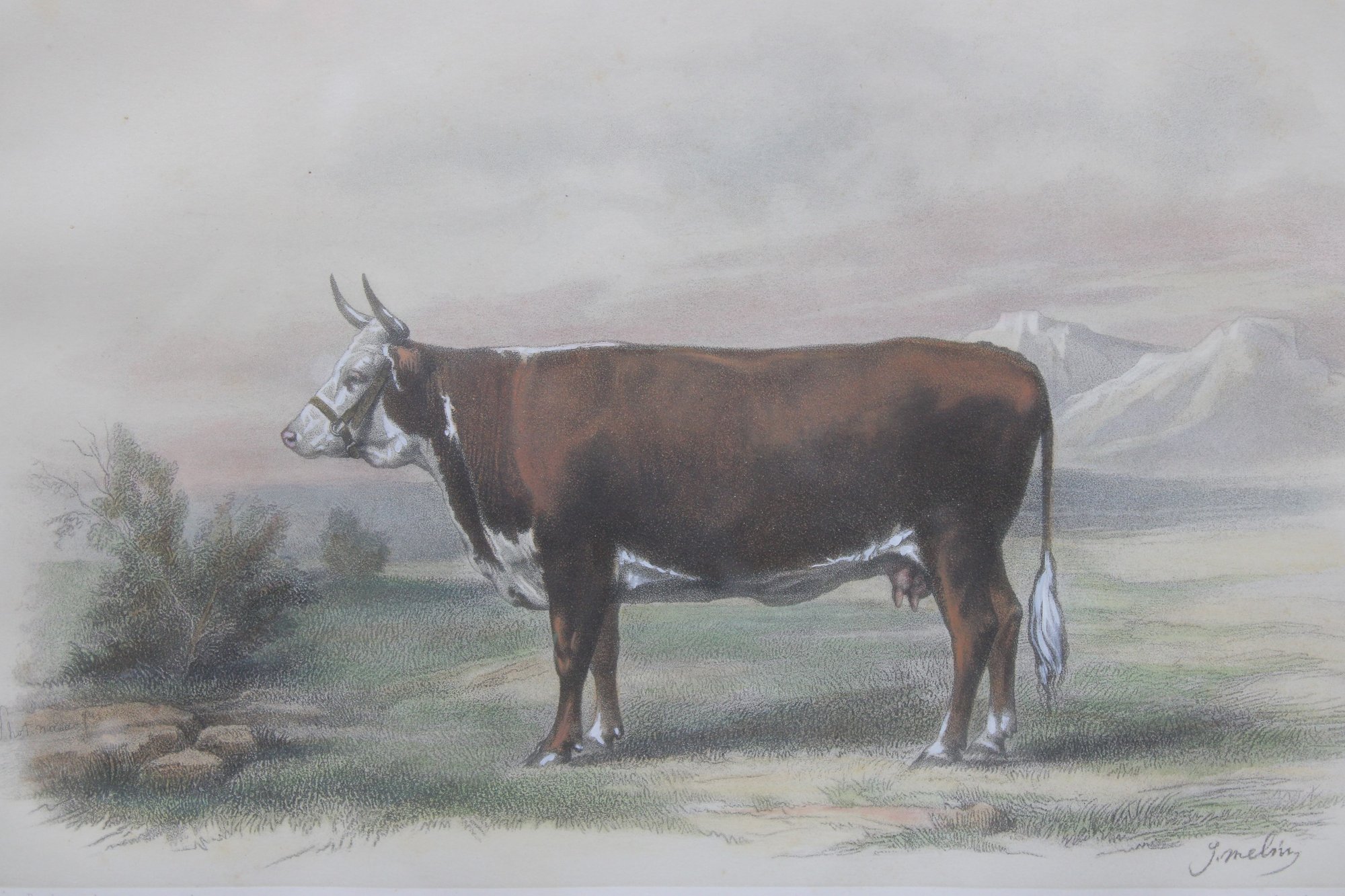 Executed with soft hand-colored tones and fine detail, the composition balances scientific accuracy with a gentle rural atmosphere. The background landscape adds depth without distracting from the subject, making this an appealing piece for both agricultural history enthusiasts and traditional décor collectors.