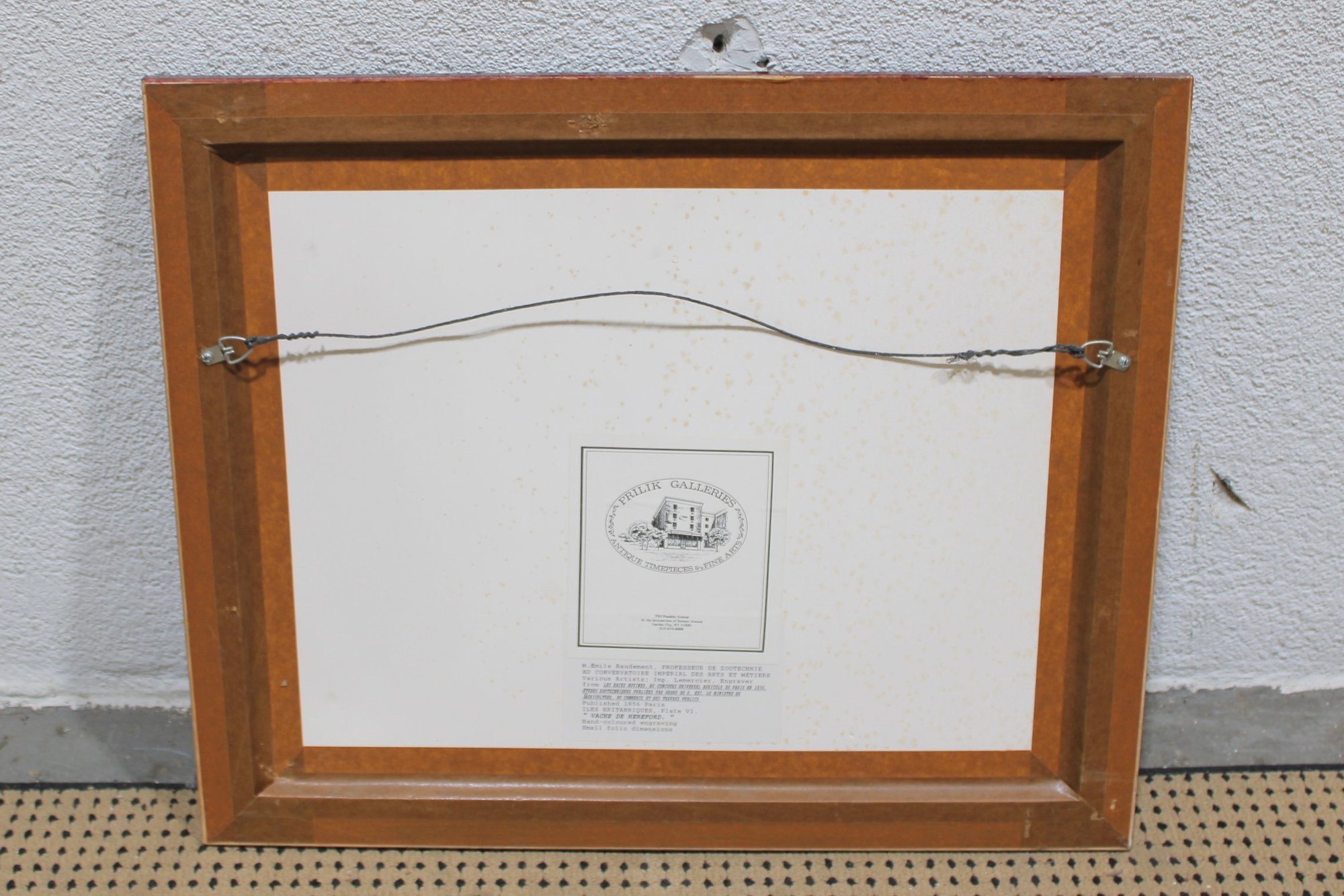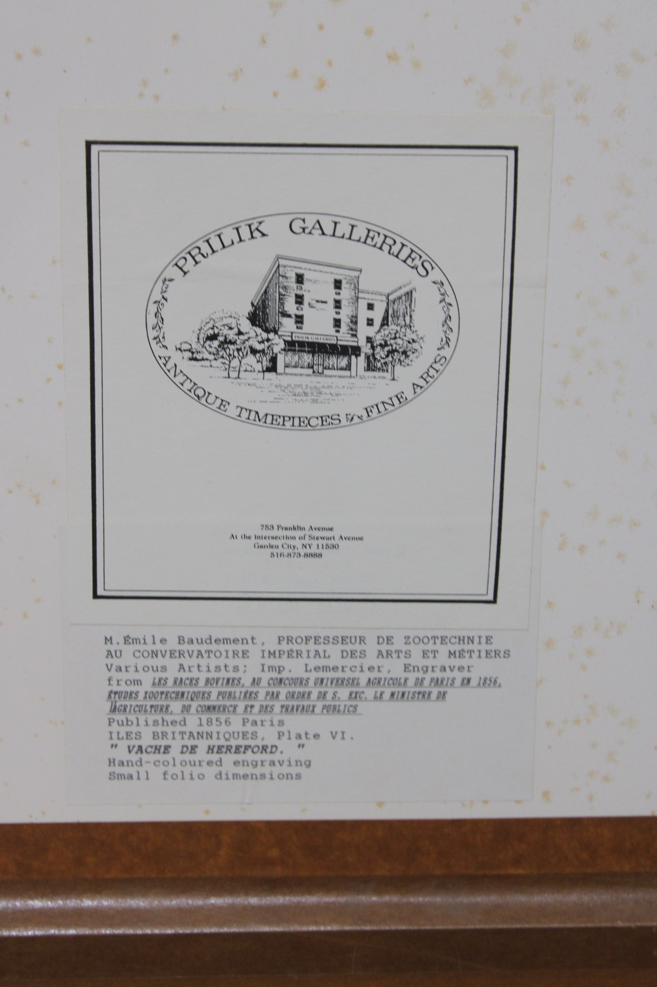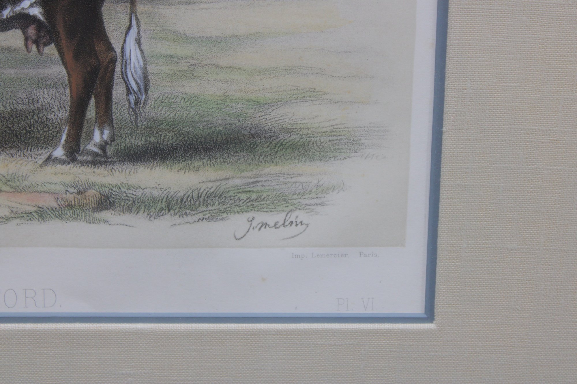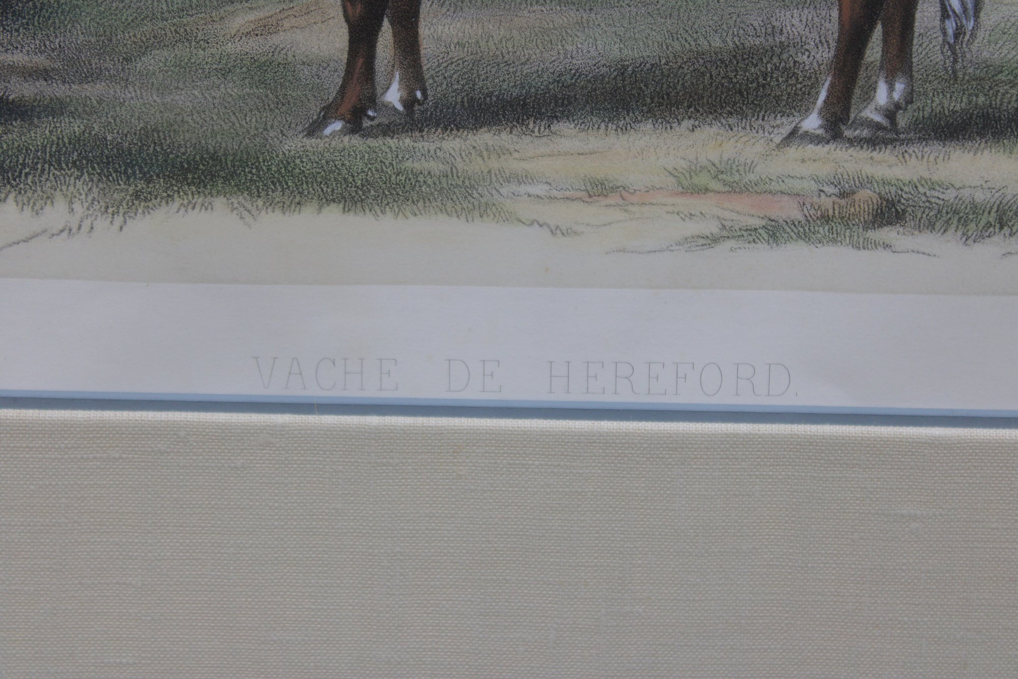 livestock print depicts a Hereford cow standing in a pastoral landscape, rendered with careful attention to anatomy, coat coloration, and natural stance. The image is titled “Vache de Hereford” beneath the illustration, reflecting the period practice of documenting prized agricultural breeds for study and reference.