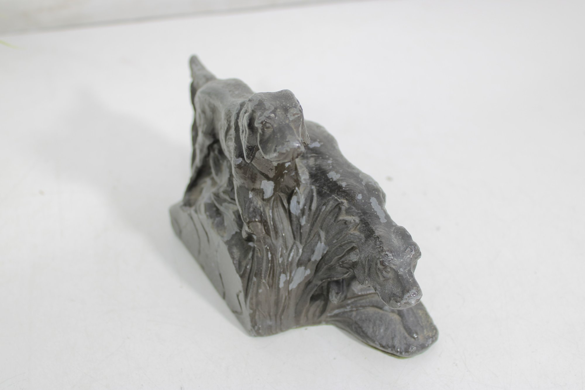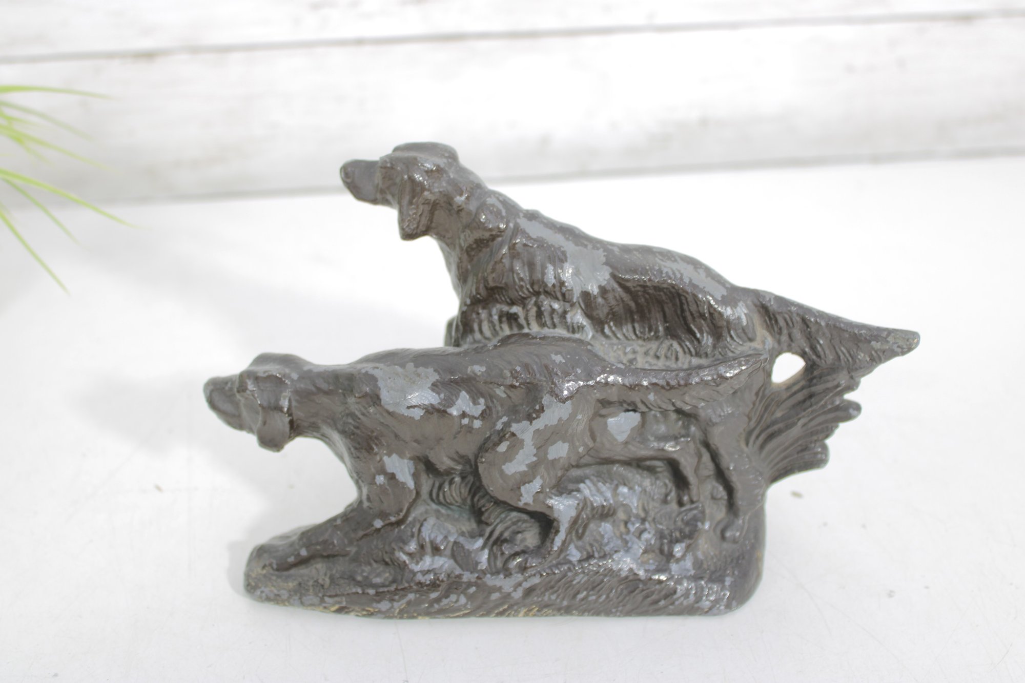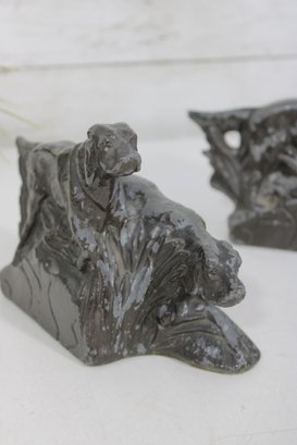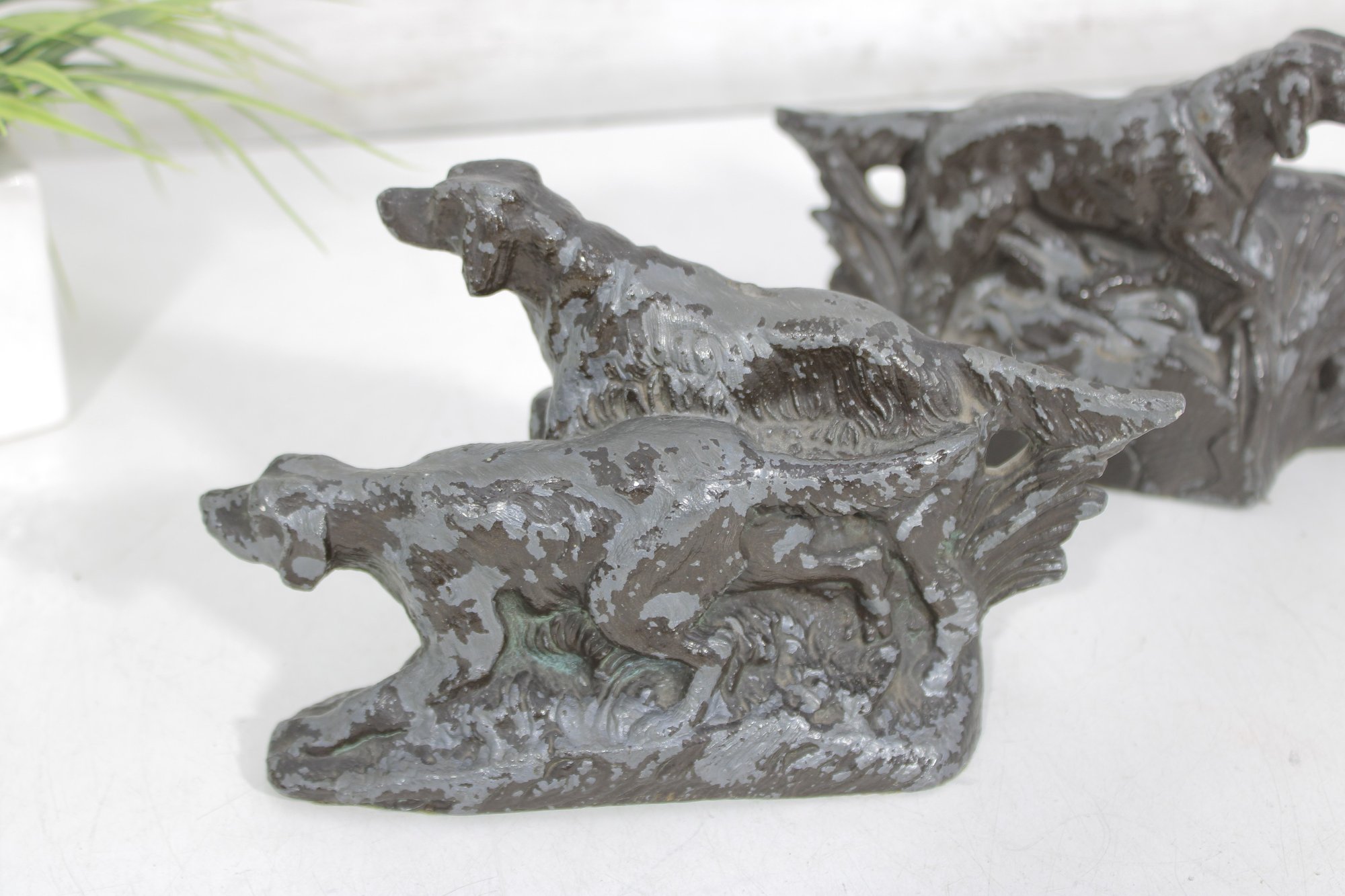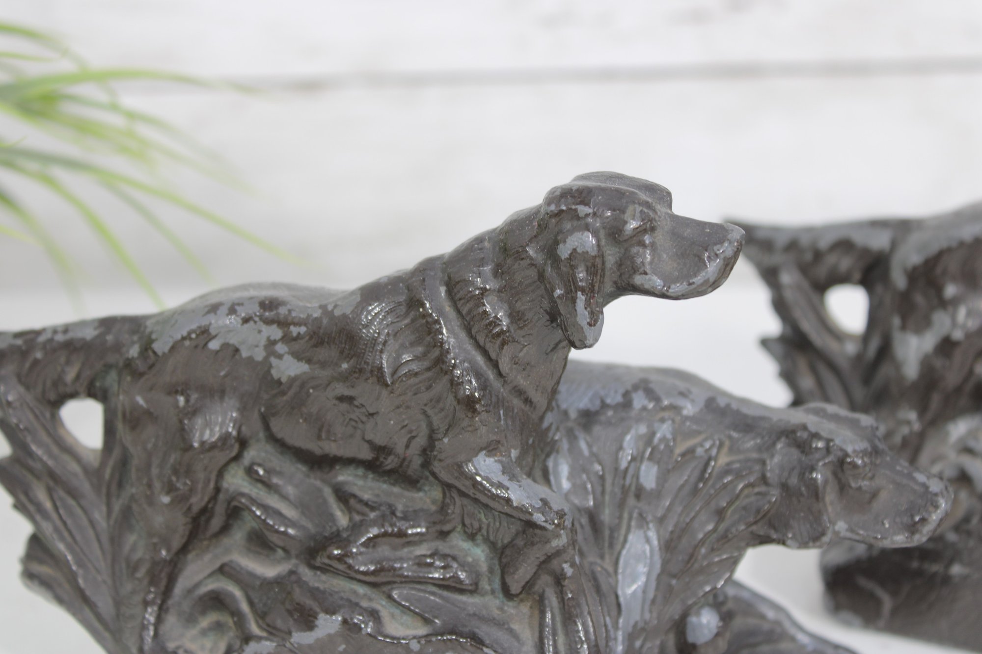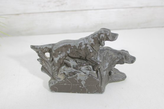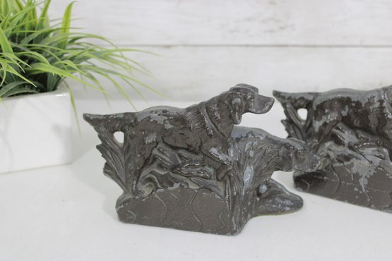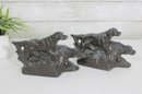 Classic antique hunting dog bookends featuring detailed Irish Setter / Pointer figures in a dynamic field scene. Each bookend depicts two dogs in motion, beautifully sculpted with textured fur and naturalistic poses, set against a stylized landscape backdrop.