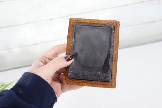 s an antique inkstone, traditionally used for grinding ink in calligraphy and writing. The stone features a shallow recessed surface with smooth wear from use and is accompanied by a fitted wooden case that protects and frames the piece when stored.