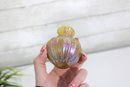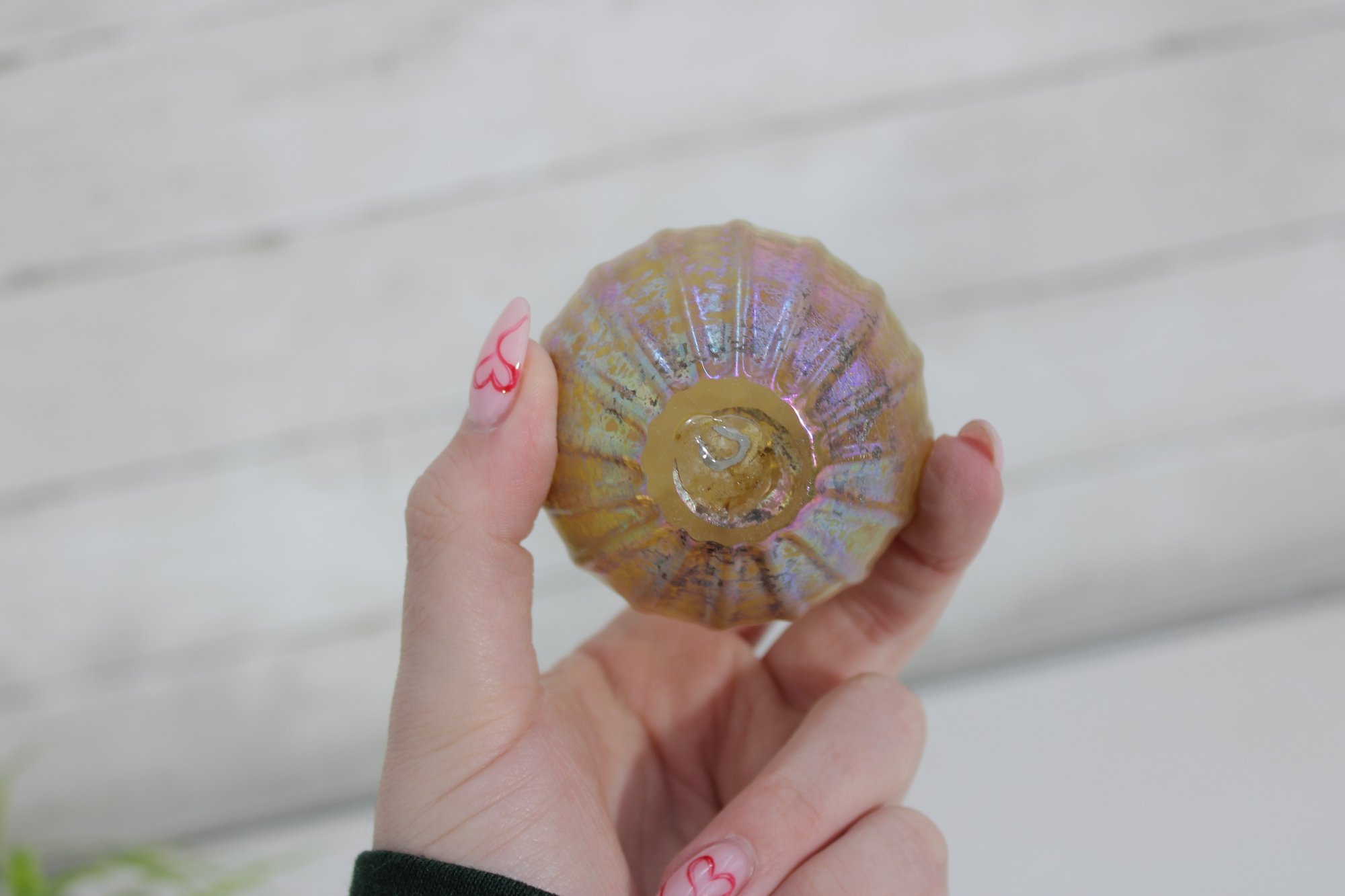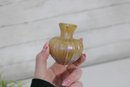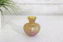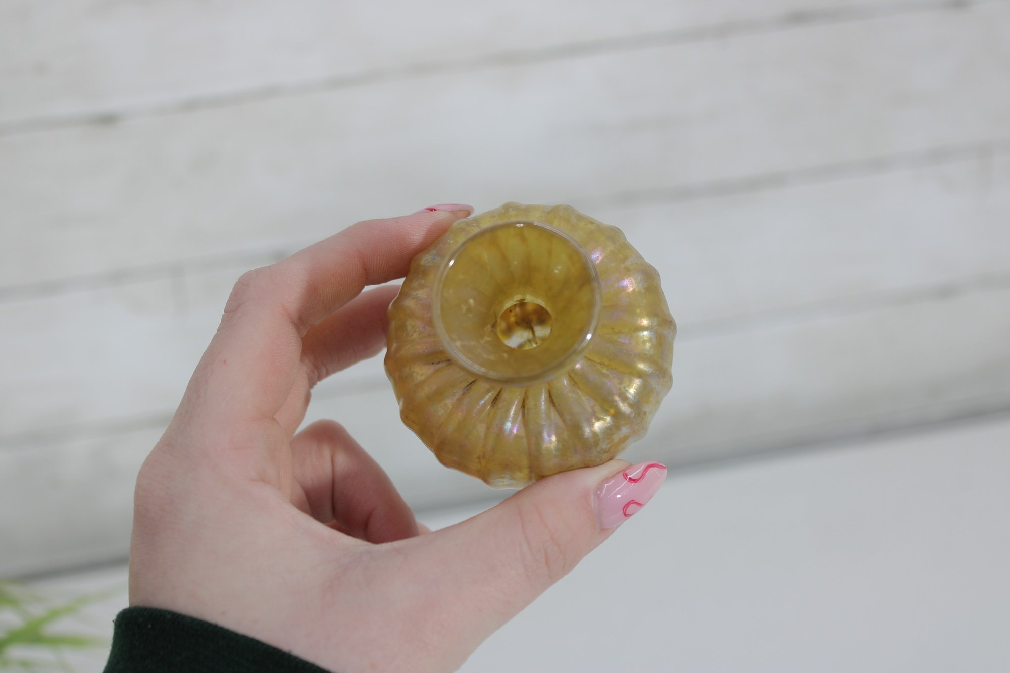 A lovely antique miniature glass vase, featuring a warm amber-gold tone with iridescent highlights that shimmer with pink and lavender hues under the light. The vase has a softly ribbed body and a gently flared neck, giving it elegant Art Nouveau–era character.