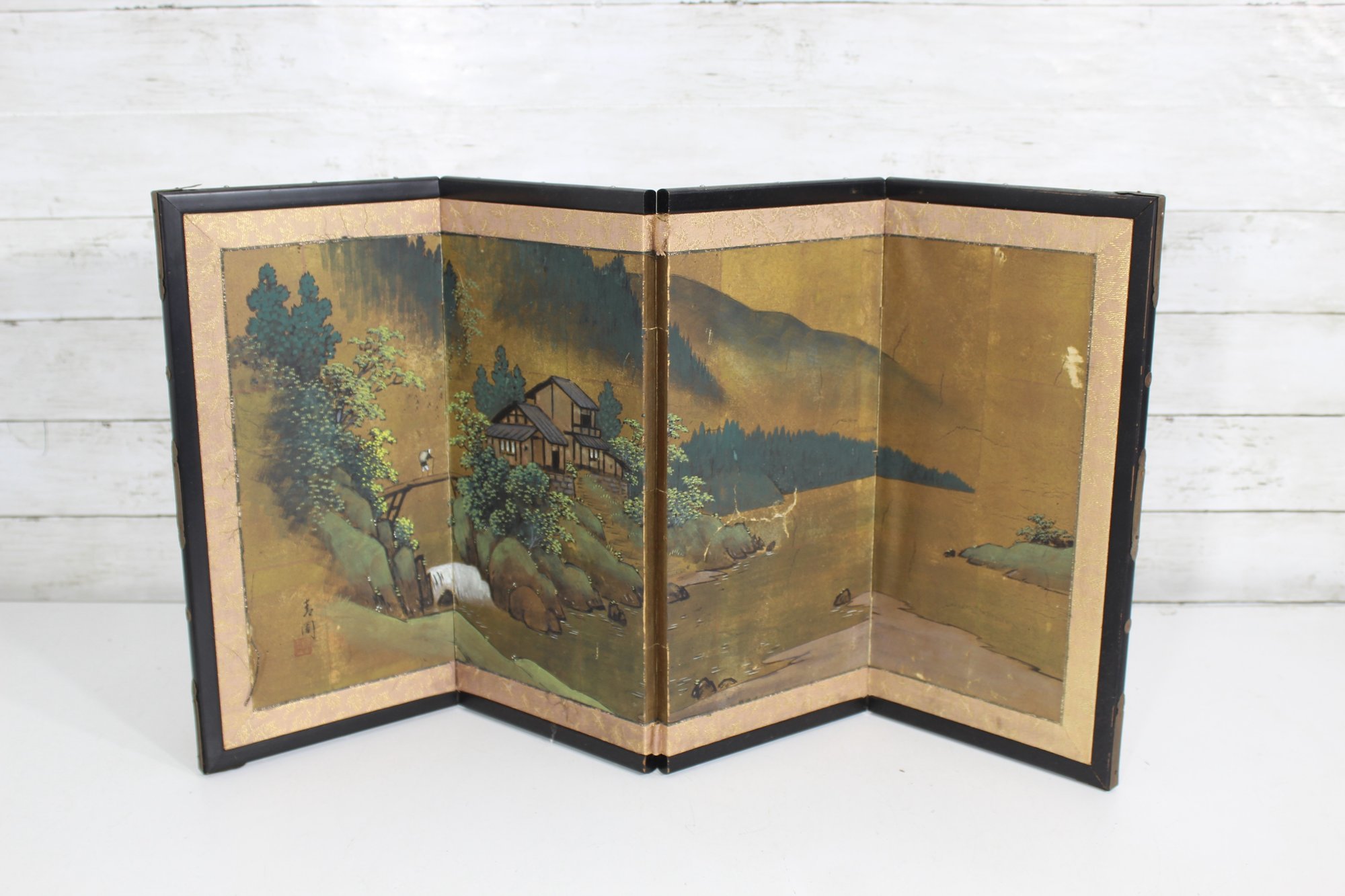 Beautiful antique Japanese four-panel folding table screen, featuring an elegant hand-painted landscape scene depicting a traditional mountain cottage surrounded by trees and a river. The serene composition is rendered in rich tones of green, blue, and gold, with delicate brushwork and a soft aged patina.