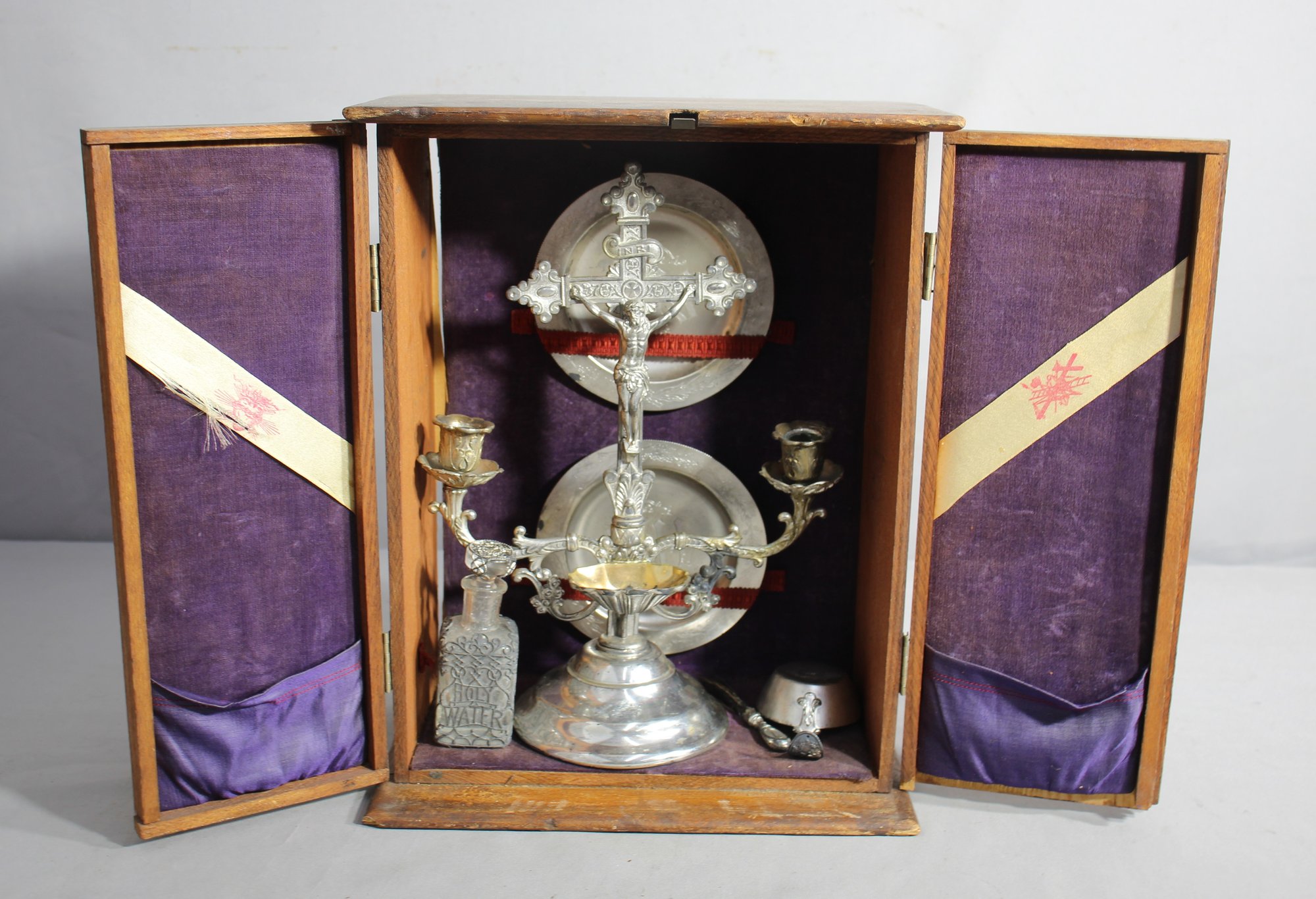 The interior is lined with purple fabric, symbolizing royalty and suffering in the Christian liturgy, often associated with Lent or Advent. Included within are items typically used for the Eucharist or communion as part of the Last Rites ceremony for the sick and dying. The centerpiece is an ornate silver-plated candelabra, flanked by a holy water bottle and a small bell. The back panel features a cross and an IHS Christogram embossed on a radiant plate, which was traditionally used to hold the Eucharist host.