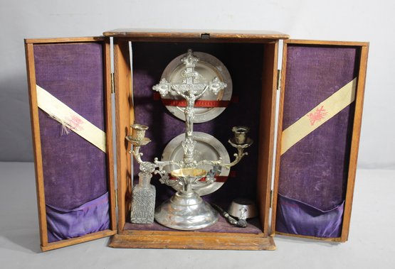Presenting a fascinating piece of Christian religious history, this antique Last Rites Call Box, also known as a Viaticum, is a testament to the practices Crafted from rich wood, this hinged cabinet opens to reveal a home altar, complete with silver-plated religious icons and accessories.