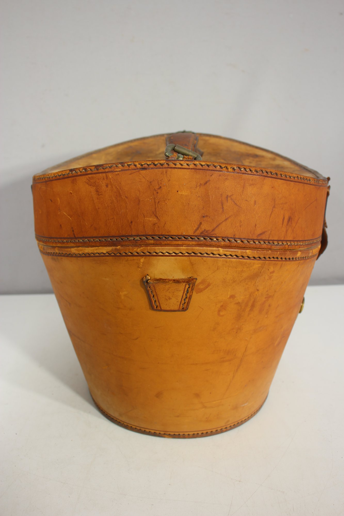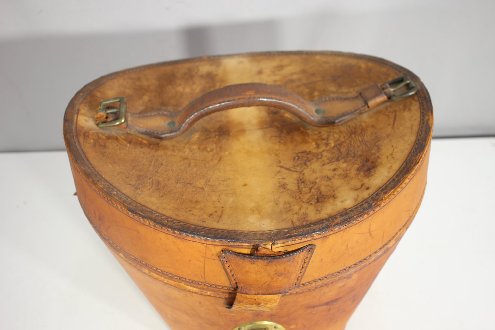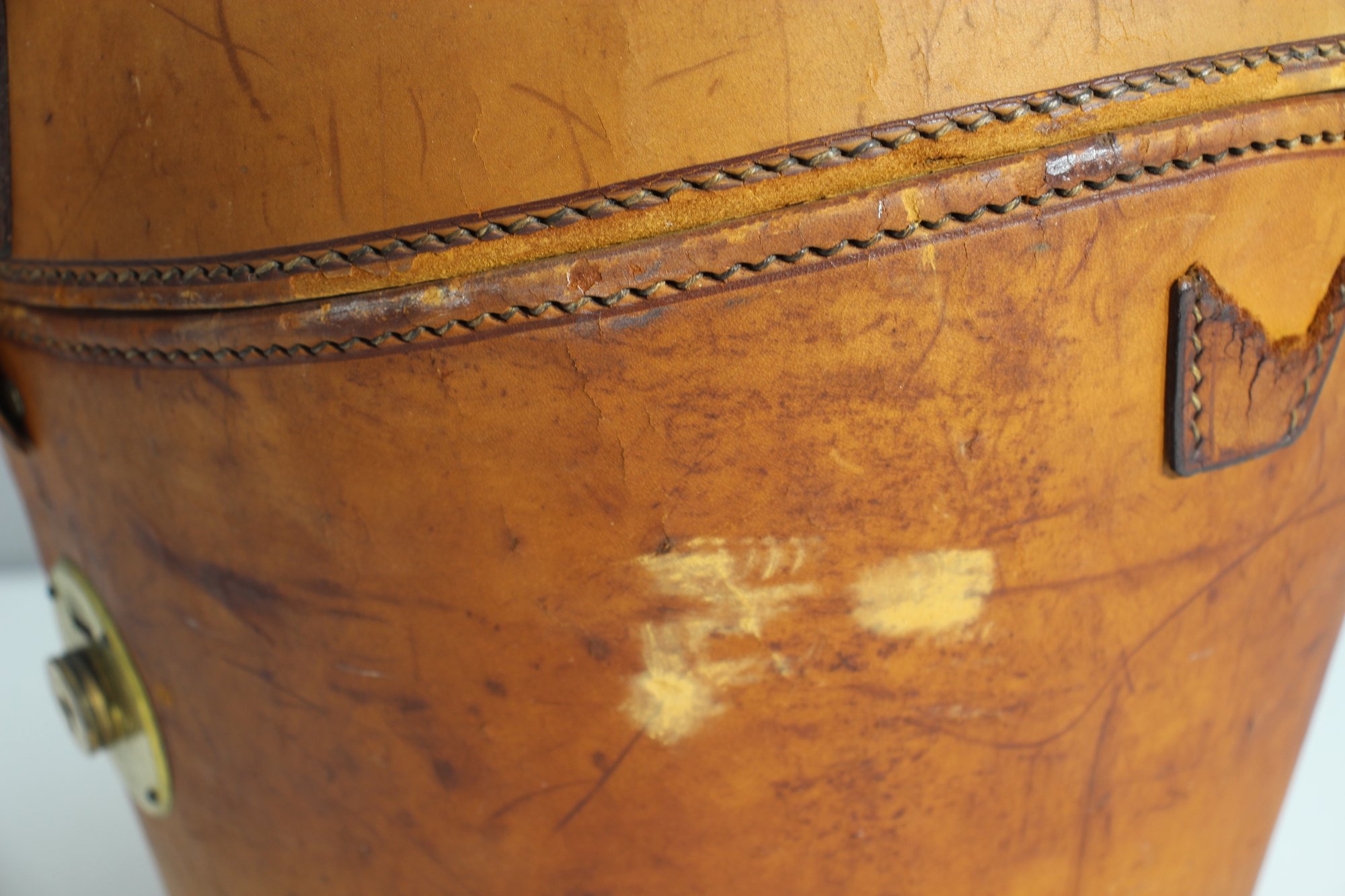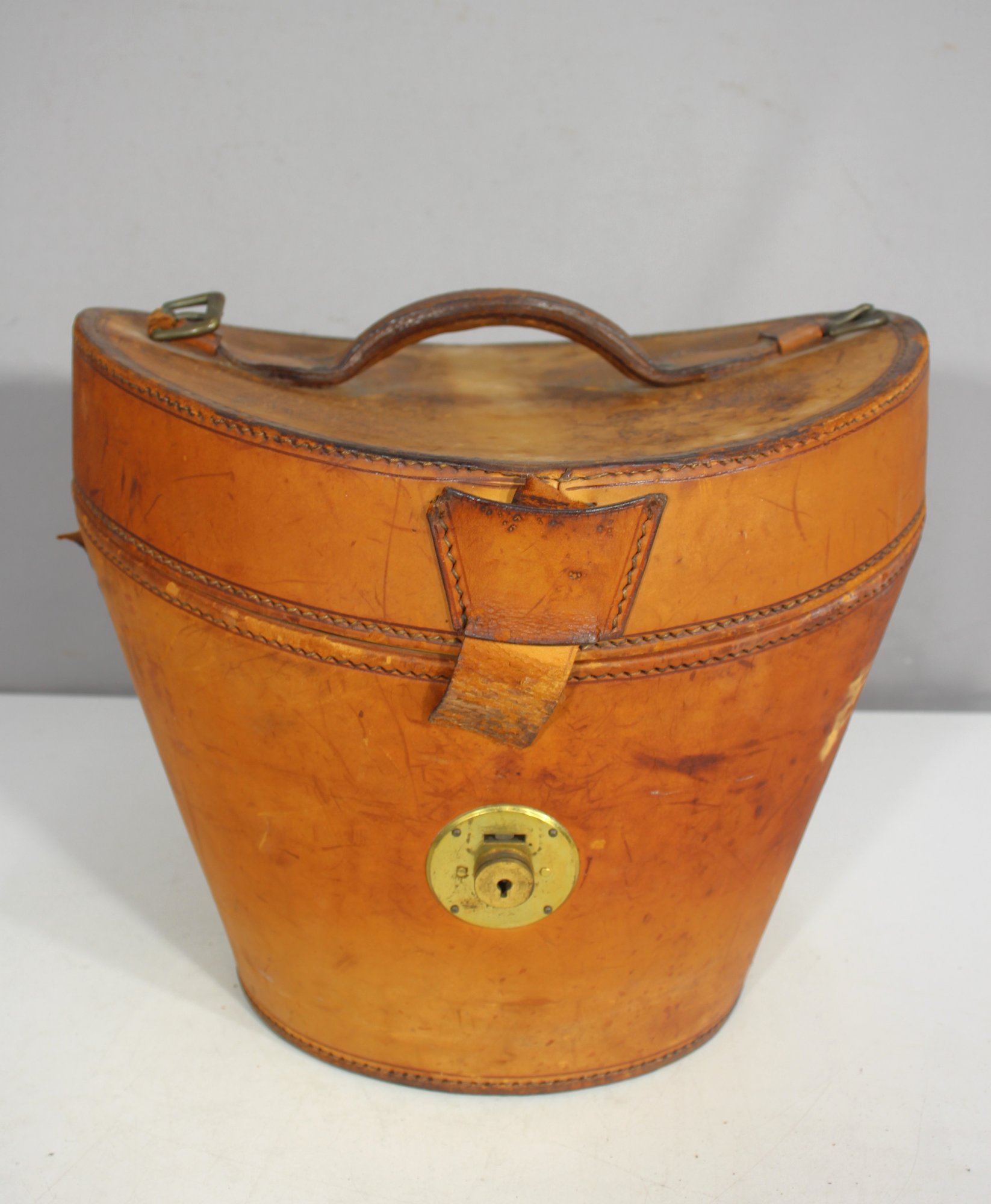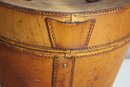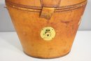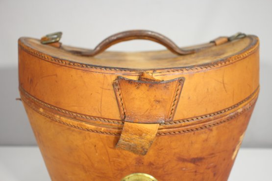 a rare antique leather top hat case, featuring a beautiful patina, brass hardware, and stitched detailing. This vintage travel case was likely used for equestrian or formal travel to protect a gentleman’s top hat. Its sturdy leather construction and classic craftsmanship make it a wonderful collector’s item or decorative piece.