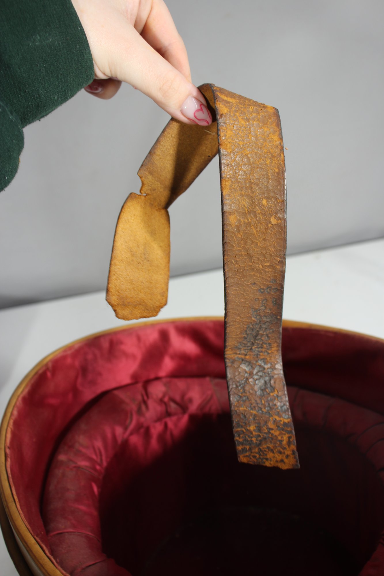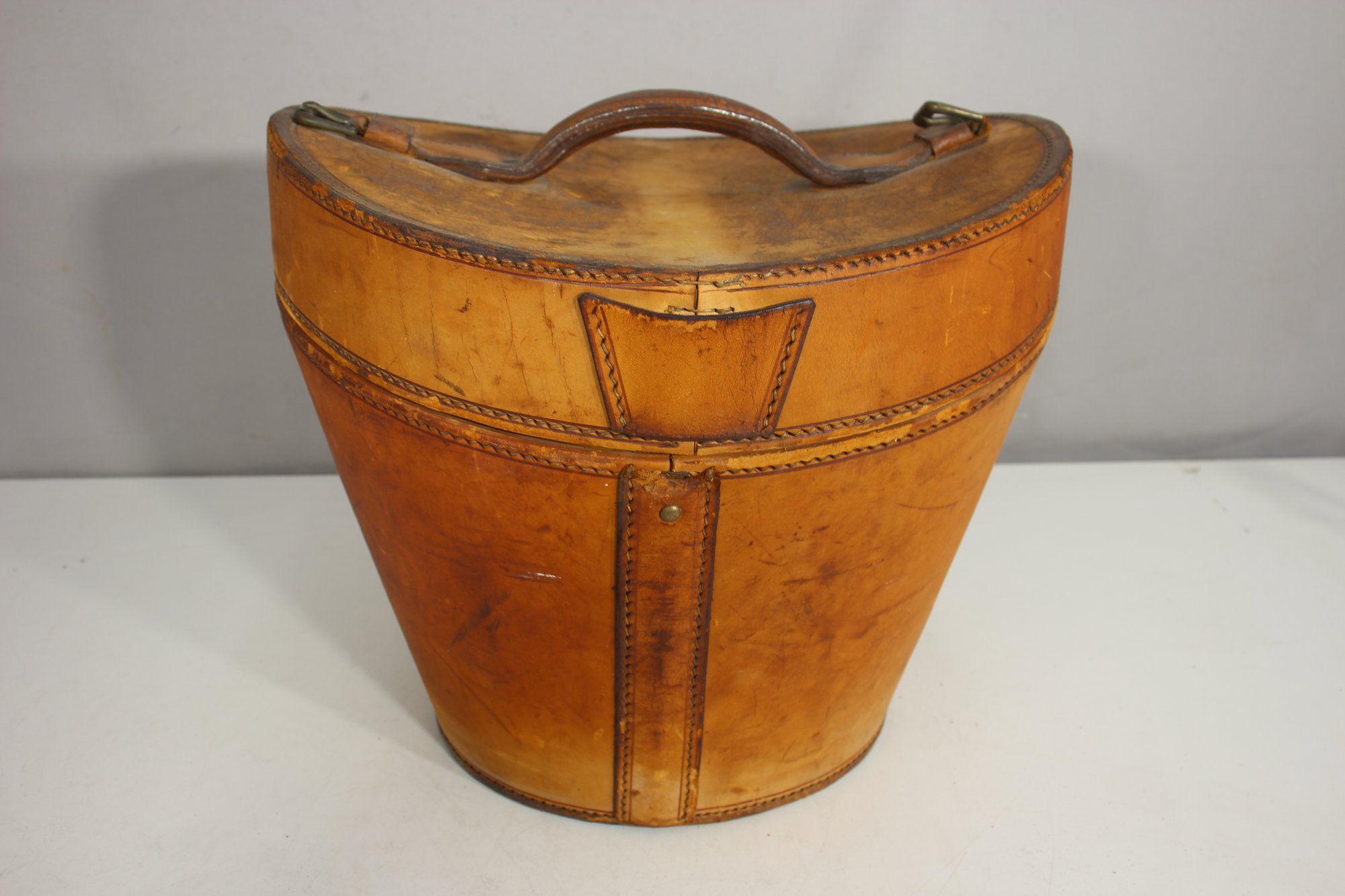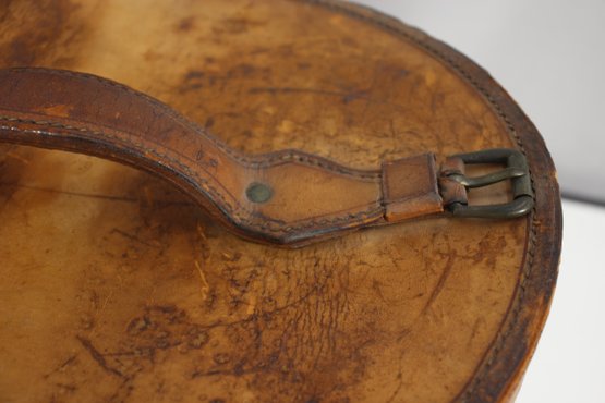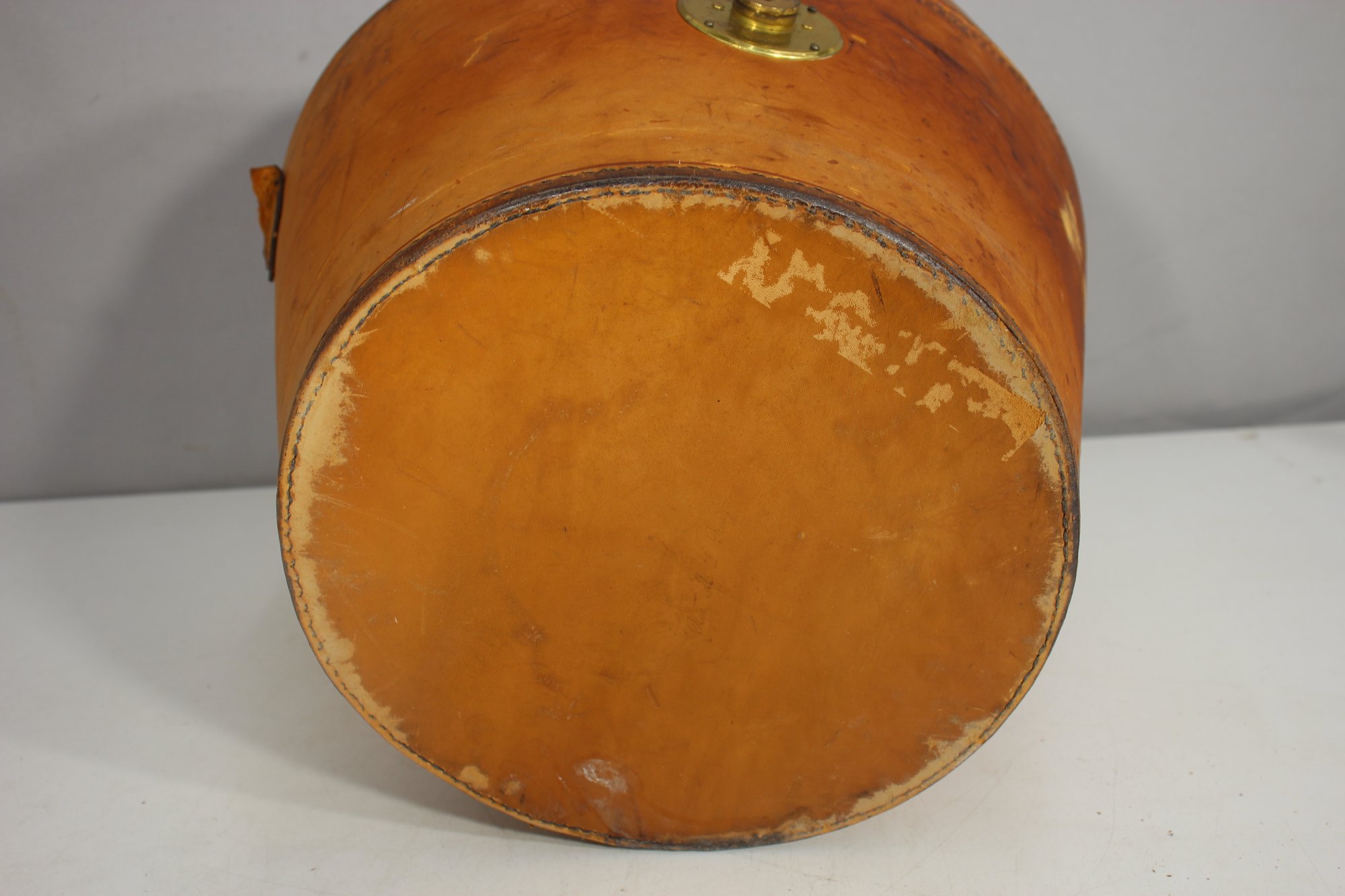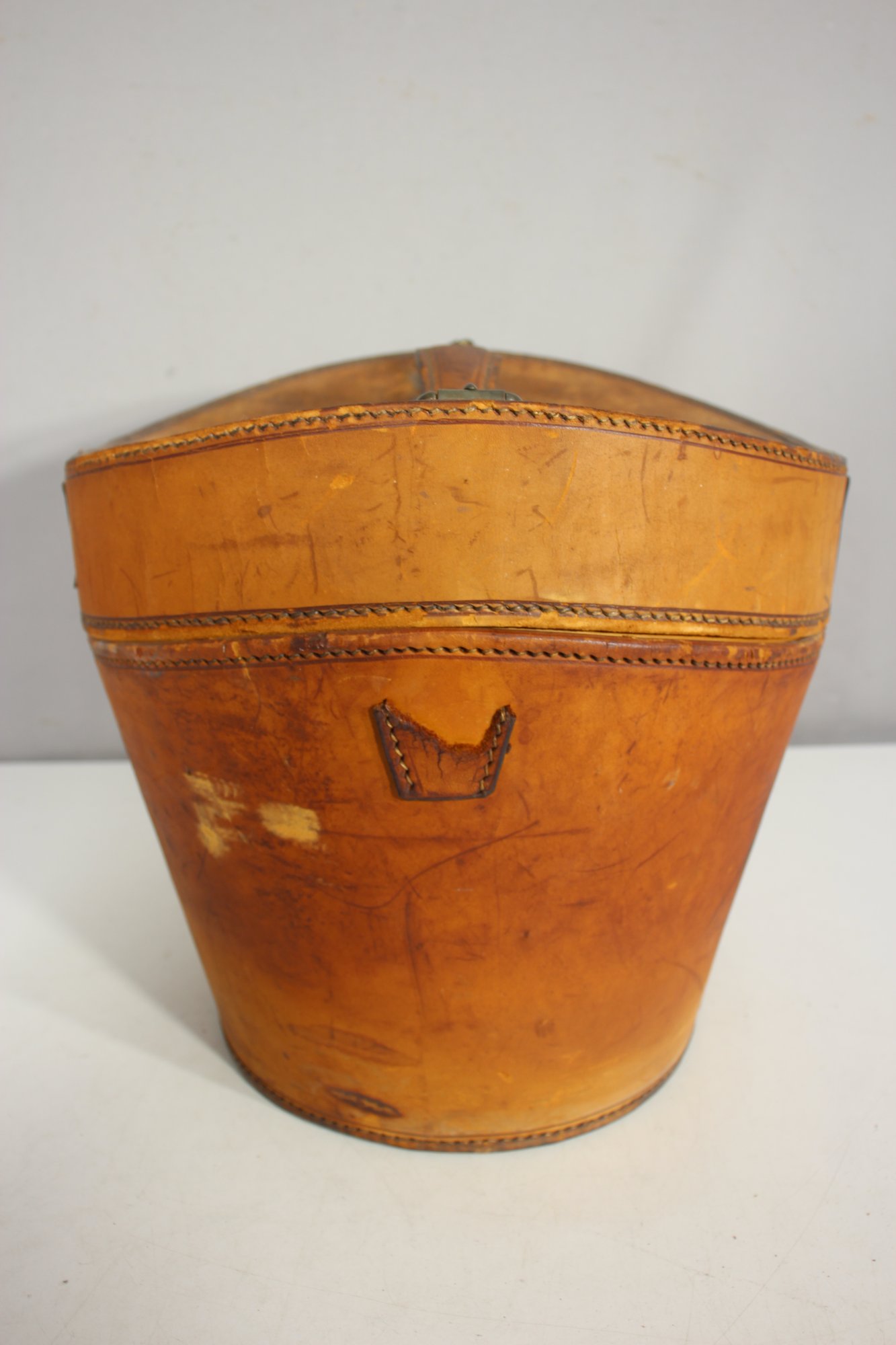 a rare antique leather top hat case, featuring a beautiful patina, brass hardware, and stitched detailing. This vintage travel case was likely used for equestrian or formal travel to protect a gentleman’s top hat. Its sturdy leather construction and classic craftsmanship make it a wonderful collector’s item or decorative piece.