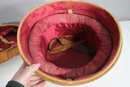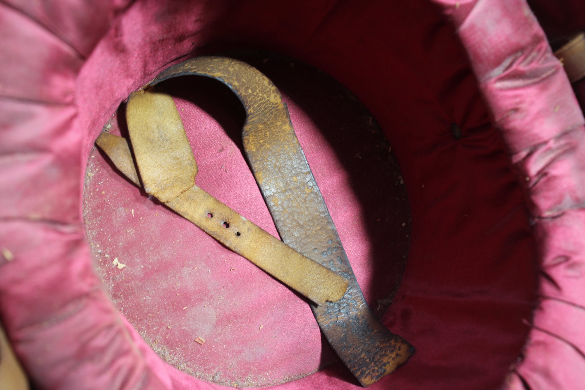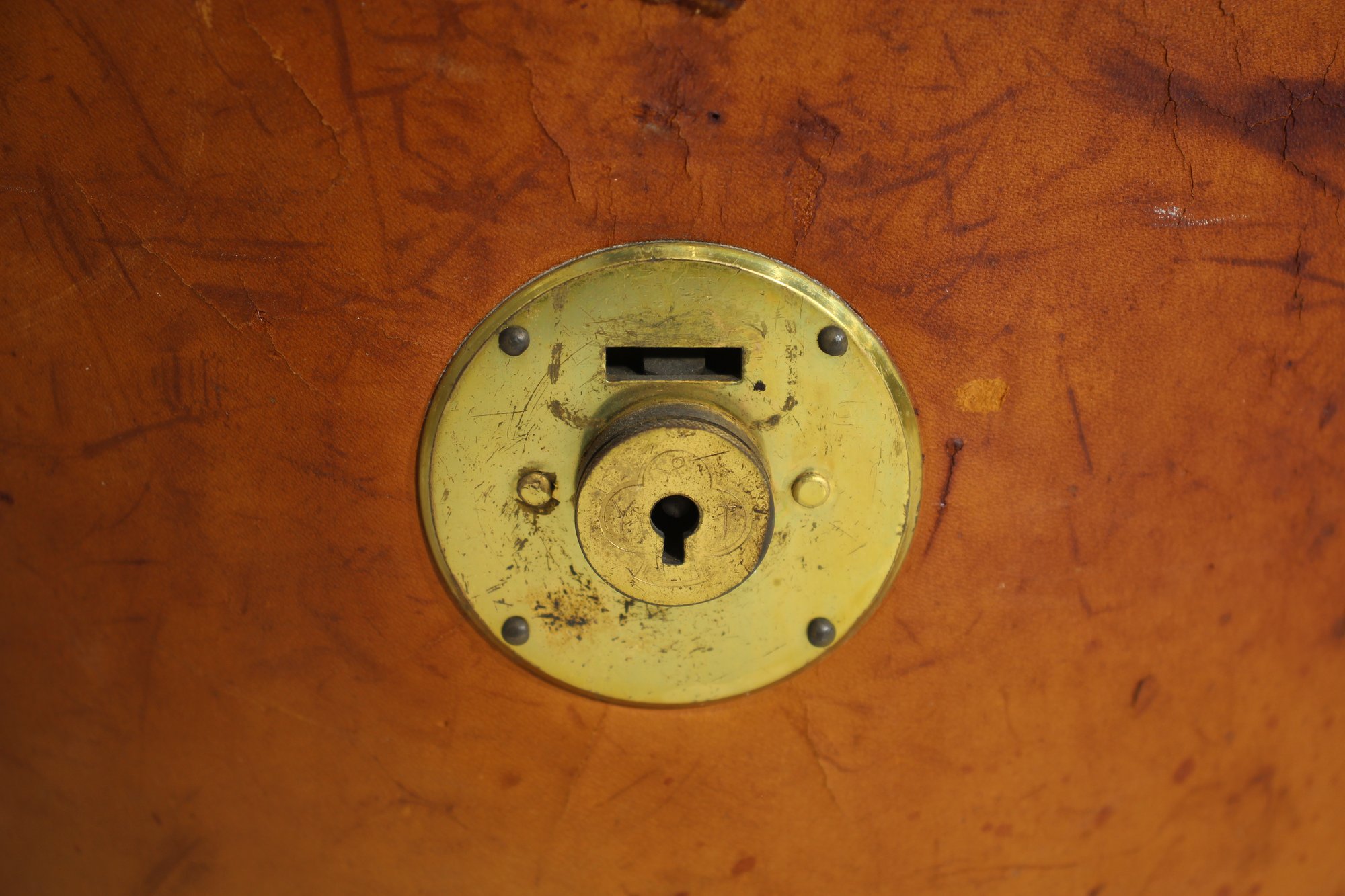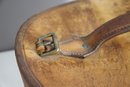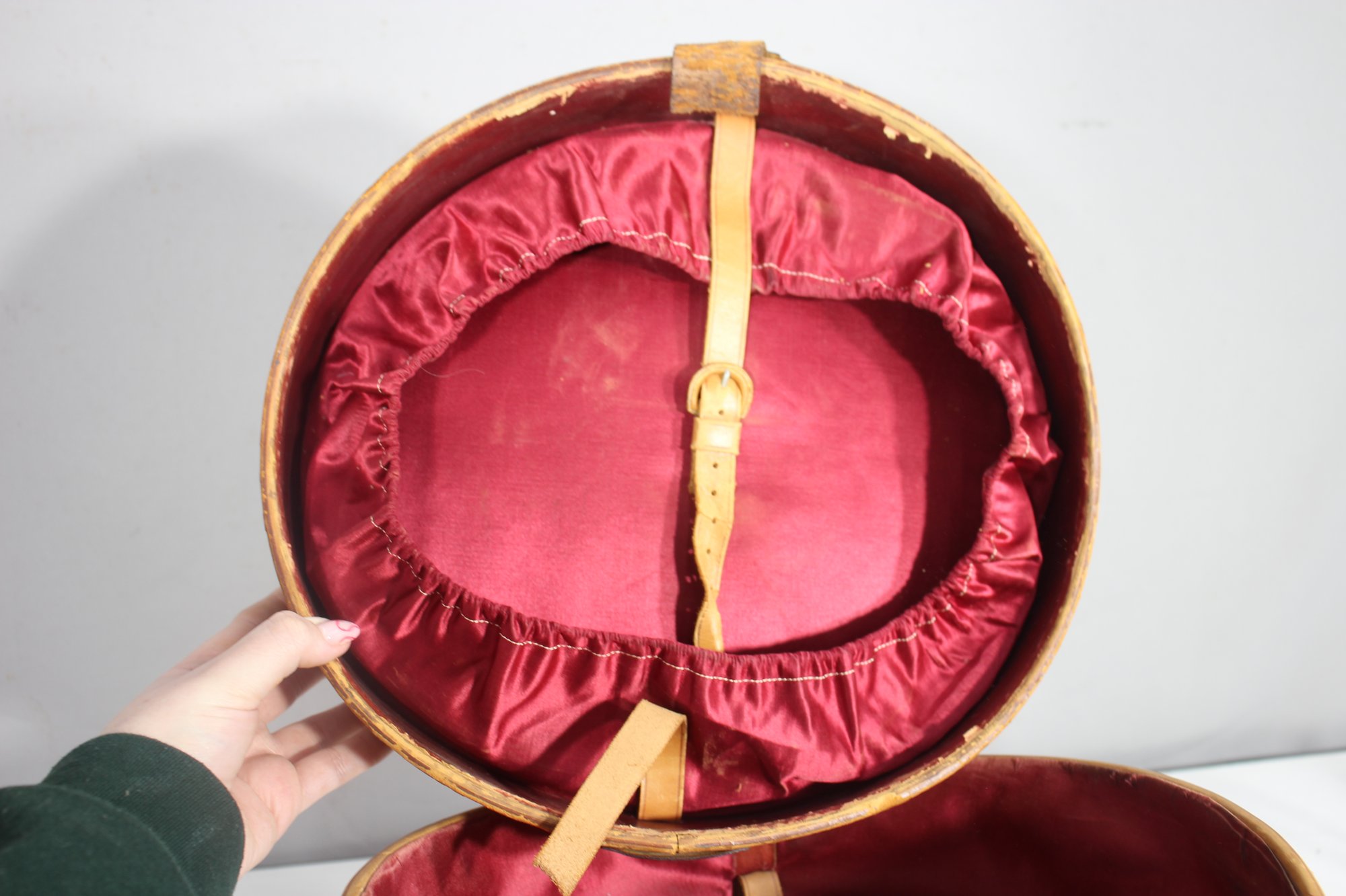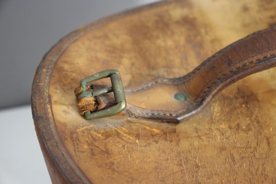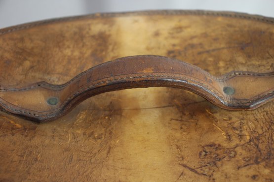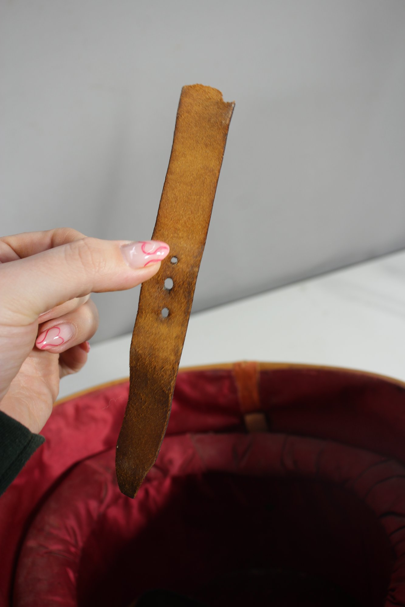 a rare antique leather top hat case, featuring a beautiful patina, brass hardware, and stitched detailing. This vintage travel case was likely used for equestrian or formal travel to protect a gentleman’s top hat. Its sturdy leather construction and classic craftsmanship make it a wonderful collector’s item or decorative piece.