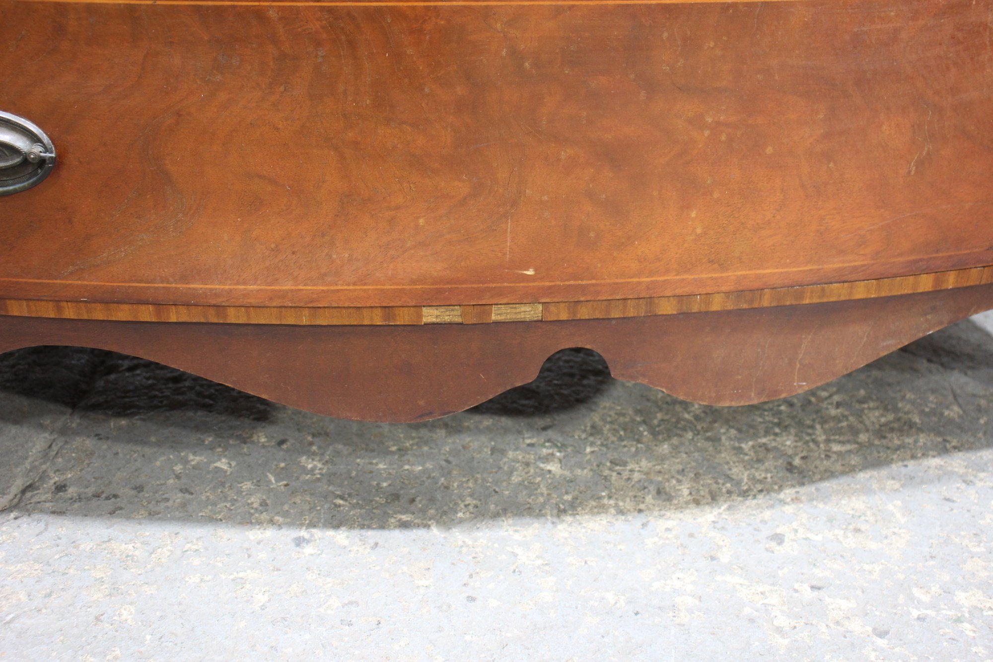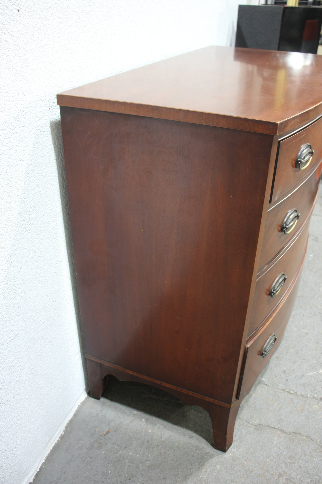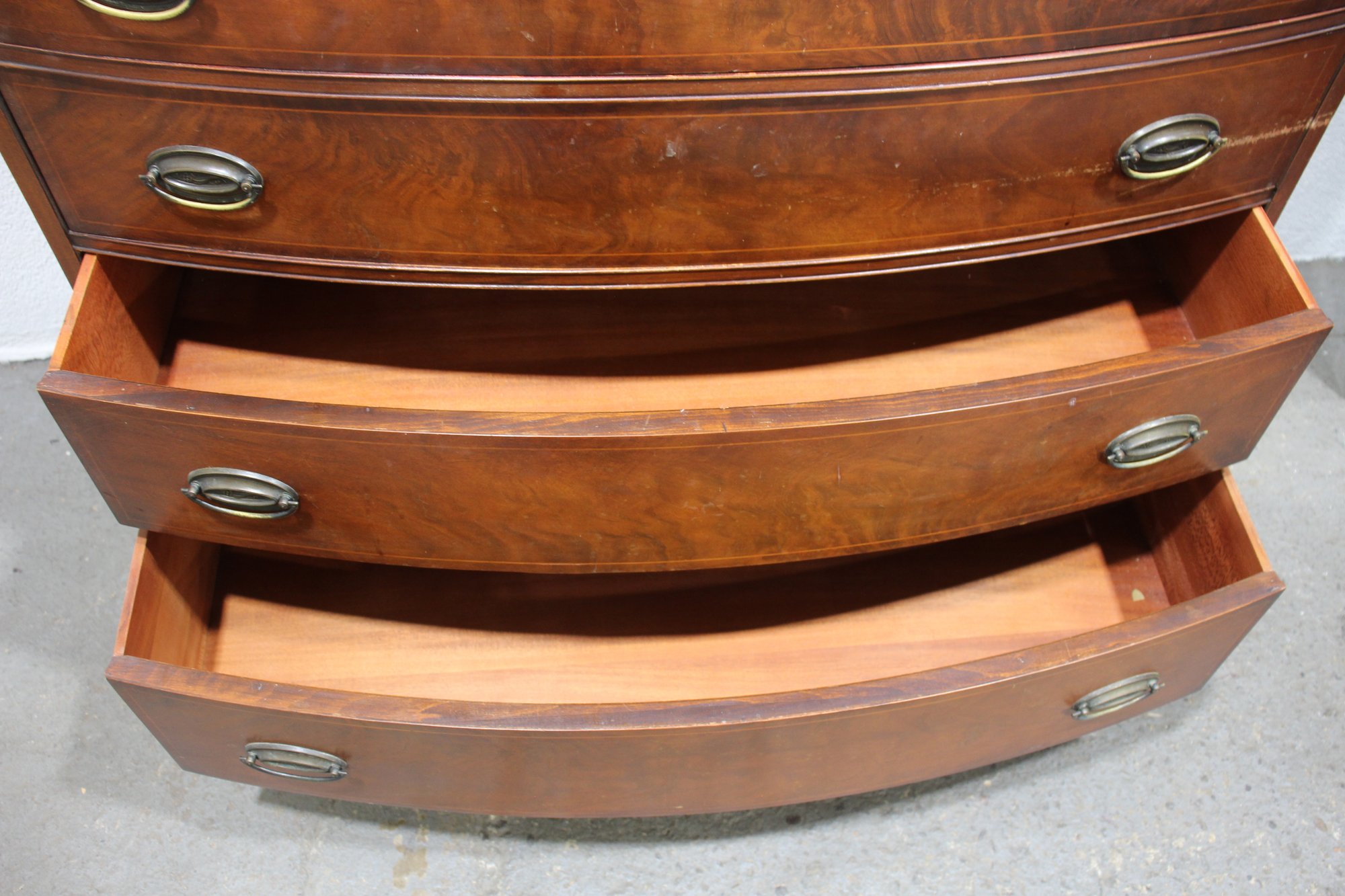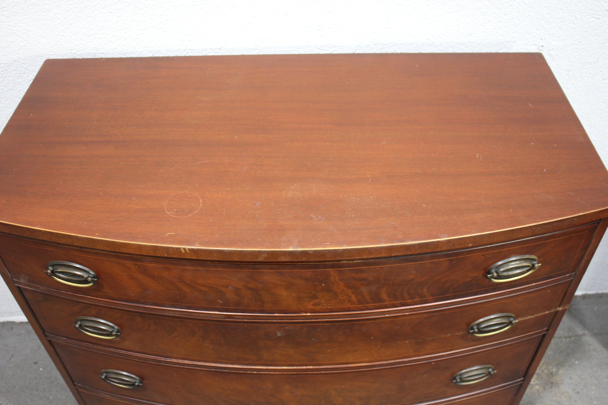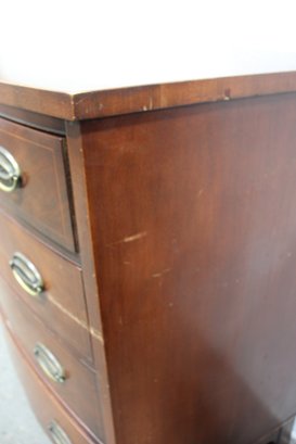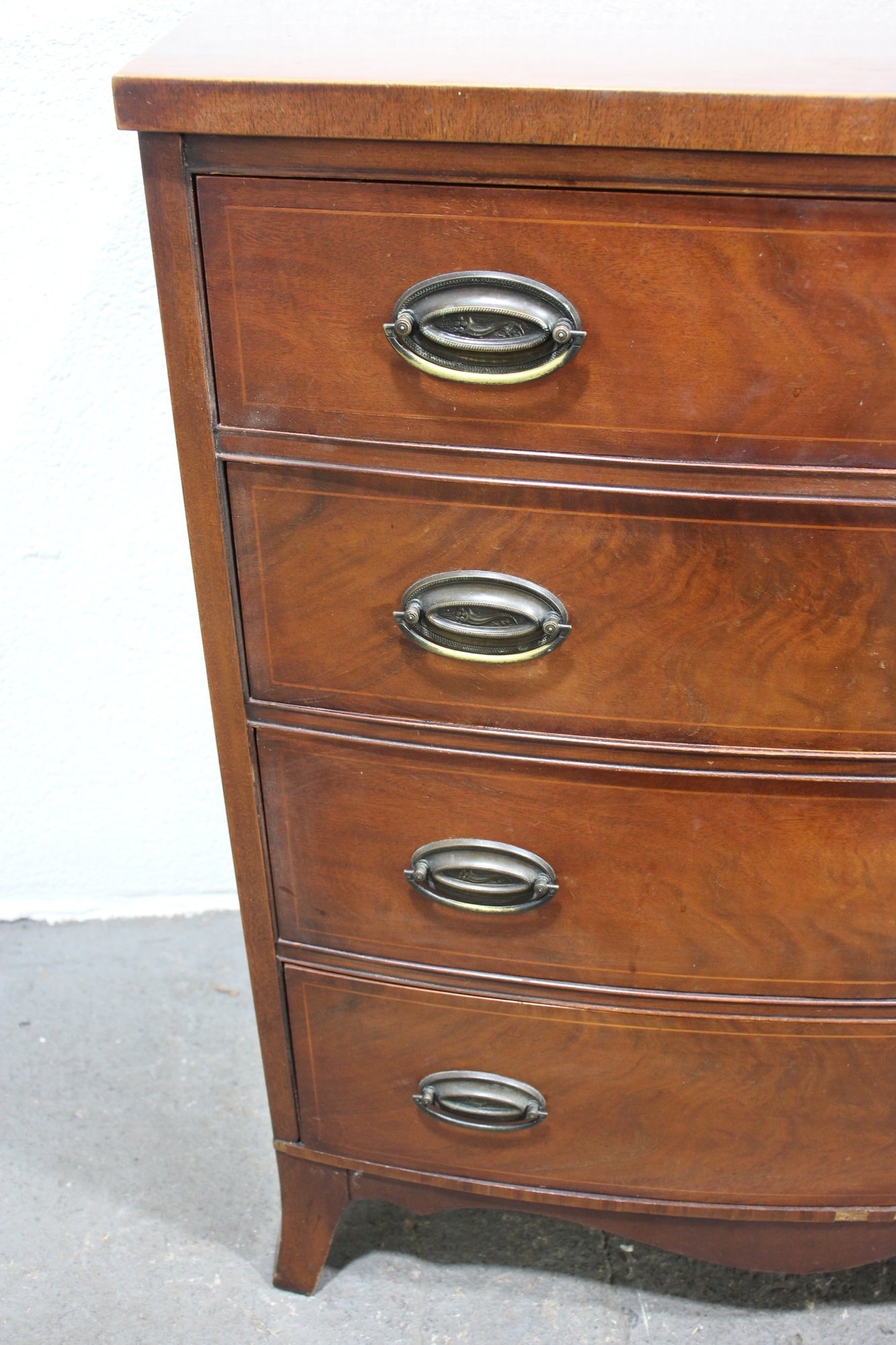 a stunning antique mahogany bow front chest of drawers, showcasing elegant craftsmanship with a rich mahogany veneer finish and fine inlay detailing along the lower apron. This timeless piece offers four spacious drawers with original brass oval pulls, providing ample storage while maintaining its classic aesthetic.