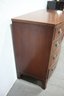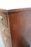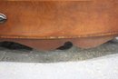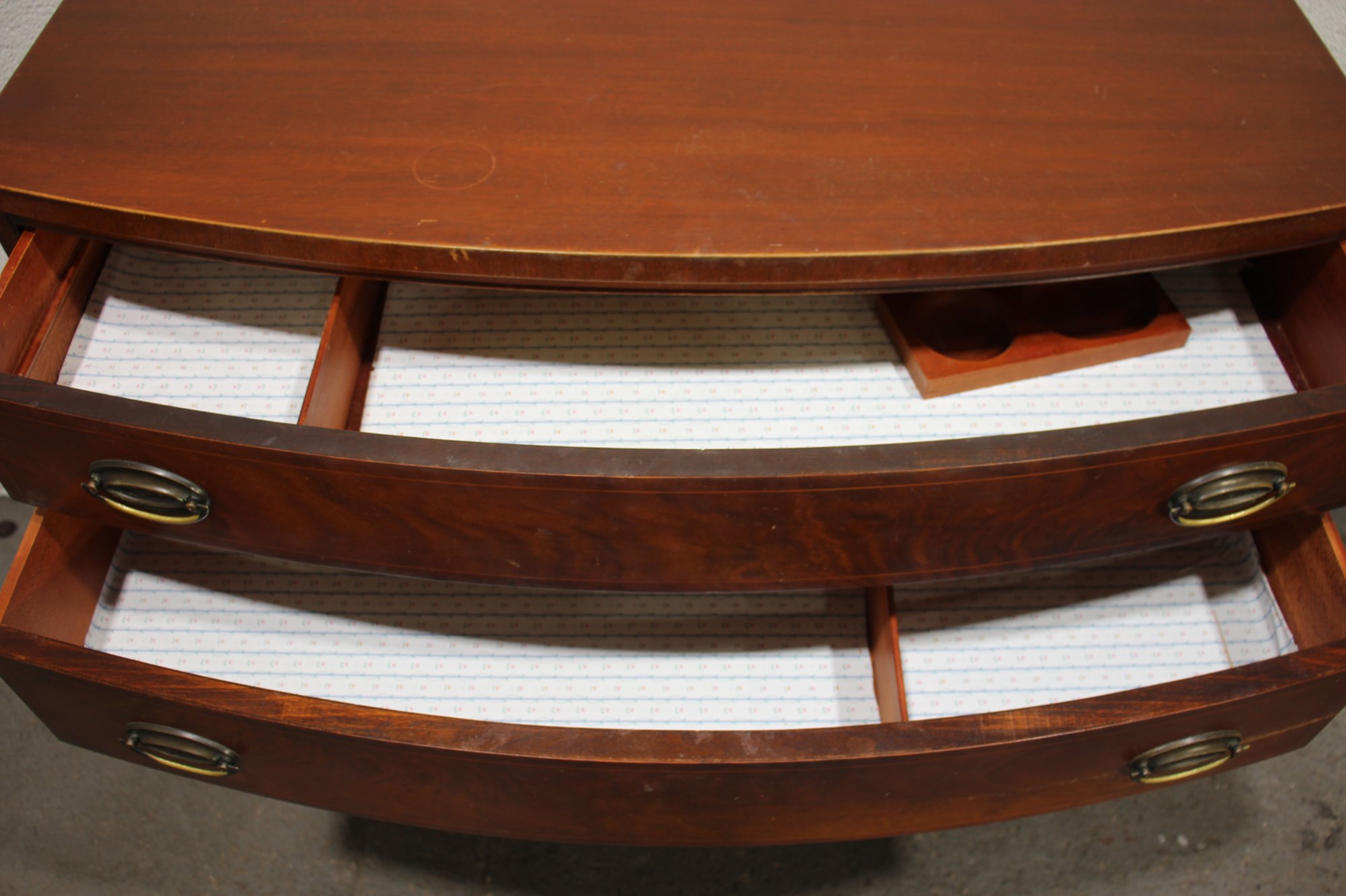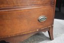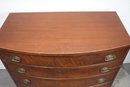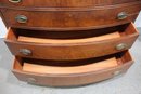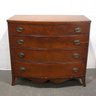 The chest features a gracefully curved bow front, a decorative scalloped apron, and splayed feet, all contributing to its sophisticated appearance. The dovetail construction and solid wood interior speak to the quality and durability of this heirloom piece.
