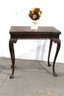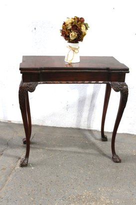 This antique mahogany card table features a folding top that opens to double its size, providing a convenient and elegant solution for entertaining or everyday use. The table stands on gracefully carved cabriole legs with floral details, lending a classic and ornate touch to its overall design. When opened, the table reveals a flat playing surface, perfect for card games, tea service, or additional tabletop space when needed.