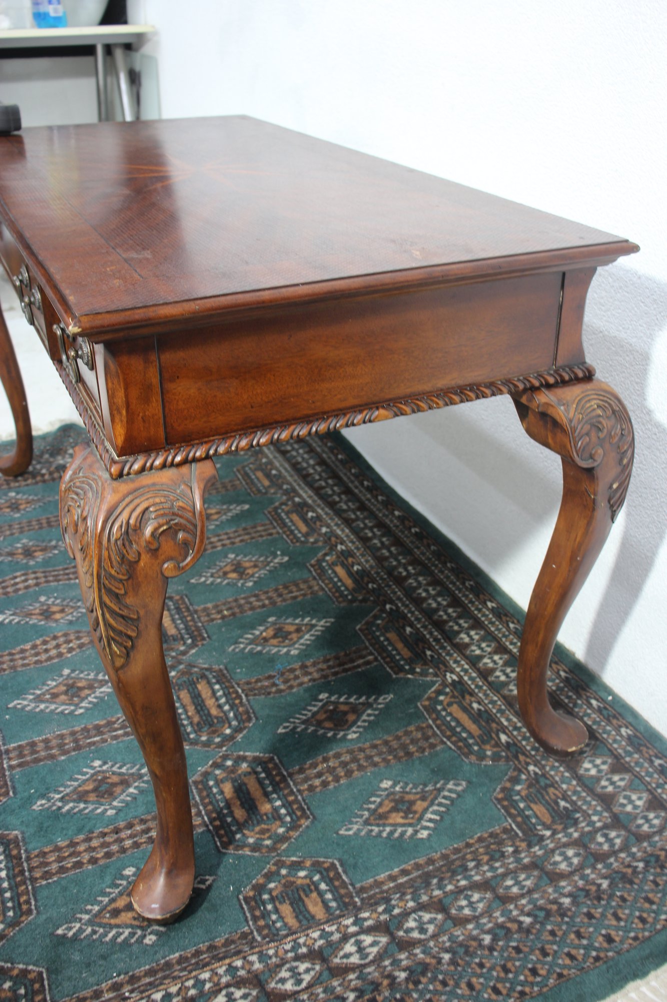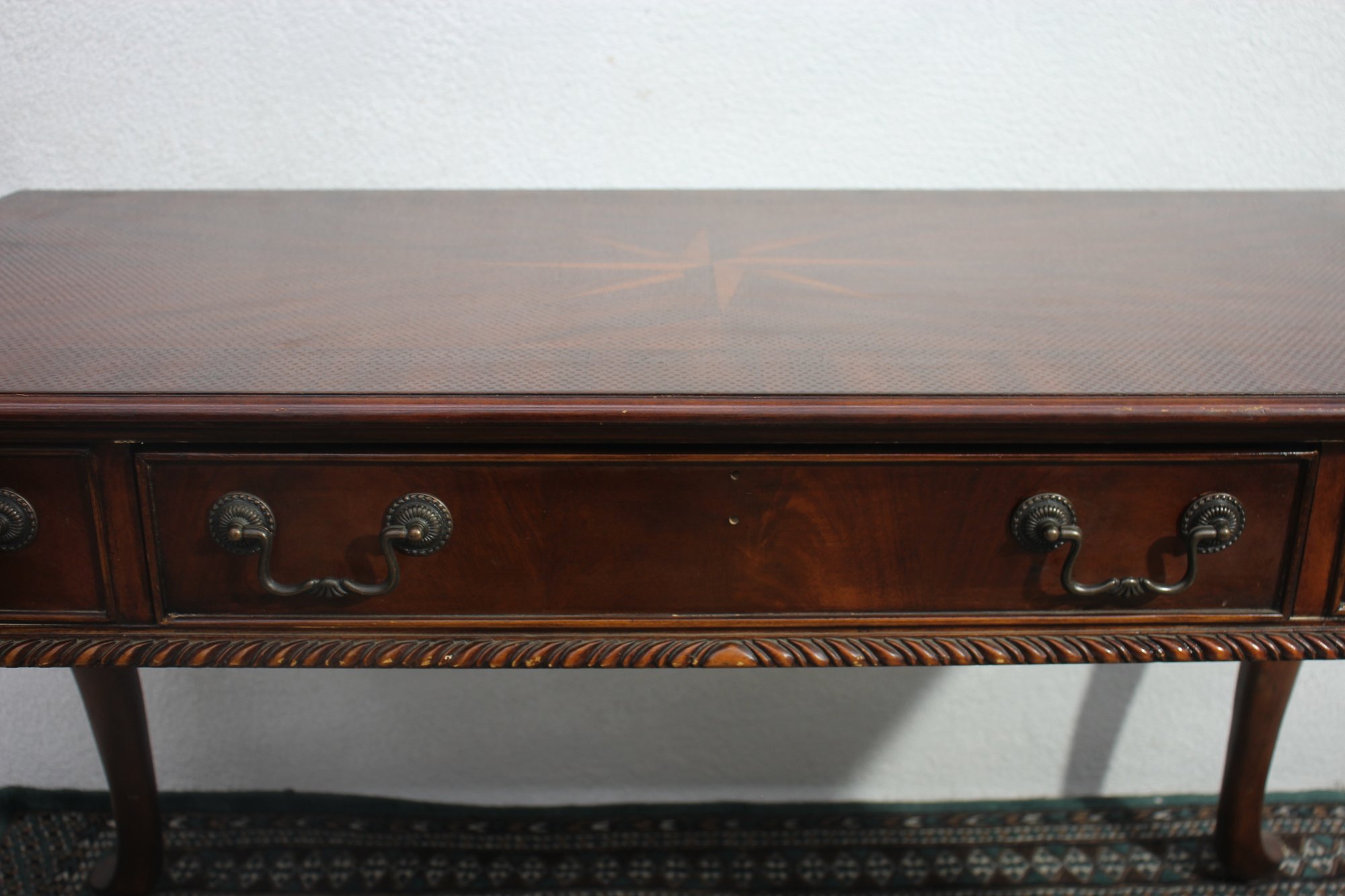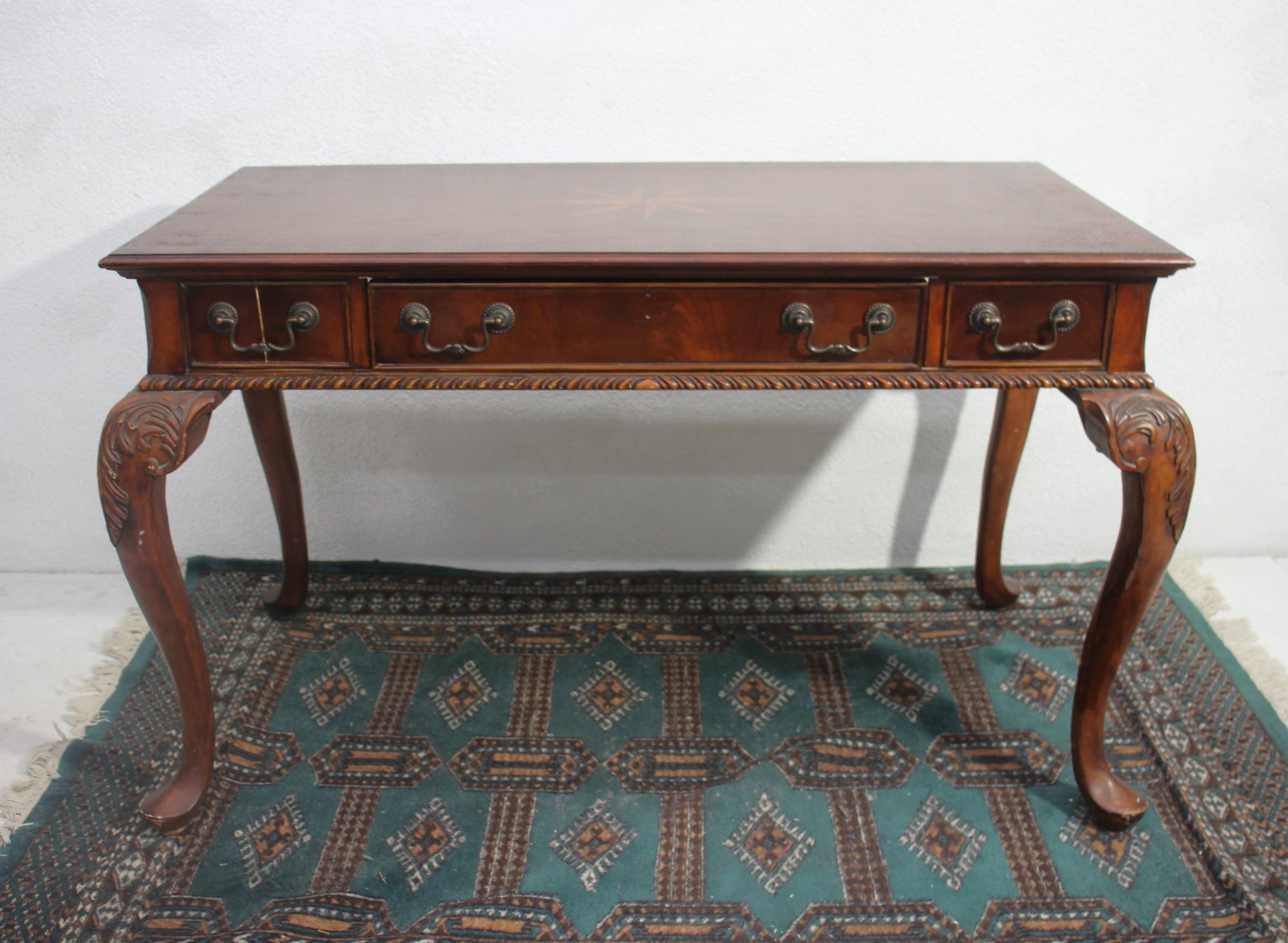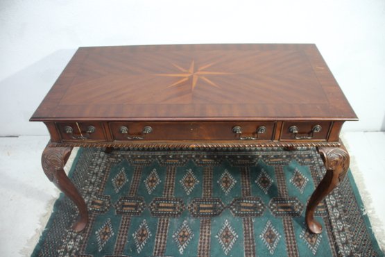 This beautiful antique mahogany writing desk features exquisite craftsmanship, including an inlaid starburst design on the top, ornate hand-carved cabriole legs, and brass hardware. A stunning piece that blends functionality with old-world elegance.