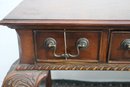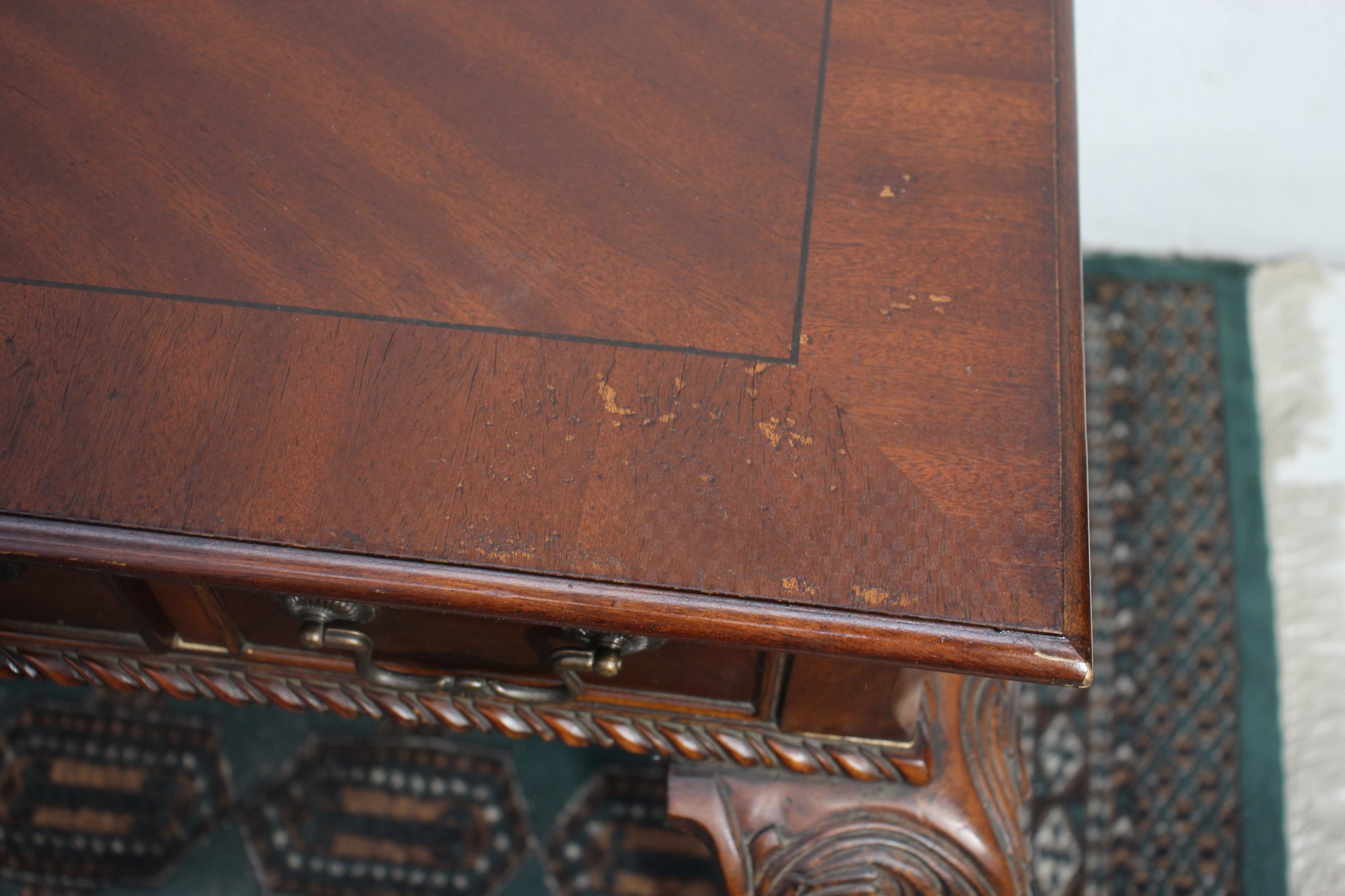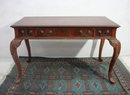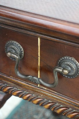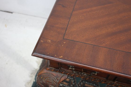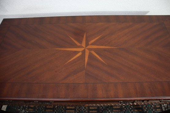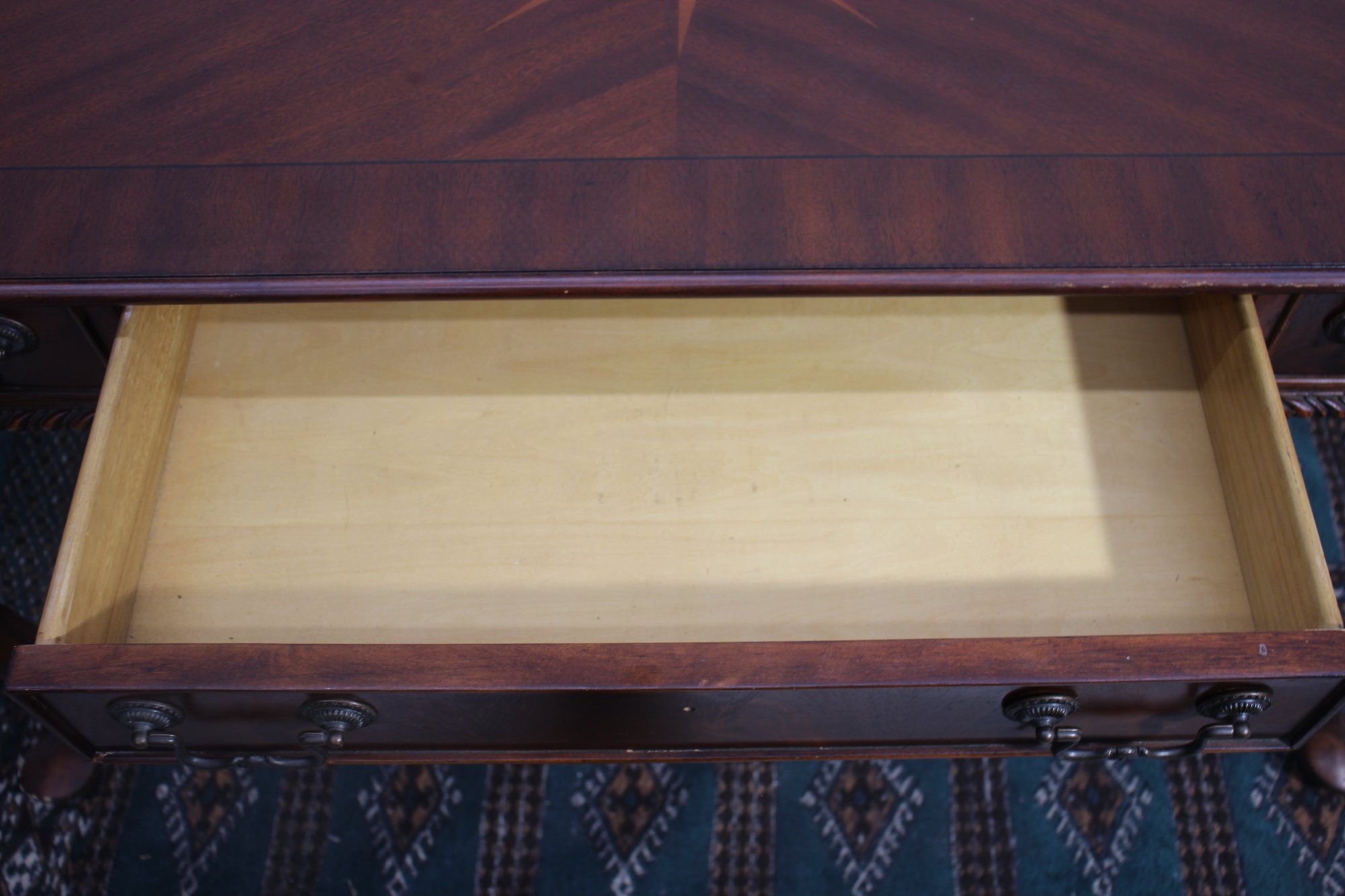 This beautiful antique mahogany writing desk features exquisite craftsmanship, including an inlaid starburst design on the top, ornate hand-carved cabriole legs, and brass hardware. A stunning piece that blends functionality with old-world elegance.