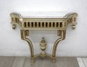 This elegant antique console table features a stunning marble top, ideal for adding a touch of sophistication to any space. The marble top shows a visible crack and needs repair, making it a great restoration project for antique furniture enthusiasts. The ornate carved wood base showcases intricate detailing and a patina that speaks to its age. A beautiful piece that, once restored, will make a fantastic addition to a classic or vintage-inspired decor.