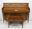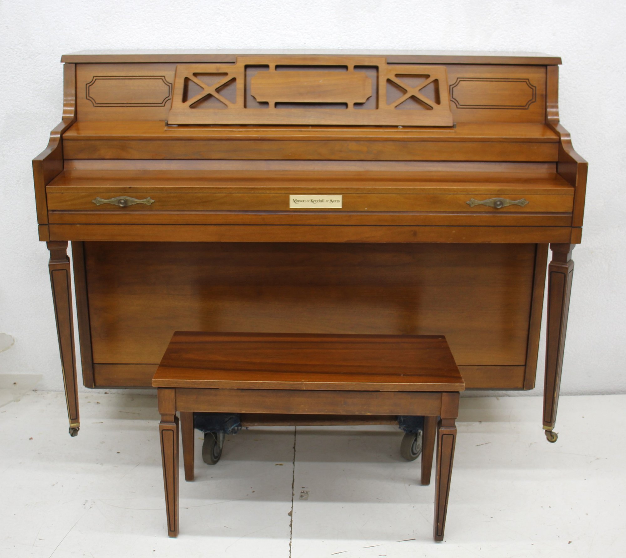 This charming vintage upright piano is a beautiful piece by Mason & Kendall, manufactured by Kimball. It features a rich wood finish with intricate, classic detailing, making it a lovely addition to any home or studio. This piano comes with a matching bench that has a lift-top for convenient sheet music storage. The Kimball branding inside speaks to its quality and heritage, ensuring both functionality and a sense of nostalgia.
