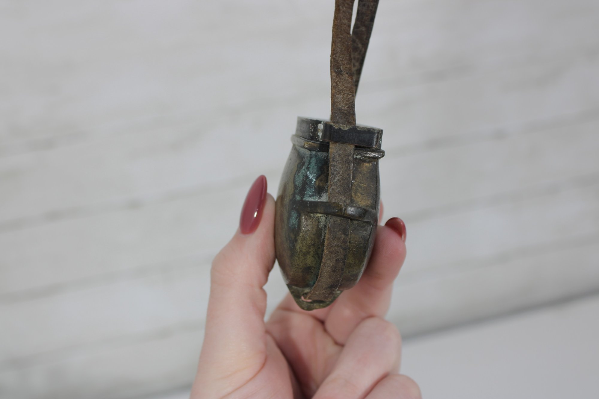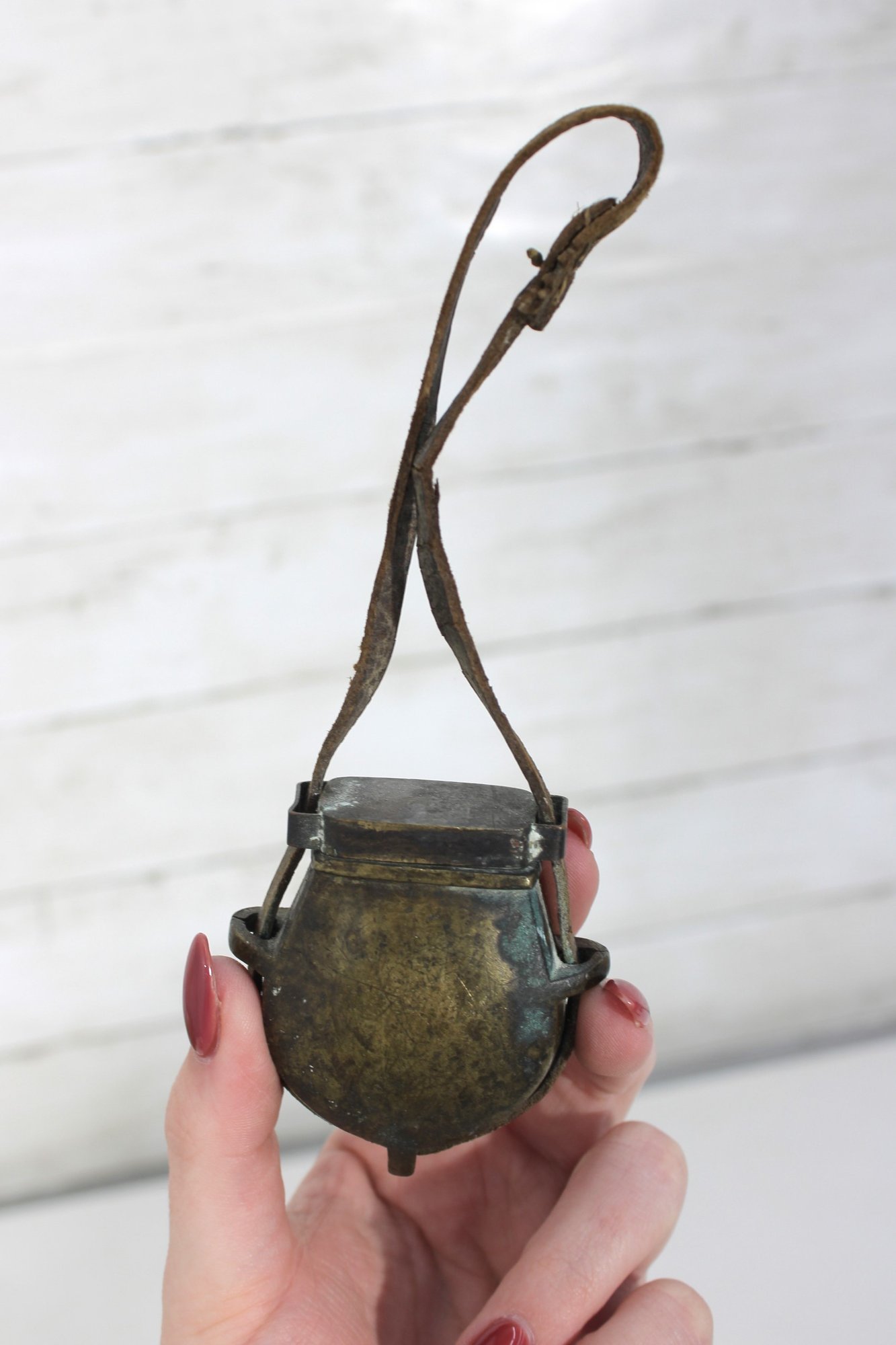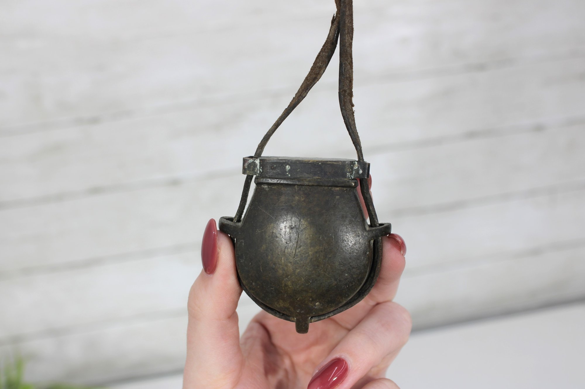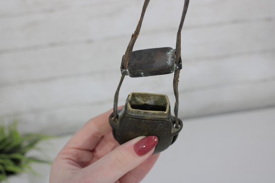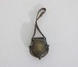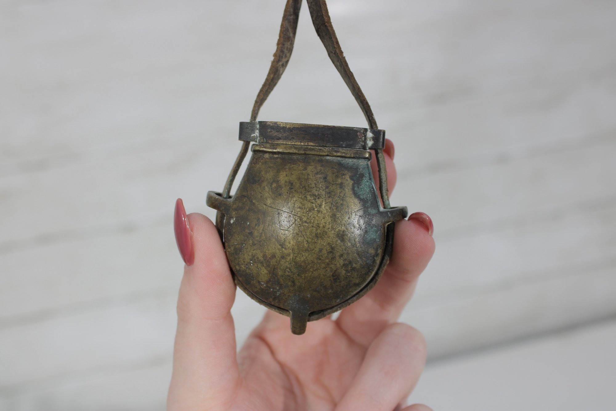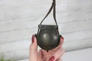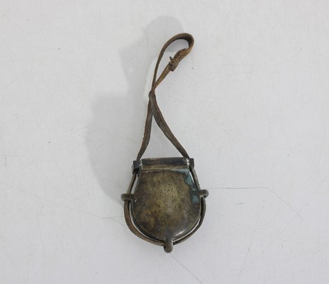 Antique miniature powder flask with attached leather strap, featuring a rounded metal body with aged patina and hinged top. A unique small-size example that could have been used as a powder flask, novelty purse, or decorative accessory.