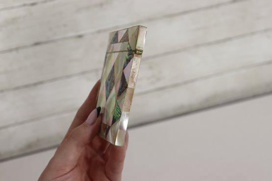 Gorgeous antique mother of pearl inlay small box, measuring approx. 4” x 3”. This piece features stunning iridescent mother of pearl set in geometric diamond pattern design with beautiful shimmer variations. Lid opens at the top and interior is open storage — possibly originally used for calling cards, small papers, or matches (vesta case style).