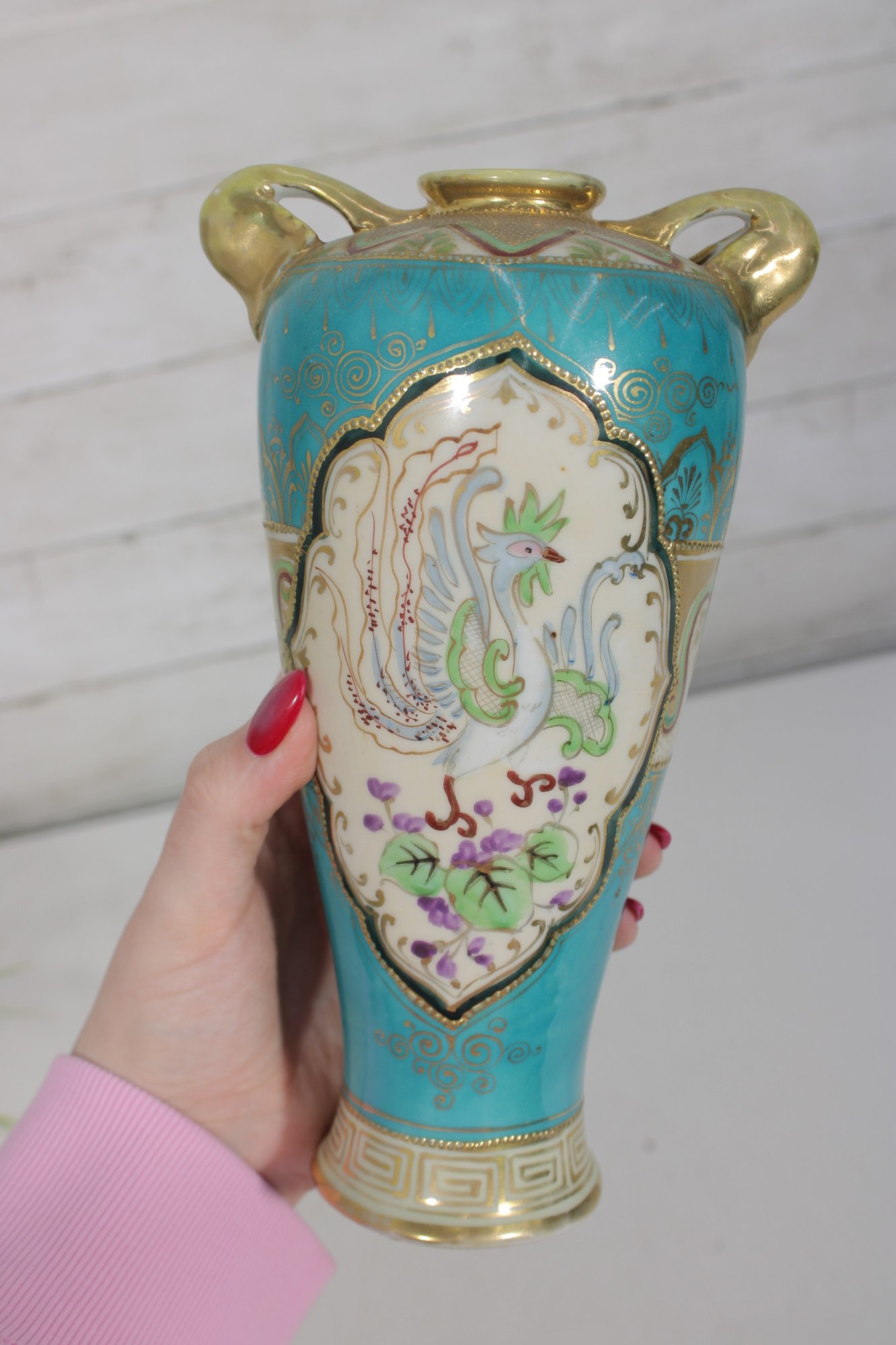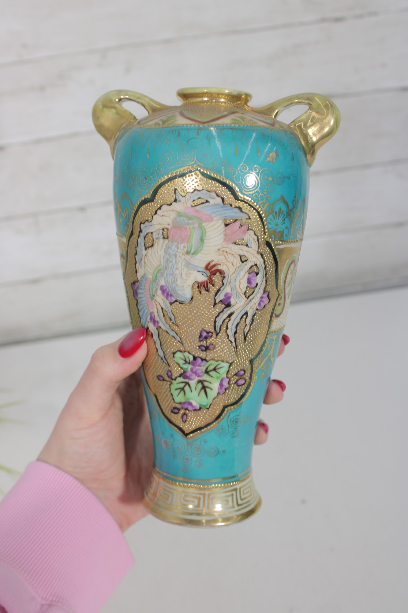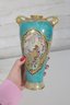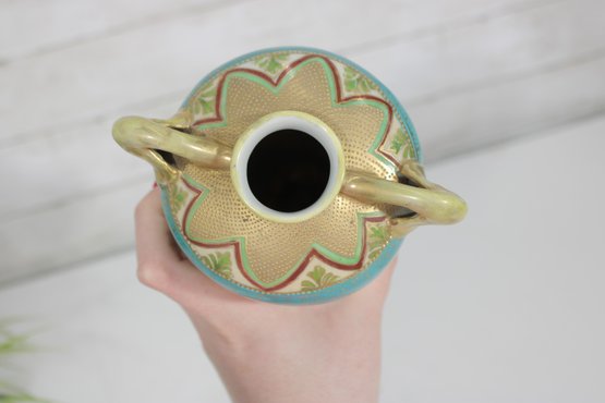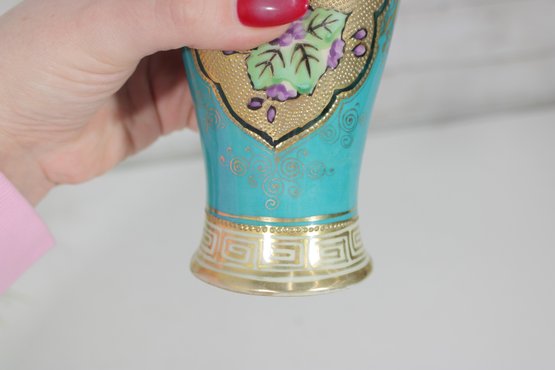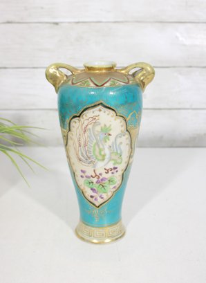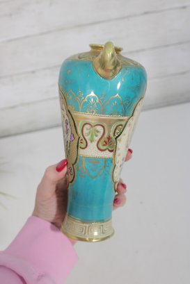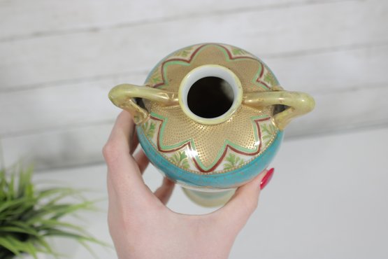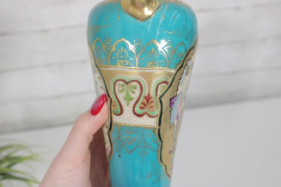 a stunning antique Nippon hand-painted porcelain vase, standing approximately 9 inches tall. This elegant piece features a vibrant turquoise ground richly decorated with intricate gold gilt detailing and raised moriage accents.