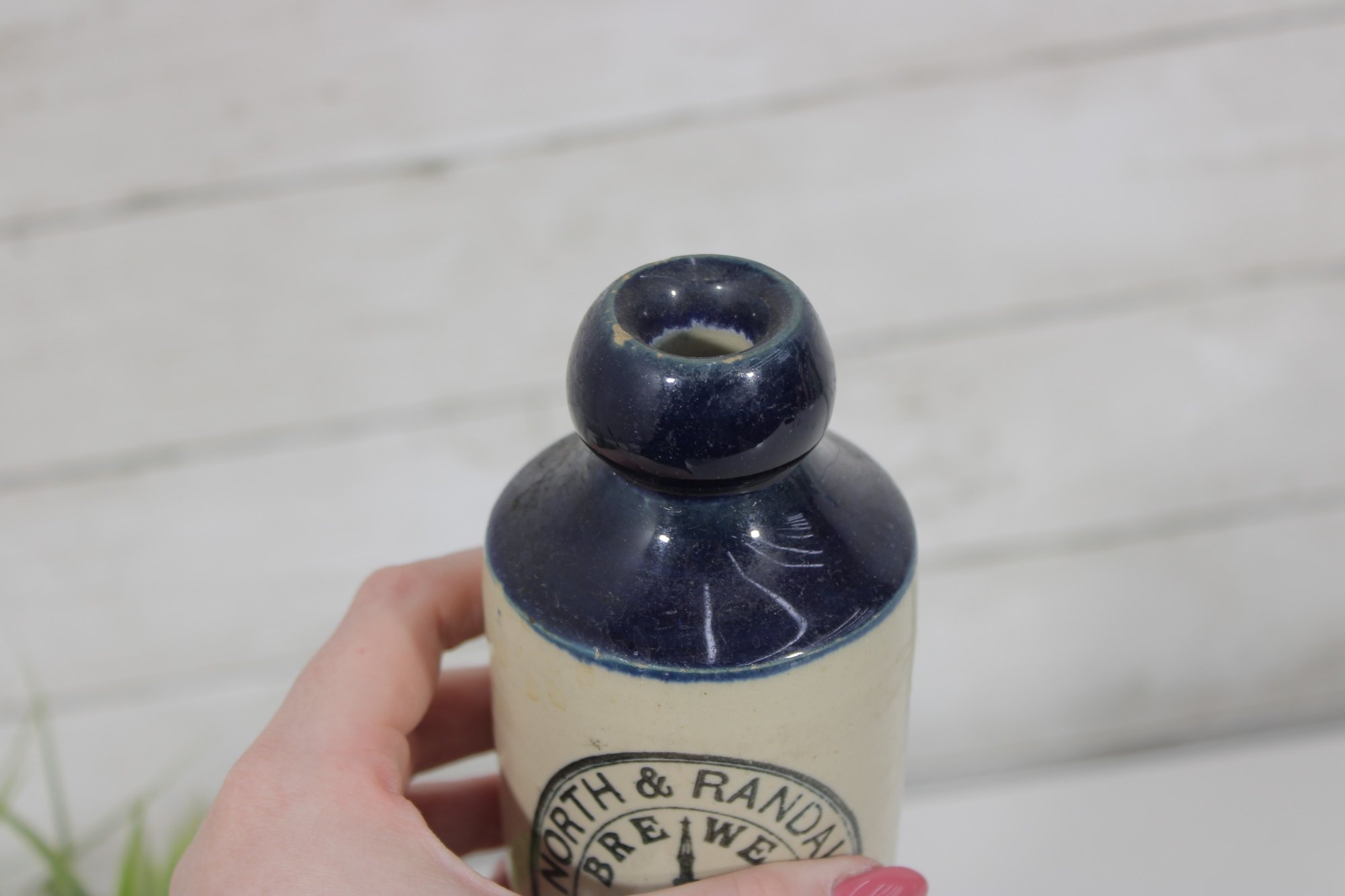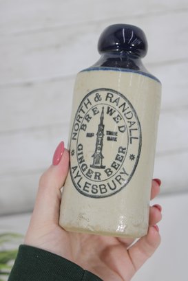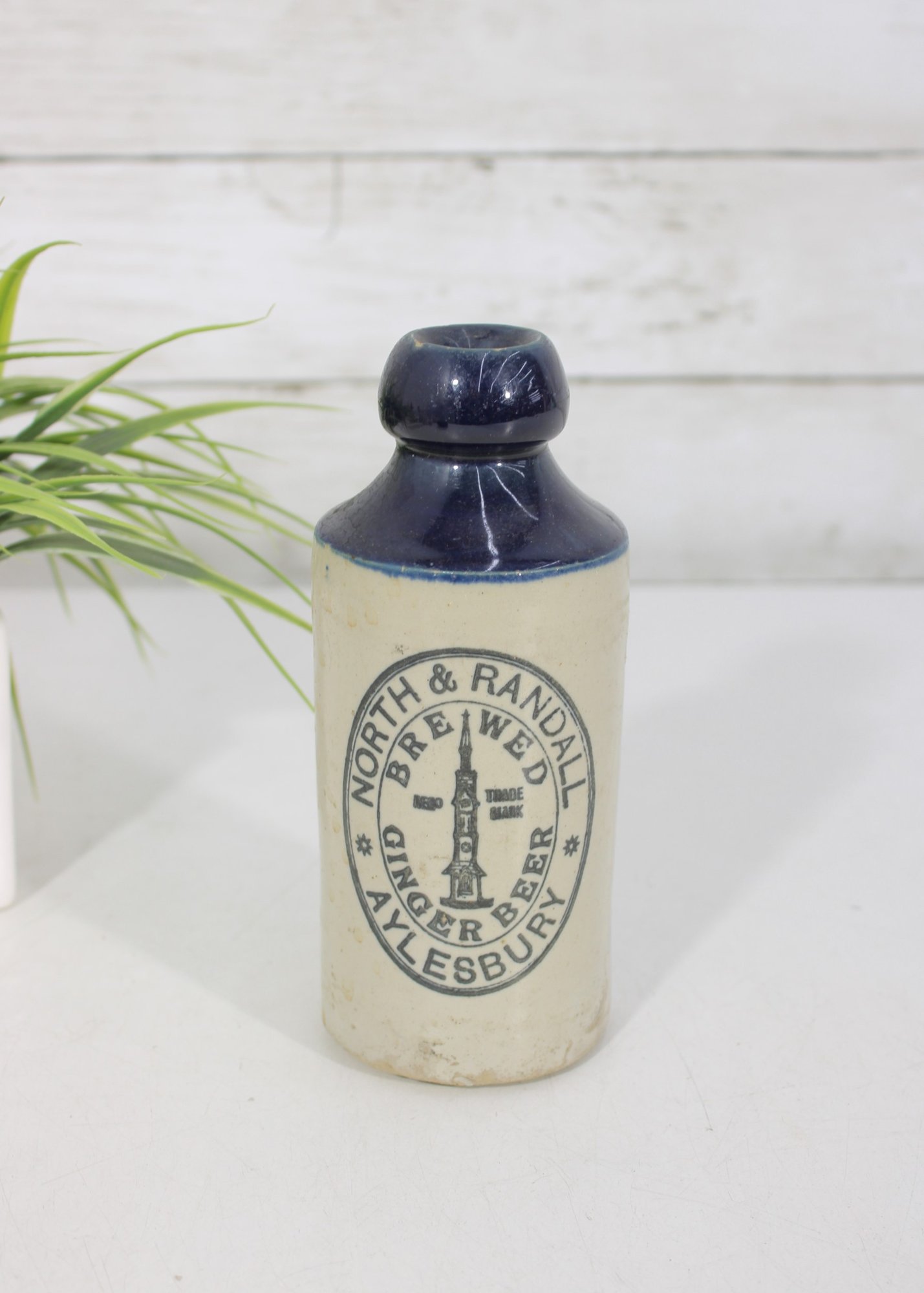 The front is decorated with a circular stamp reading “north & Randall Brewery –Aylesbury ” with a large number “1” in the center, indicating the bottle size or product designation. These stoneware bottles were commonly used for beer or ale distribution before widespread glass bottling.