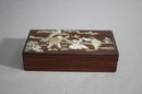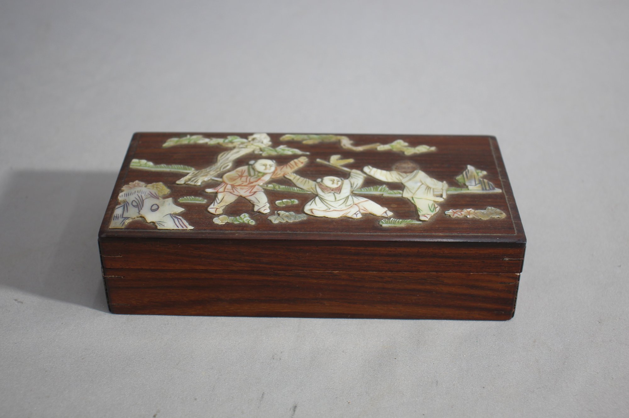 The lustrous sheen of the mother-of-pearl forms an exquisite pictorial scene atop the lid, with figures in traditional attire engaged in an everyday social scene