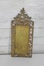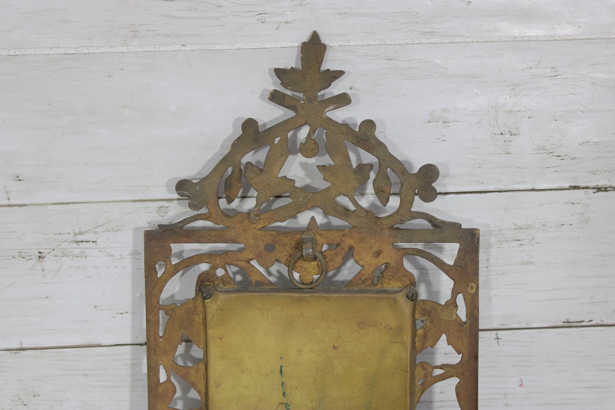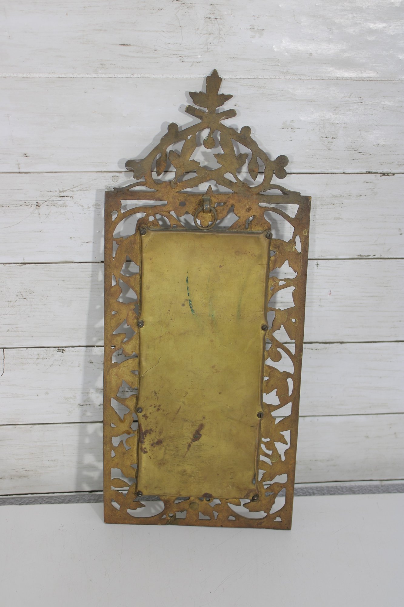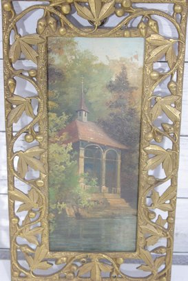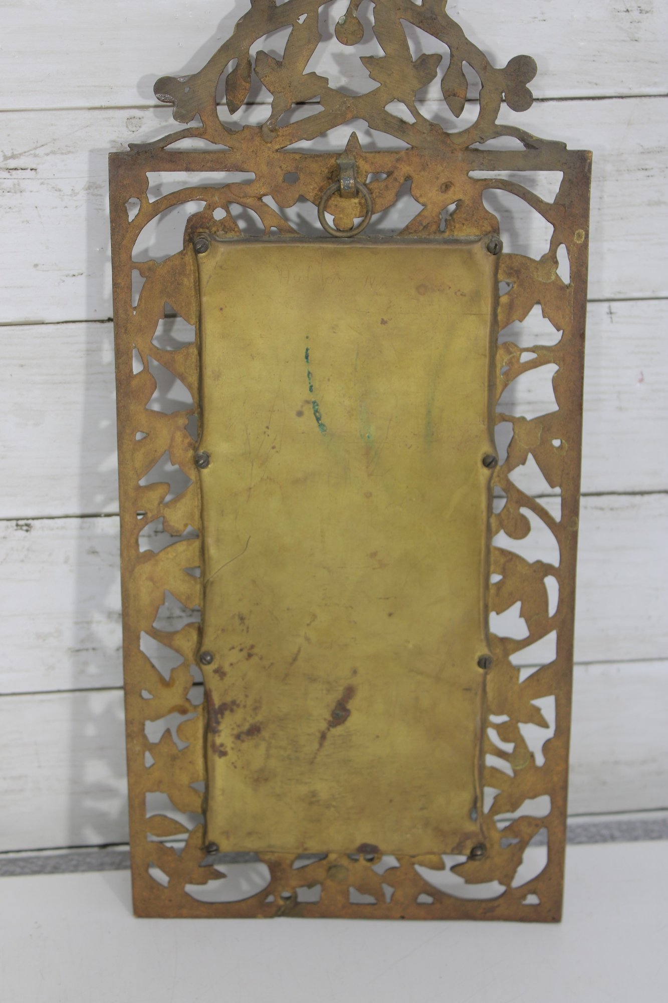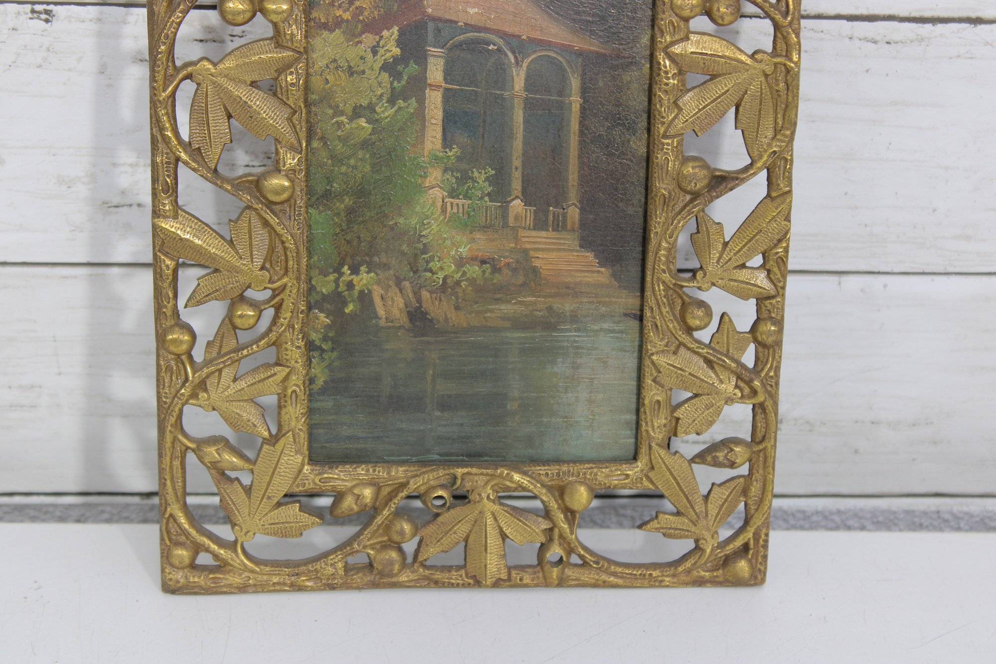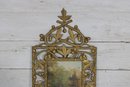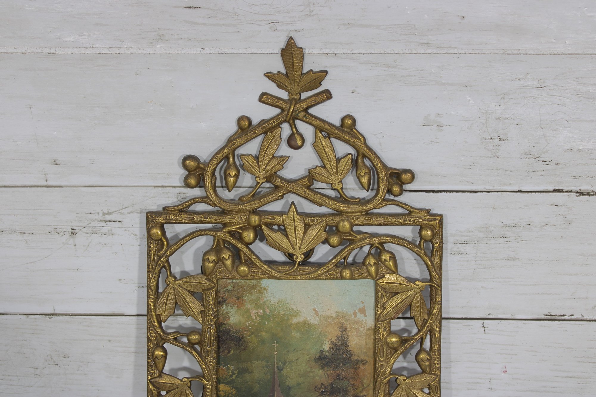 antique brass wall frame featuring an inset landscape painting on board. The frame showcases intricate openwork detailing with foliate and botanical motifs, crowned with a decorative finial at the top. The rich aged brass patina enhances its antique character.