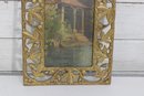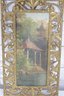 The central painting depicts a serene garden pavilion scene with architectural columns, lush greenery, and soft atmospheric tones. The artwork appears to be oil or mixed media on board, mounted securely within the frame.