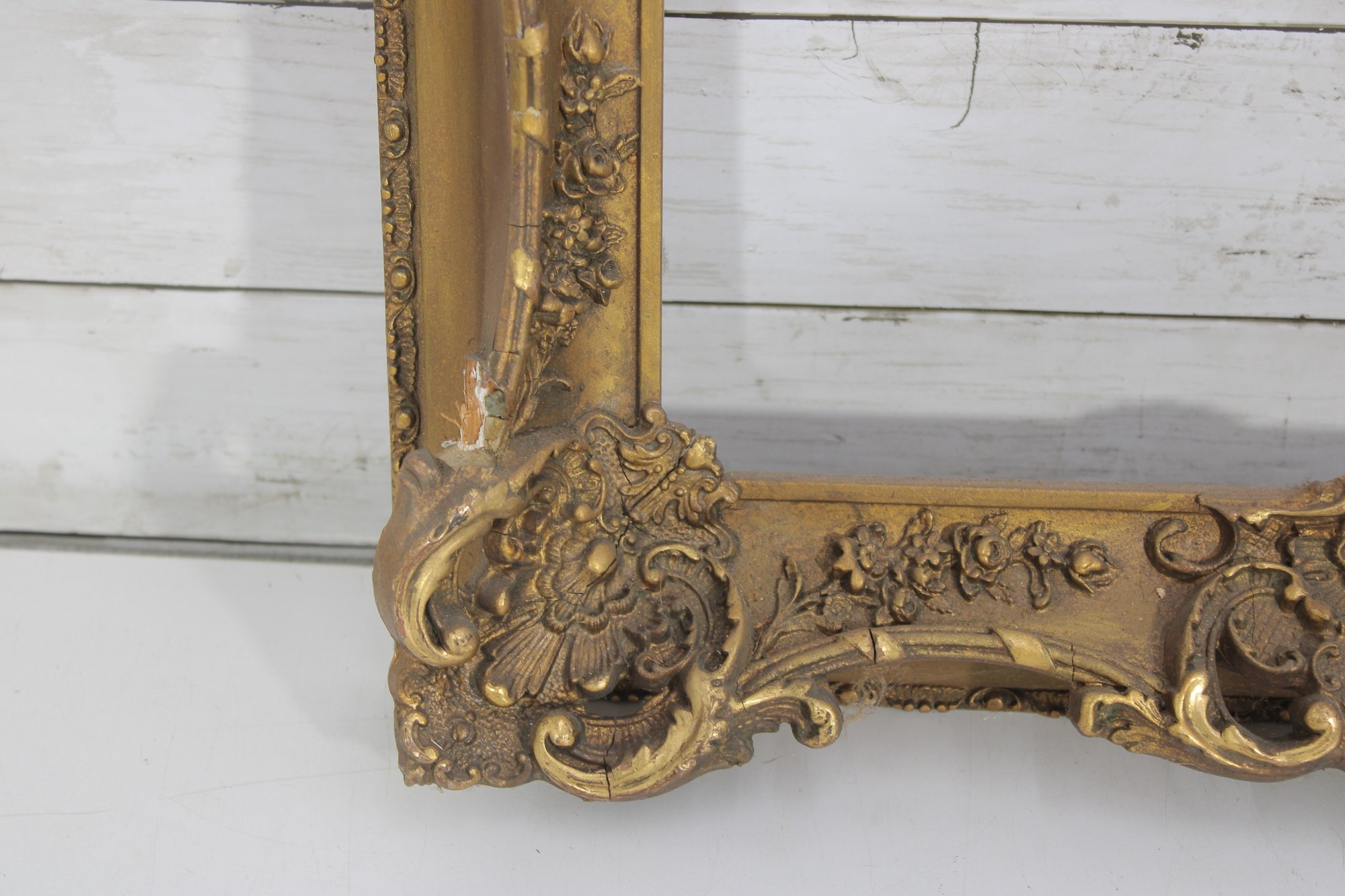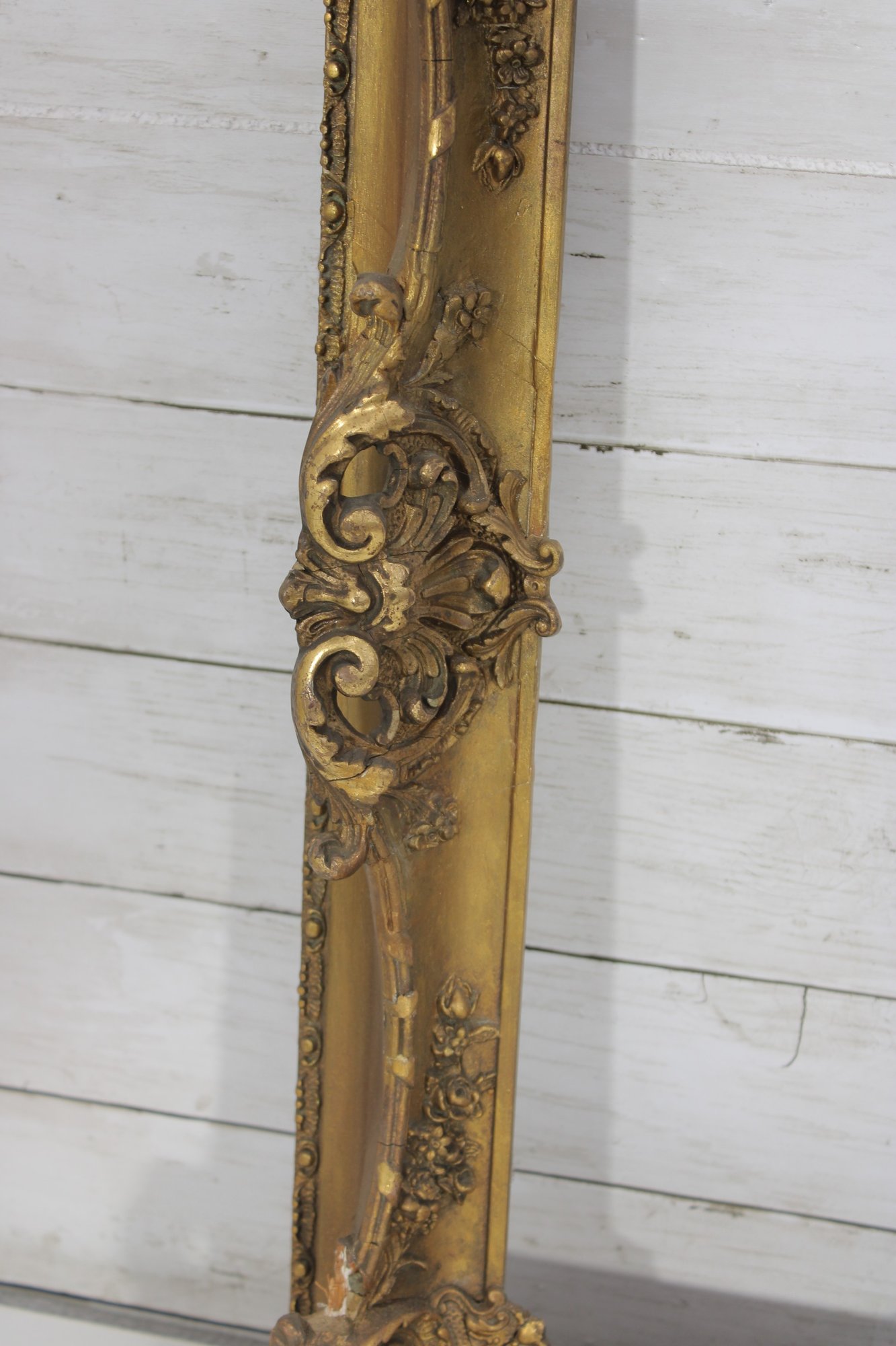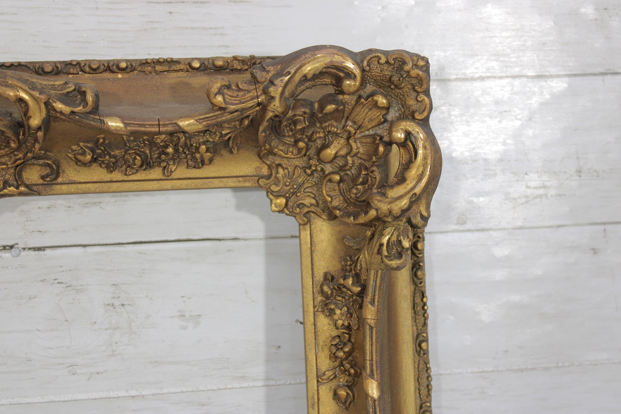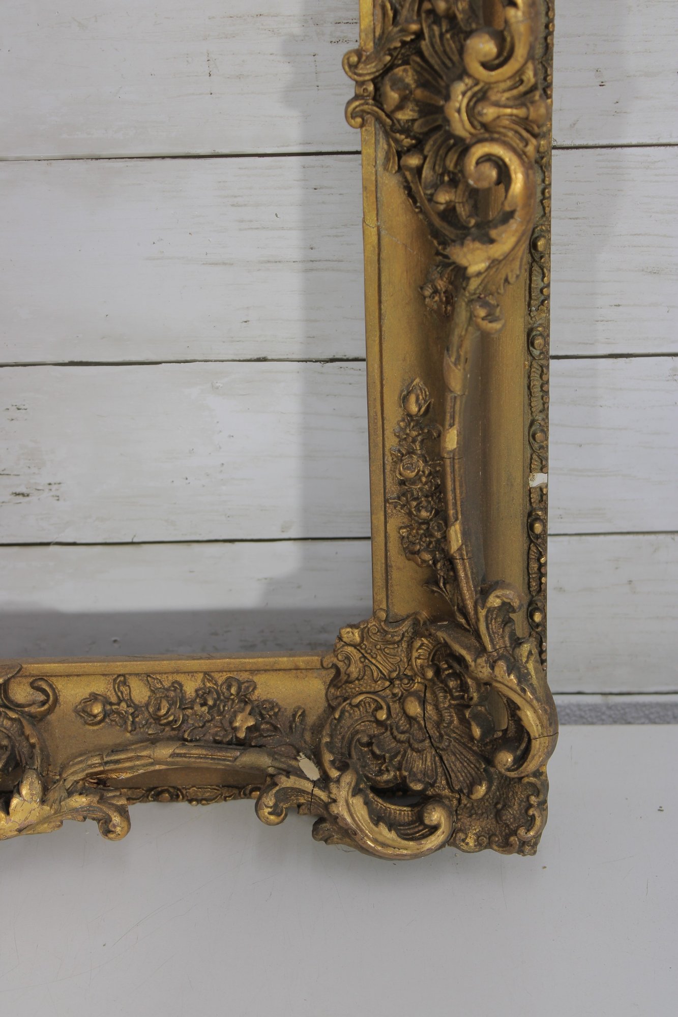 A richly detailed antique gilt wood picture frame in the Baroque–Rococo tradition, featuring lavish scrollwork, floral motifs, and a layered molded profile. The deeply carved ornamentation and original gesso-gilt surface reflect fine period craftsmanship and make this a striking decorative object even without artwork.