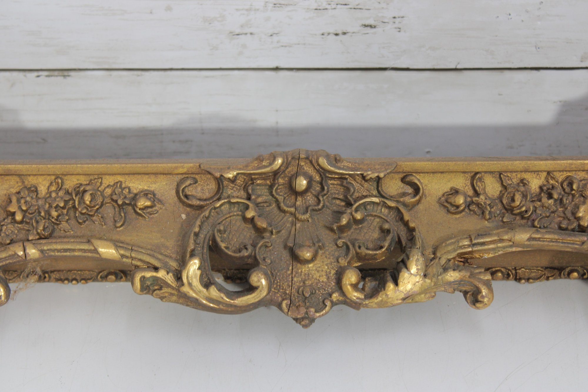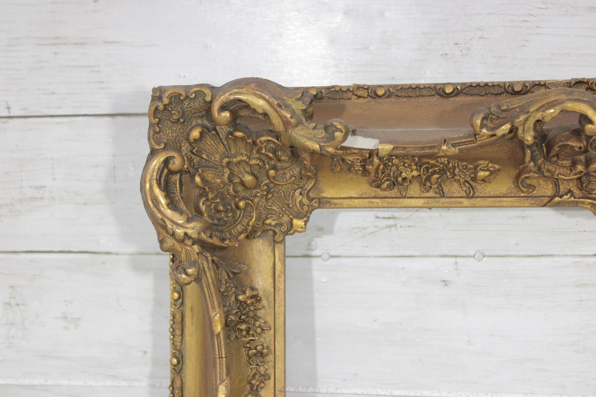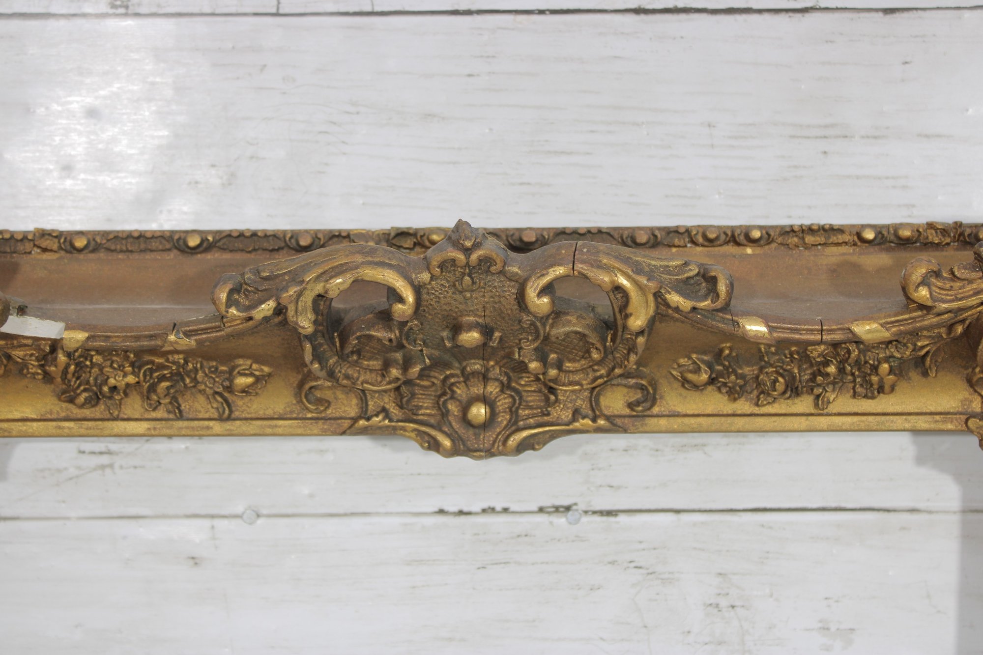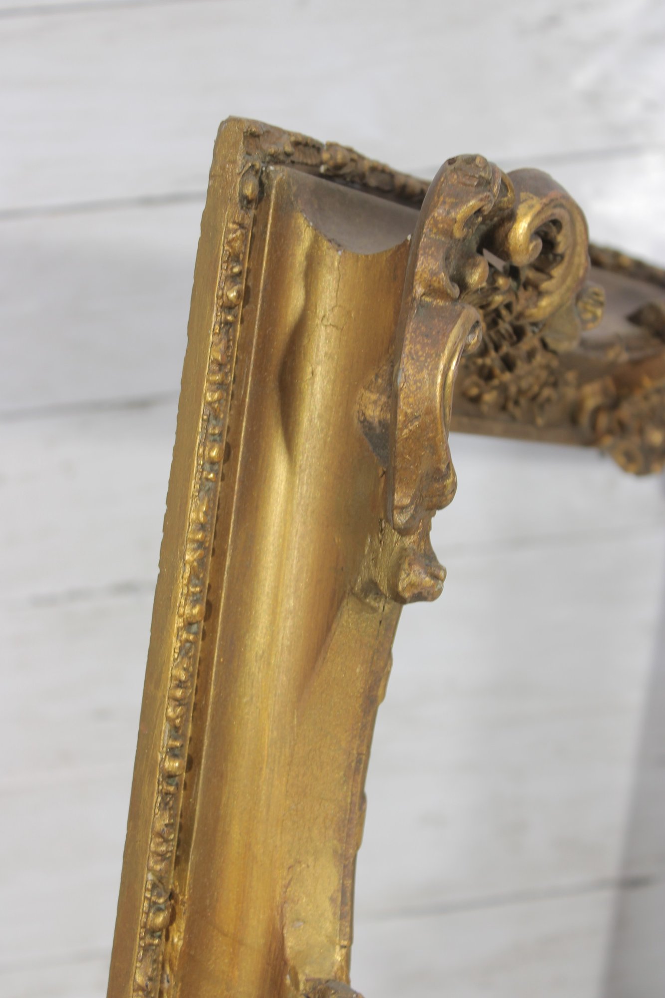 A richly detailed antique gilt wood picture frame in the Baroque–Rococo tradition, featuring lavish scrollwork, floral motifs, and a layered molded profile. The deeply carved ornamentation and original gesso-gilt surface reflect fine period craftsmanship and make this a striking decorative object even without artwork.