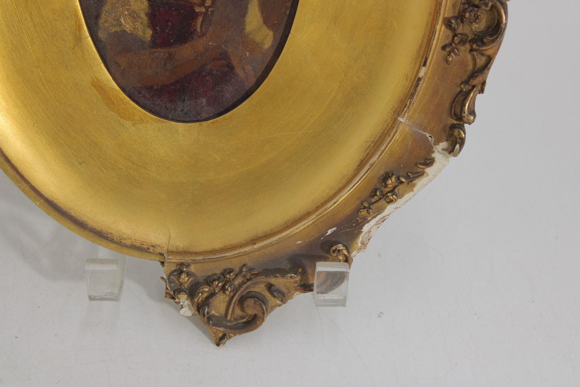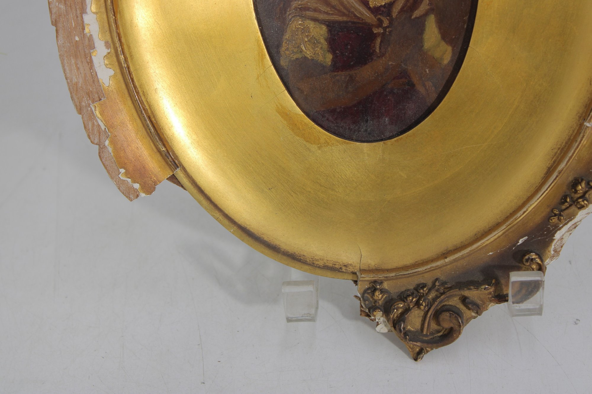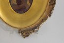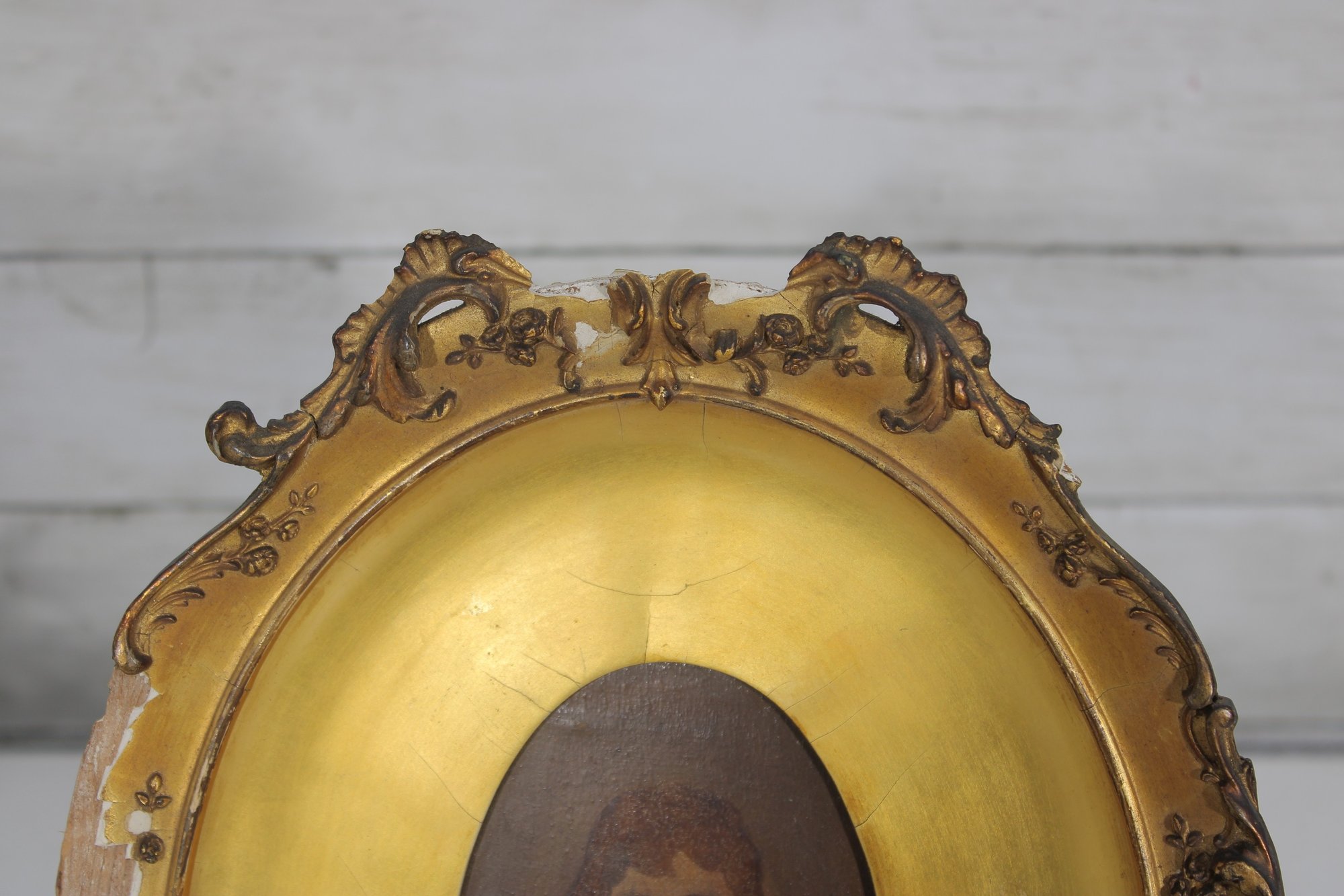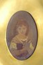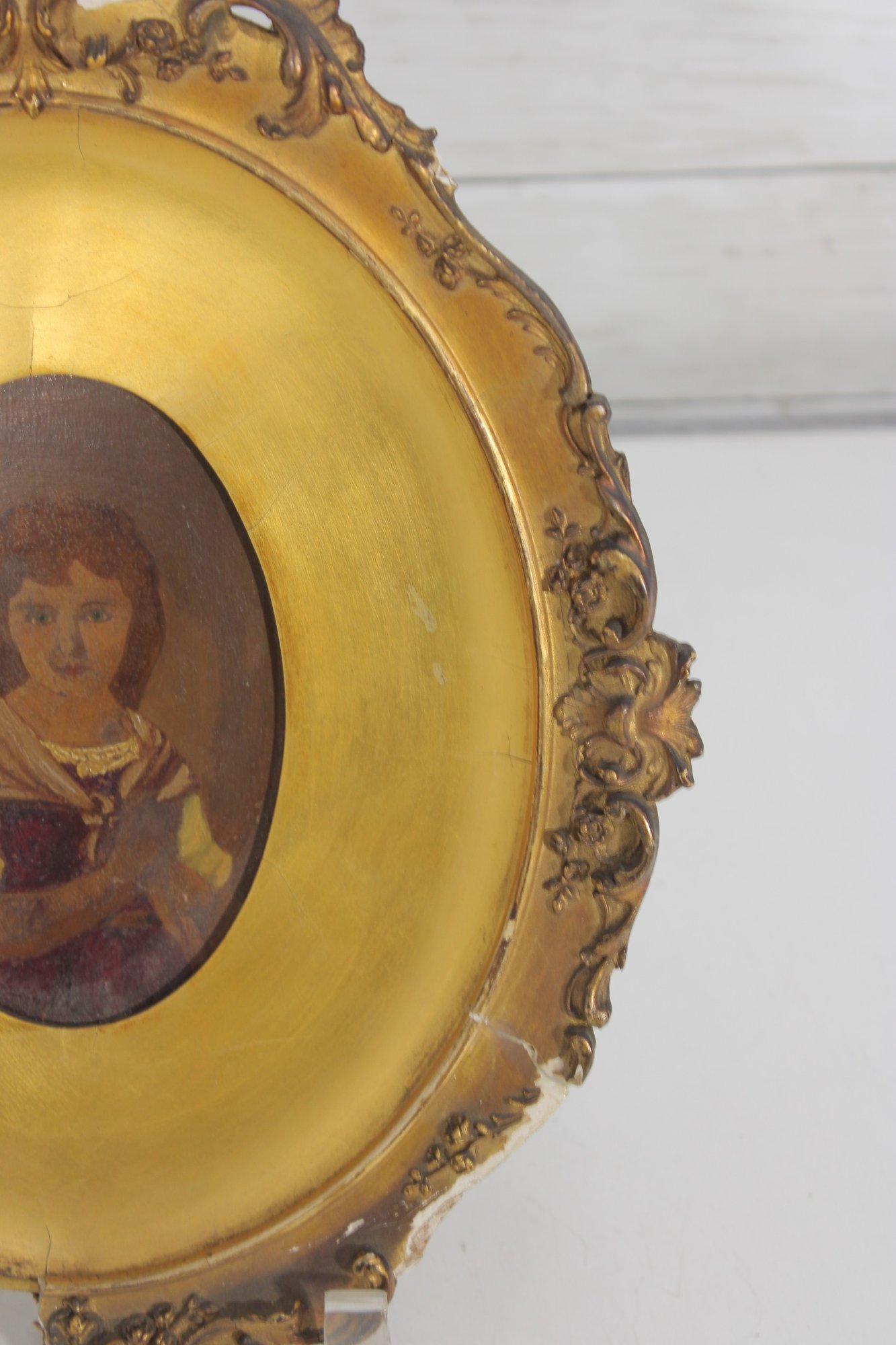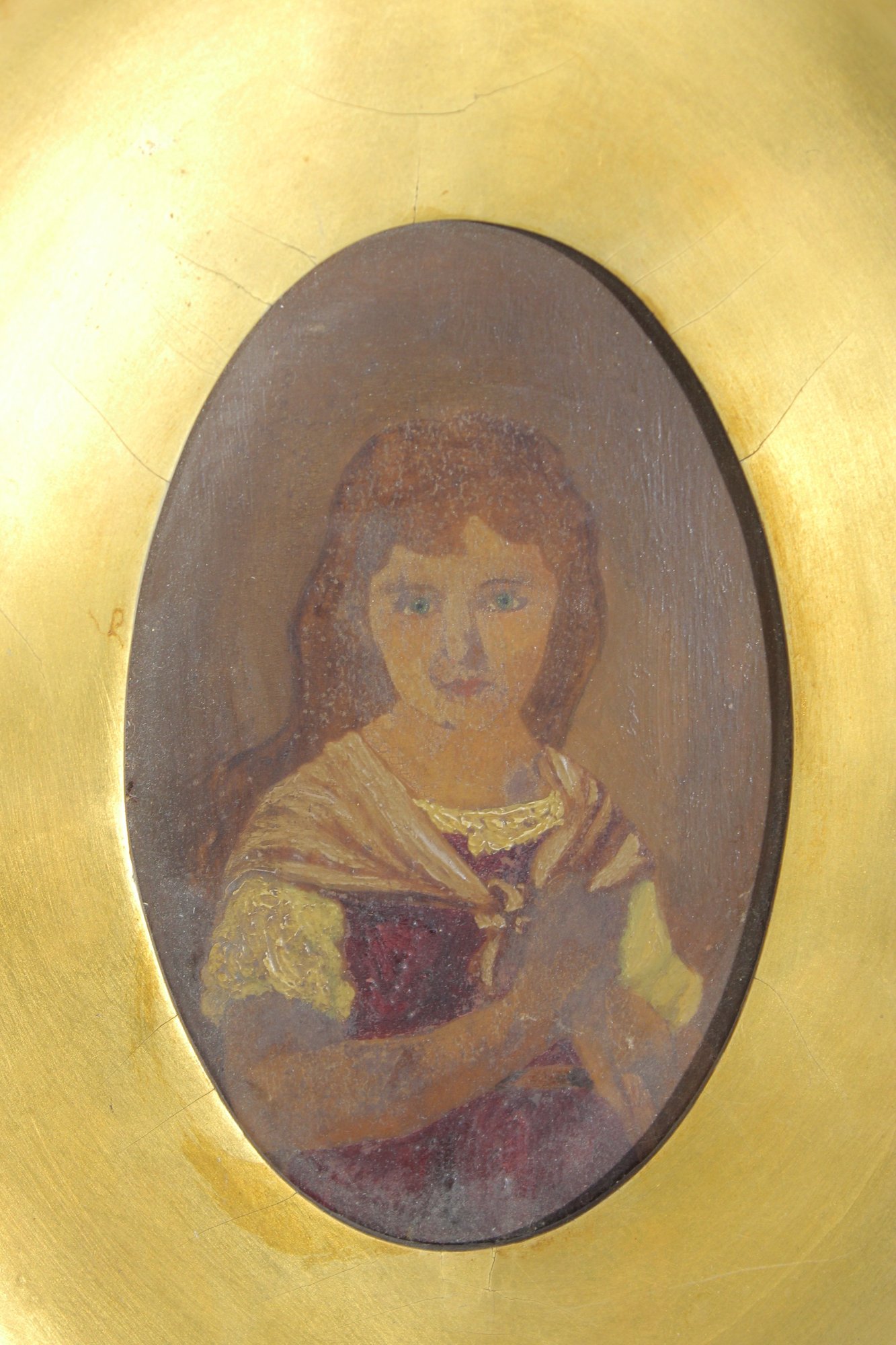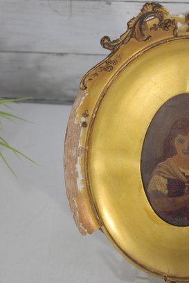 a charming antique oval gilt frame housing a hand-painted portrait of a young child, rendered in a warm, muted palette with soft expression and period styling. The portrait is set behind a gilt surround and enclosed within an ornate oval frame featuring scrolling foliate details and decorative cresting.