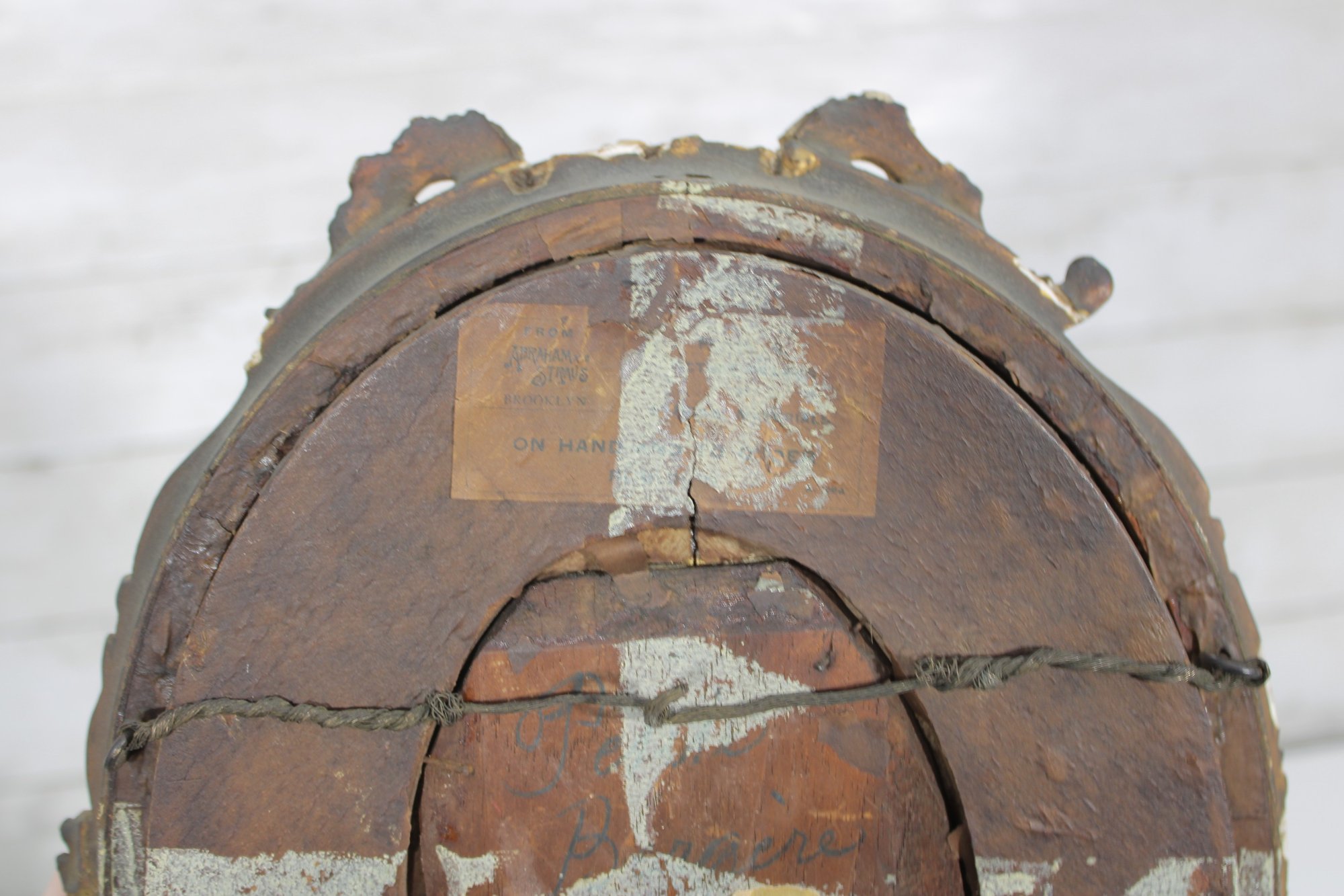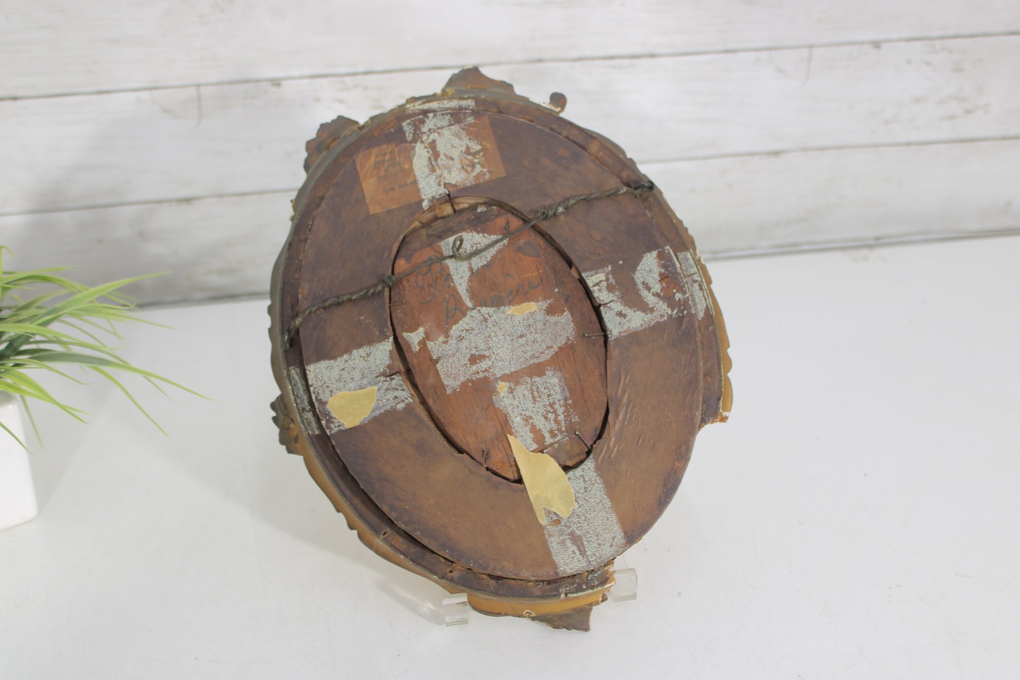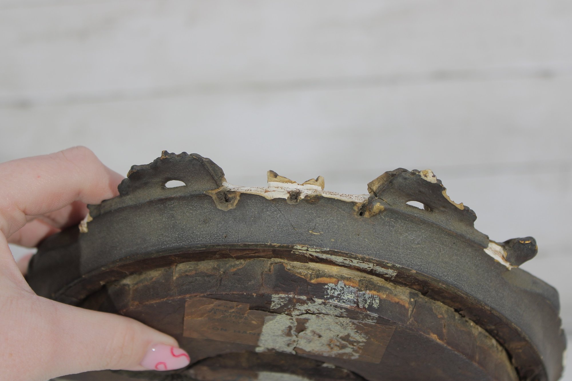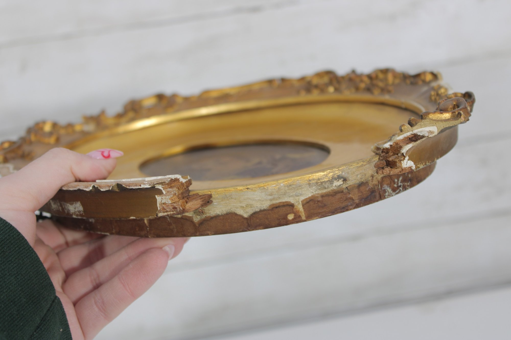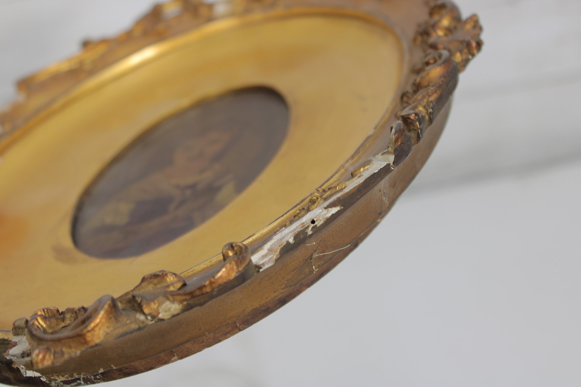 The frame measures approximately 12 inches high by 10 inches wide and retains a rich, aged surface. Losses, wear, and surface distress are present throughout the frame, including chipping, cracking, and areas of gilt loss, consistent with age and long-term display.