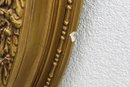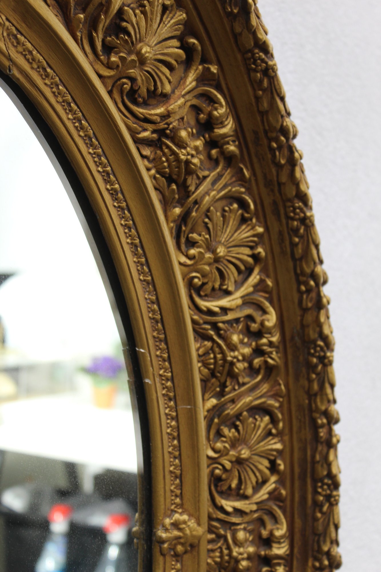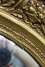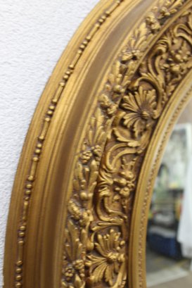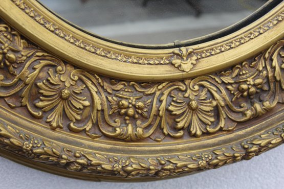 This exquisite antique oval mirror features a richly detailed giltwood frame with intricate floral and scrollwork designs, offering timeless elegance and charm. A stunning centerpiece for any room or collection.