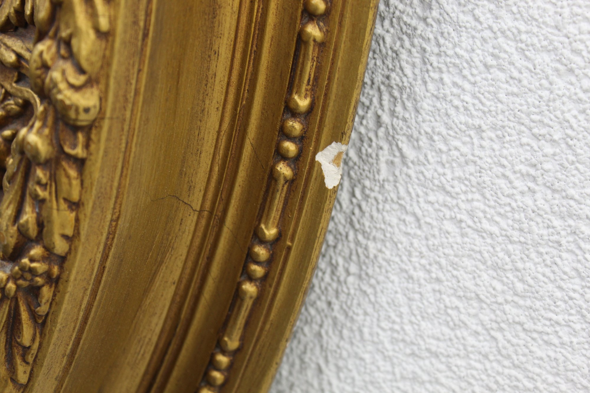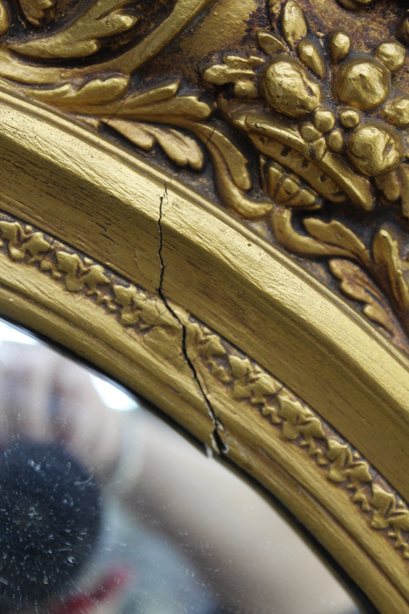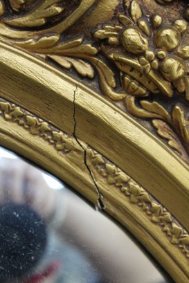 Displays a small crack in the gilding, as shown in the photographs. Otherwise, the frame and mirror are in good vintage condition, with expected wear consistent with age.