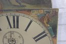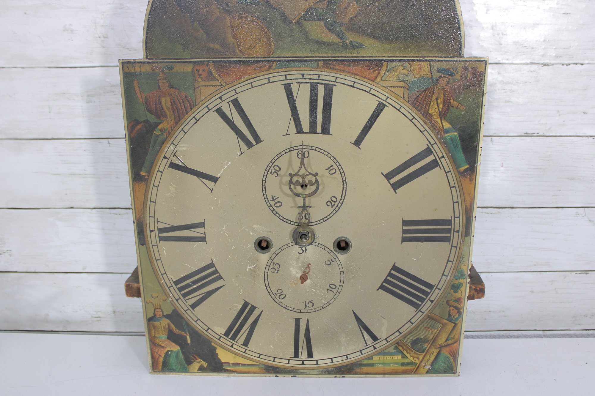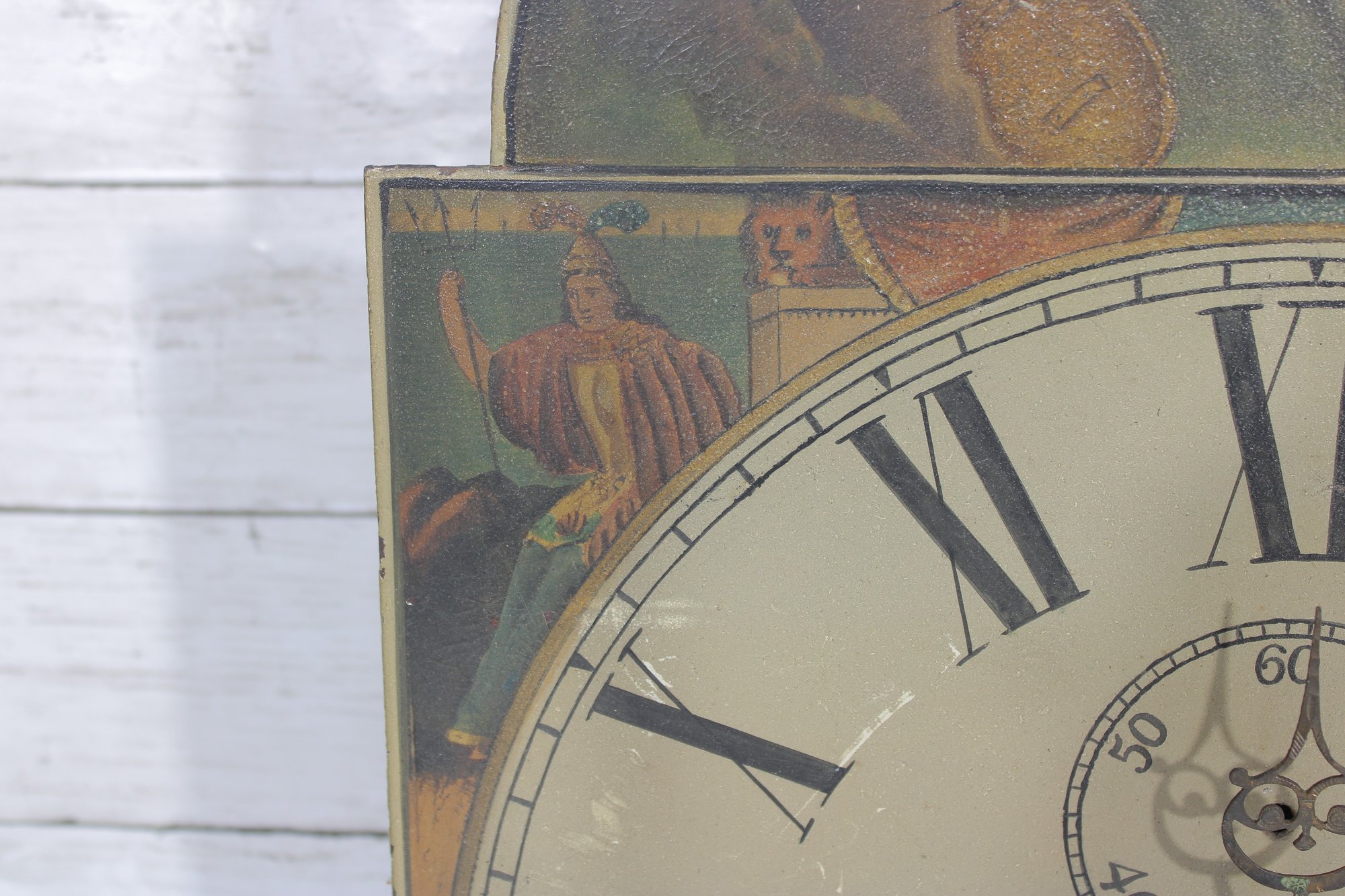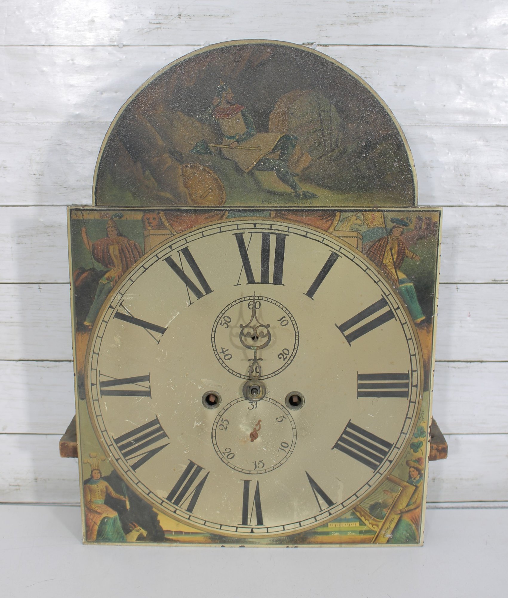antique painted clock dial and crest, richly decorated with allegorical and period figures, Roman numerals, and hand-painted details throughout. The arched crest panel features a classical scene above the square dial, creating a striking folk-art presence that displays beautifully even as a decorative object.