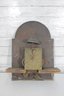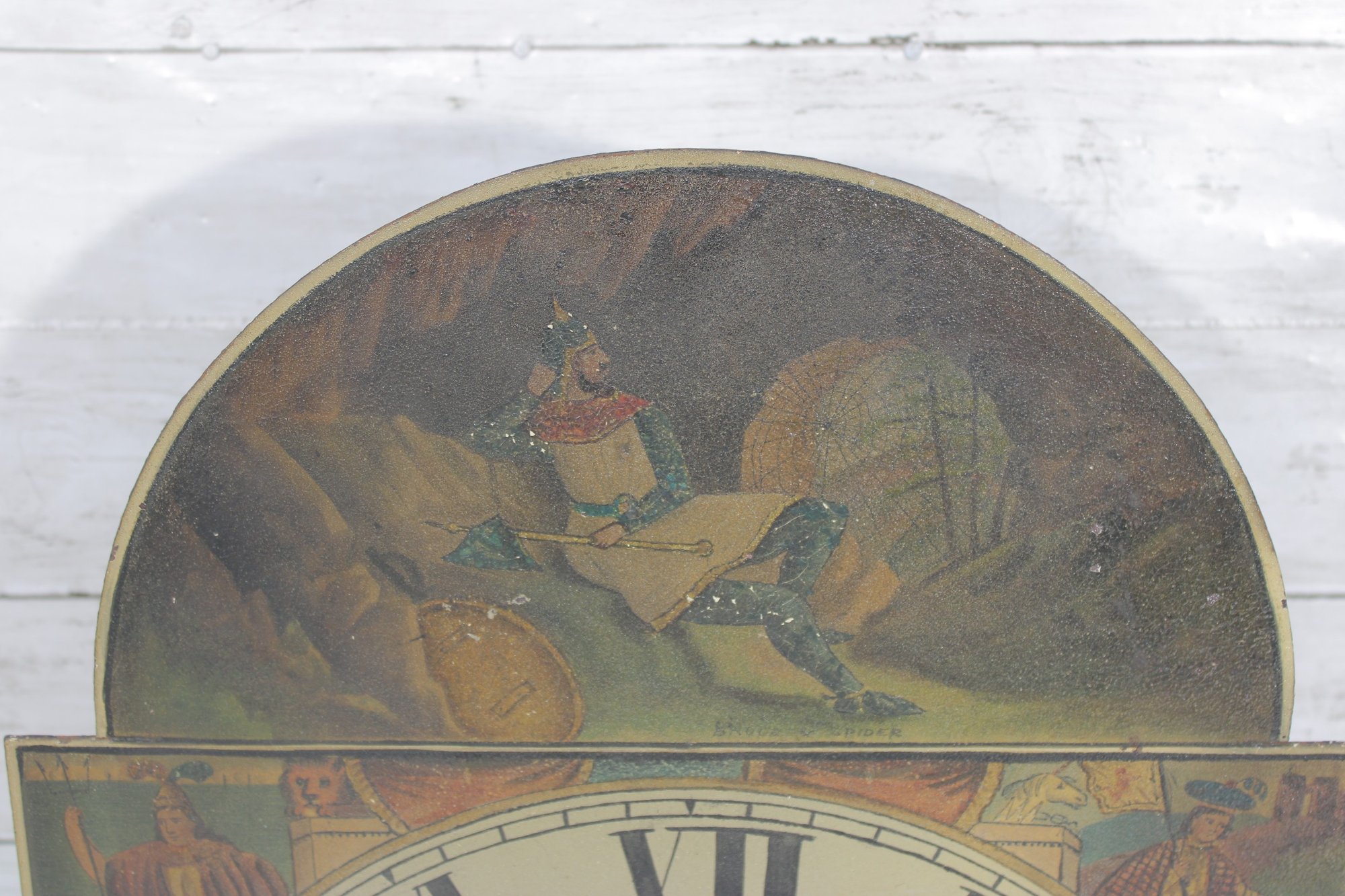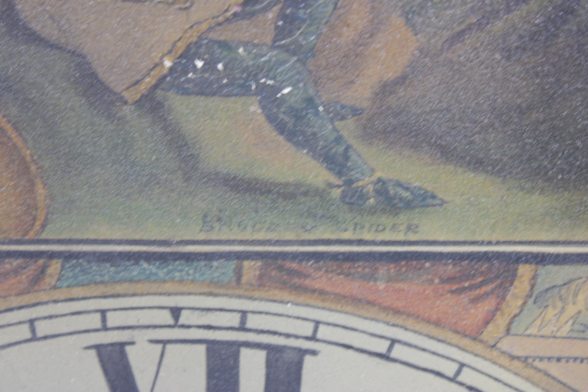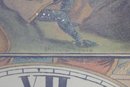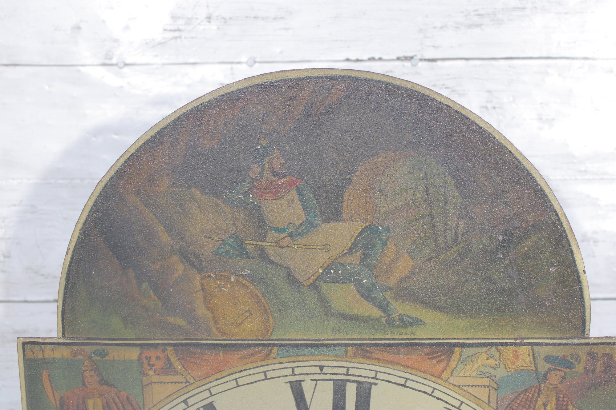antique painted clock dial and crest, richly decorated with allegorical and period figures, Roman numerals, and hand-painted details throughout. The arched crest panel features a classical scene above the square dial, creating a striking folk-art presence that displays beautifully even as a decorative object.