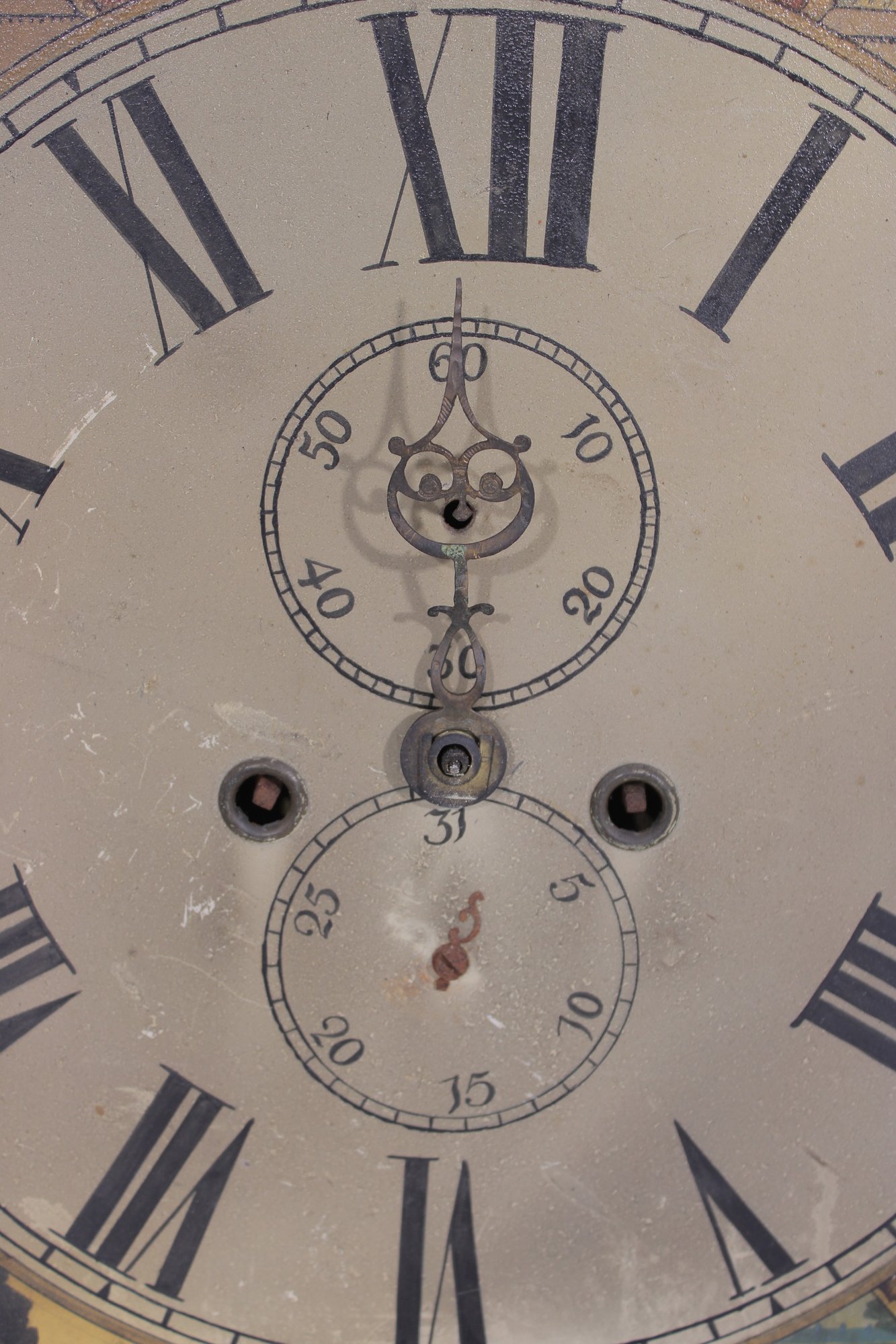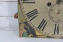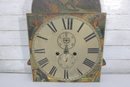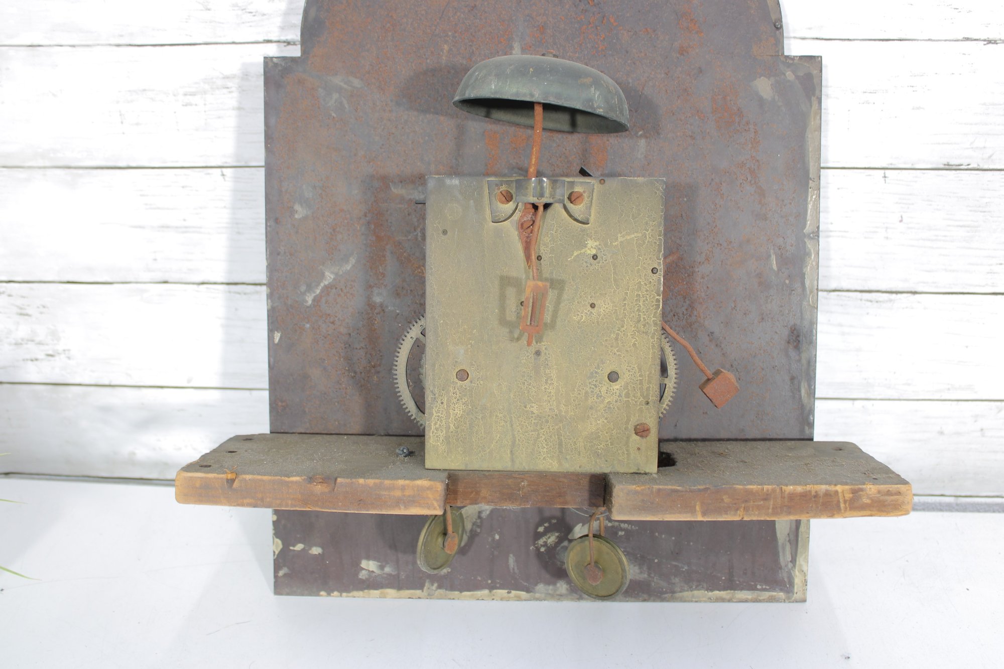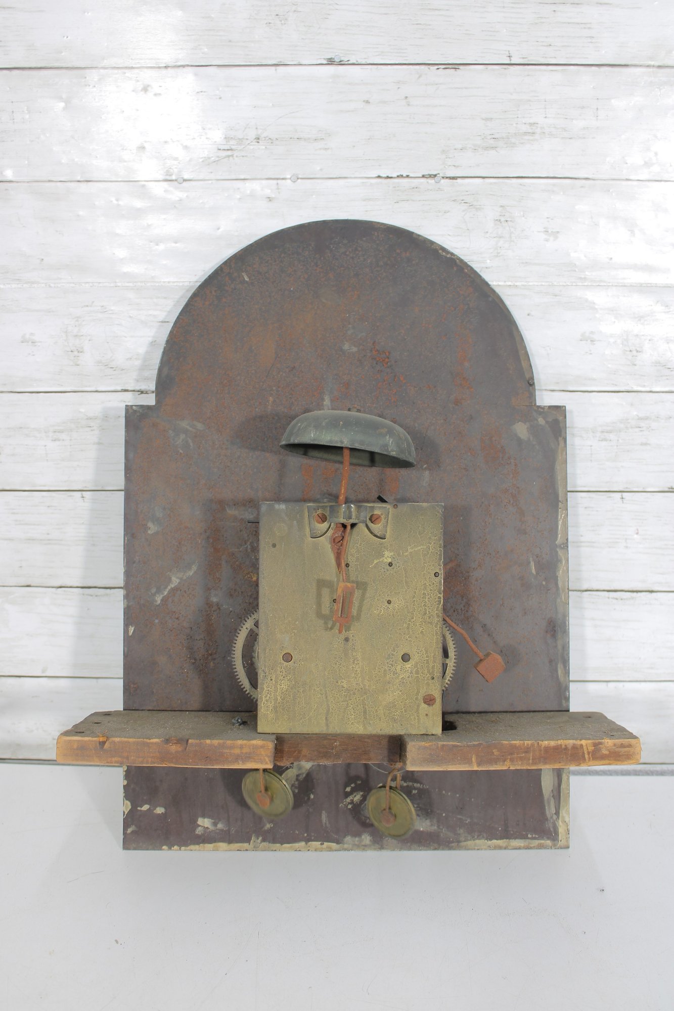 The piece retains its original clock movement and hanging weights (as shown), offering interest for collectors, restorers, or decorators. The painted surfaces show wonderful age and character, with visible brushwork and patina that speak to its history.
