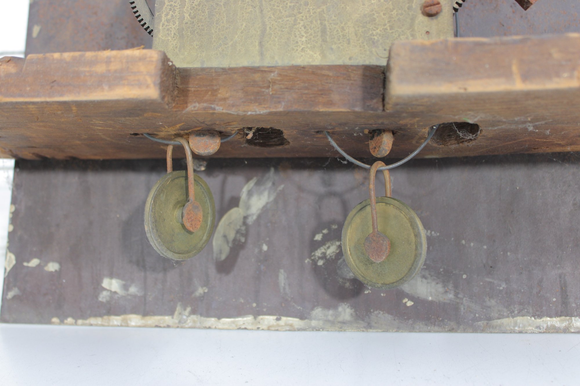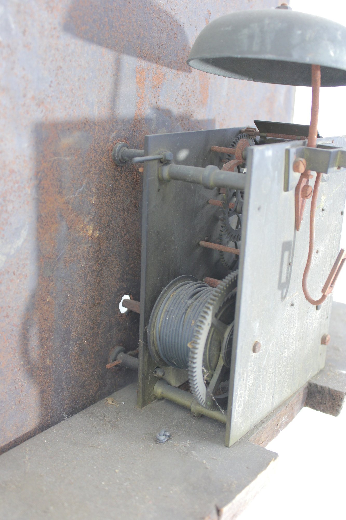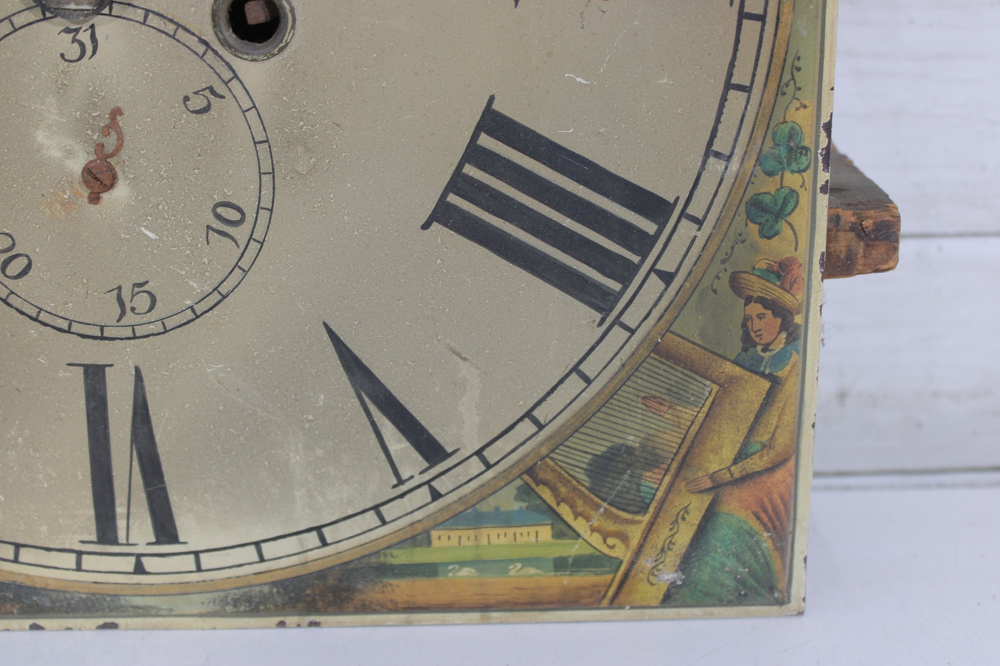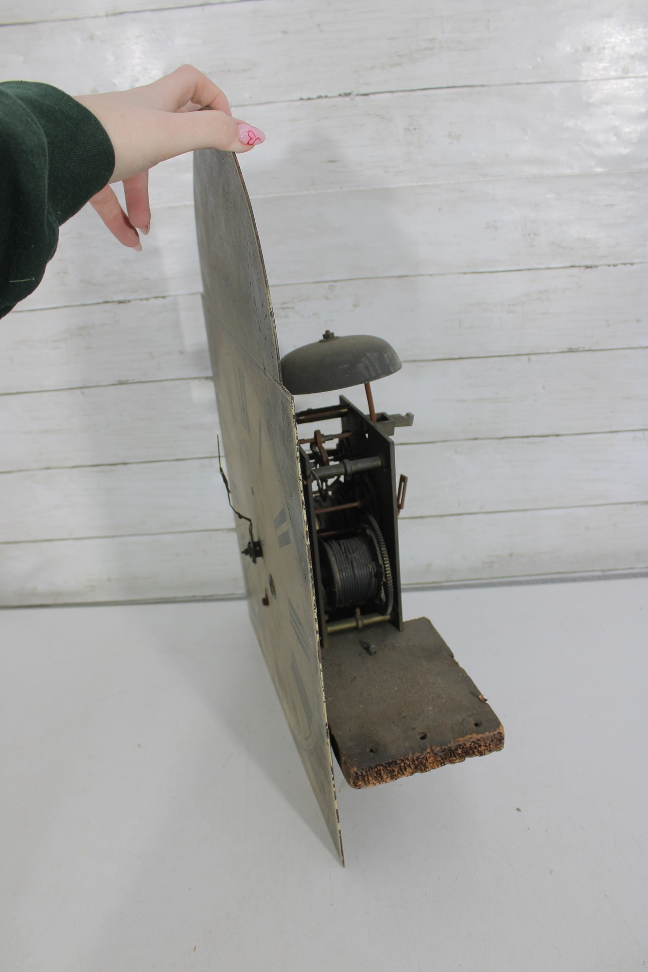 The piece retains its original clock movement and hanging weights (as shown), offering interest for collectors, restorers, or decorators. The painted surfaces show wonderful age and character, with visible brushwork and patina that speak to its history.