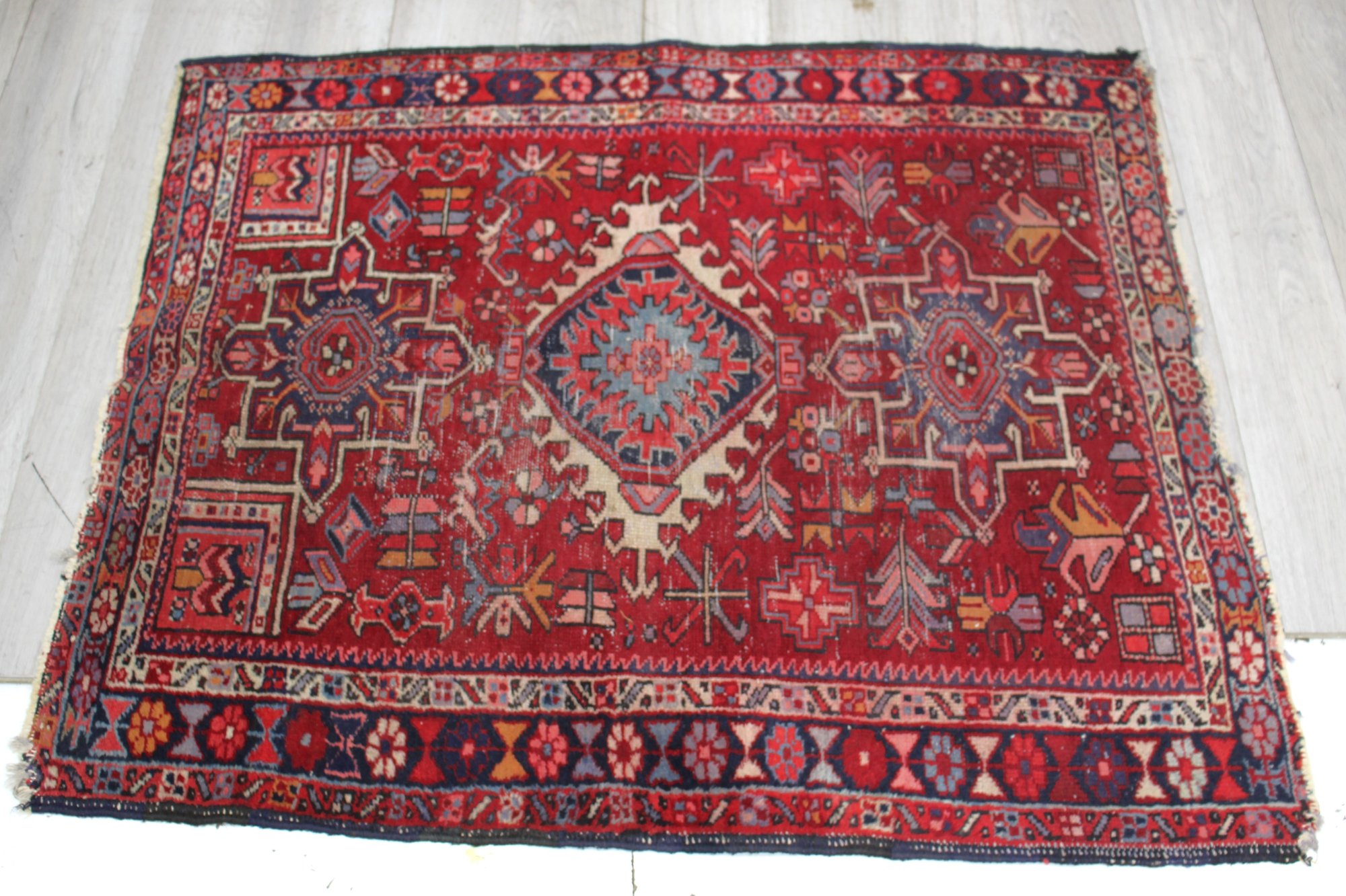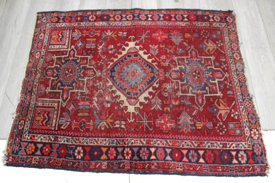 This stunning antique Persian handwoven wool rug features a bold geometric design, rich with vibrant reds, blues, and ivory. The rug’s central medallion is complemented by intricate tribal motifs and a beautifully detailed border, showcasing traditional Persian craftsmanship.