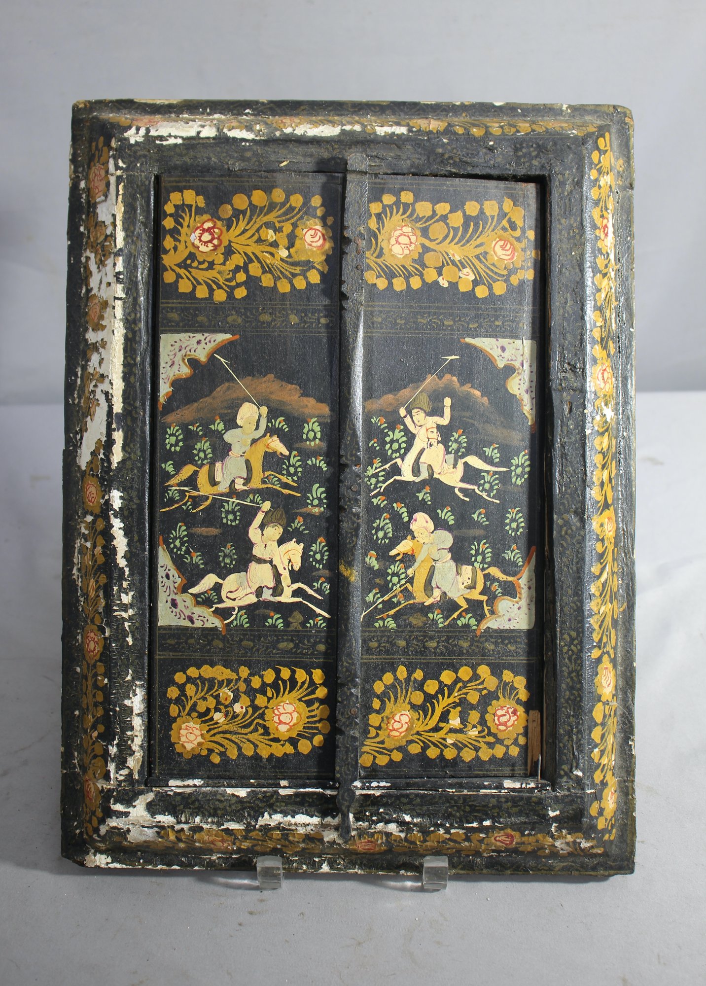 this unique and charming antique Persian mirror, featuring hand-painted folk art panels. This beautifully crafted piece is an exquisite example of traditional Persian art, and its rustic appearance brings a touch of authenticity and history to any collection.