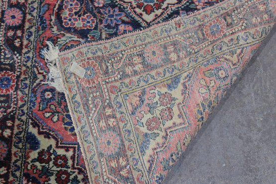 This charming rug features a classic central medallion surrounded by intricate floral and scrolling vine motifs. The rich navy field is complemented by shades of coral, soft pink, cream, and light blue, creating a vibrant yet traditional palette. A detailed multi-band border frames the design, enhancing its timeless appeal.