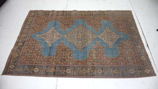This antique Persian rug, measuring 75" x 51", is a magnificent representation of classic Persian design with its striking blue medallion center and intricate floral border. It is perfect for enhancing any room with its timeless elegance and artistry.