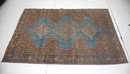 Subtle blue, beige, and rust tones with intricate accents.
