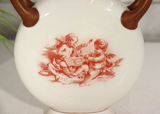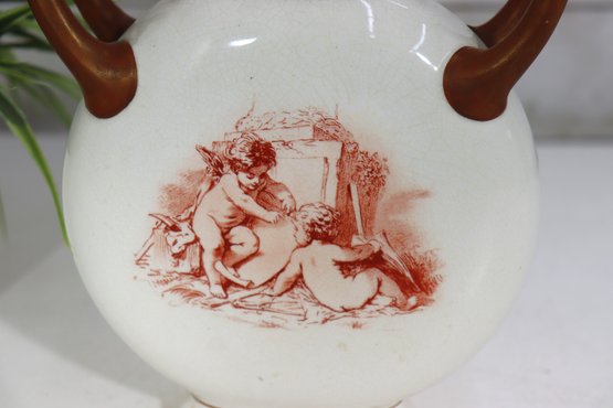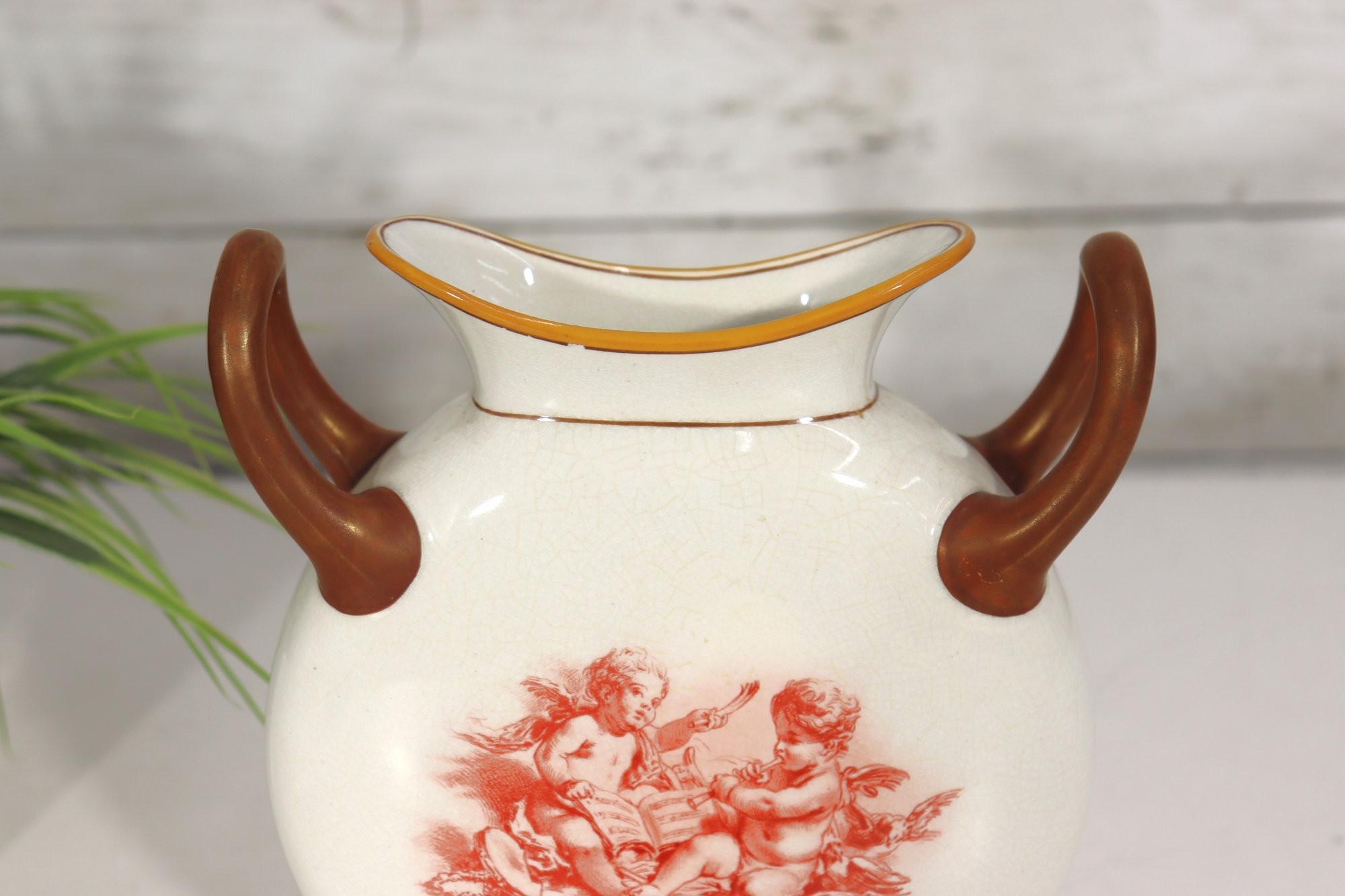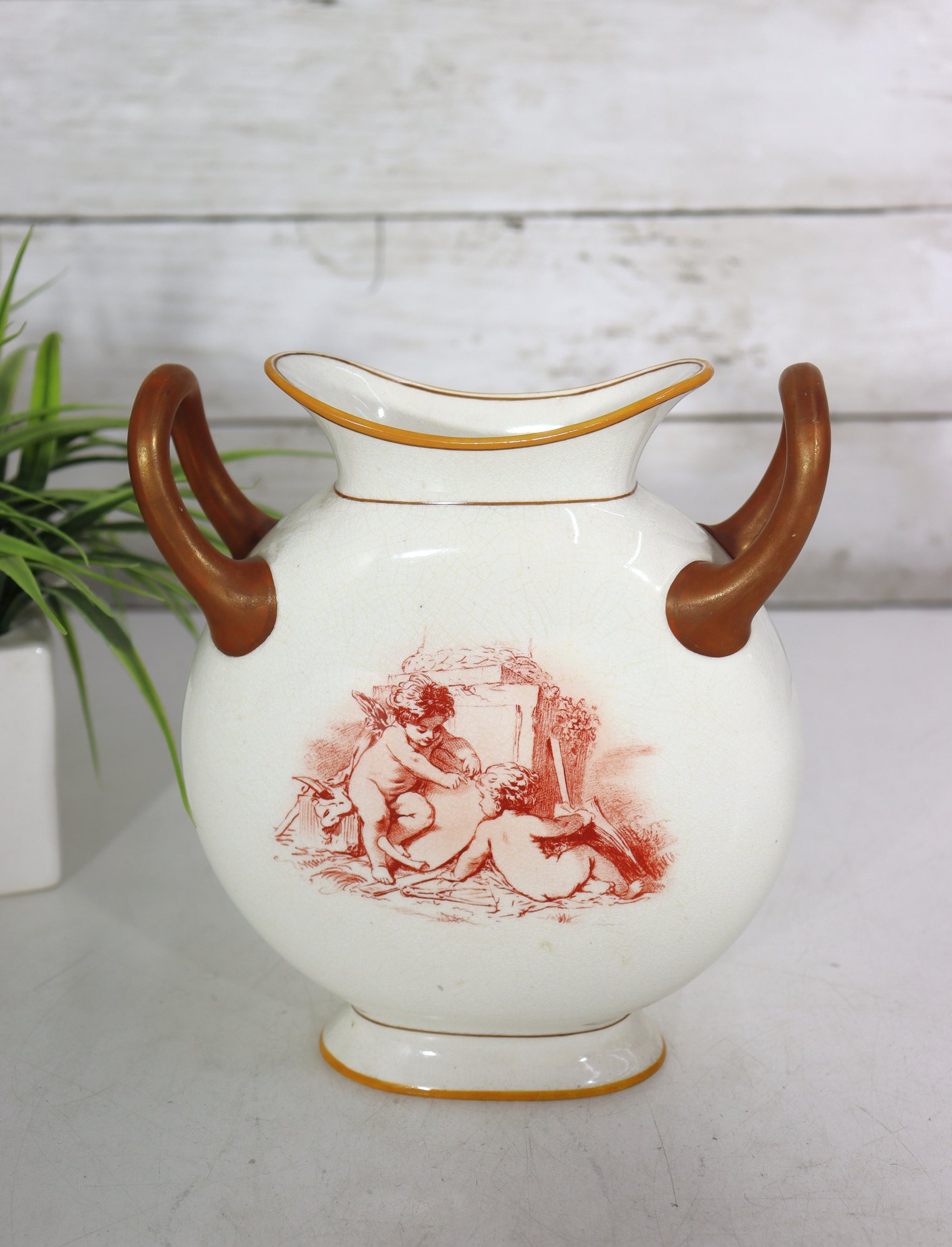 porcelain vase featuring a charming cherub (putti) transfer scene in warm rust/red tones. This beautifully balanced piece stands approximately 8 inches tall and showcases a classic urn-form silhouette with double applied handles in a contrasting brown glaze and gold trim accents along the rim and base.
